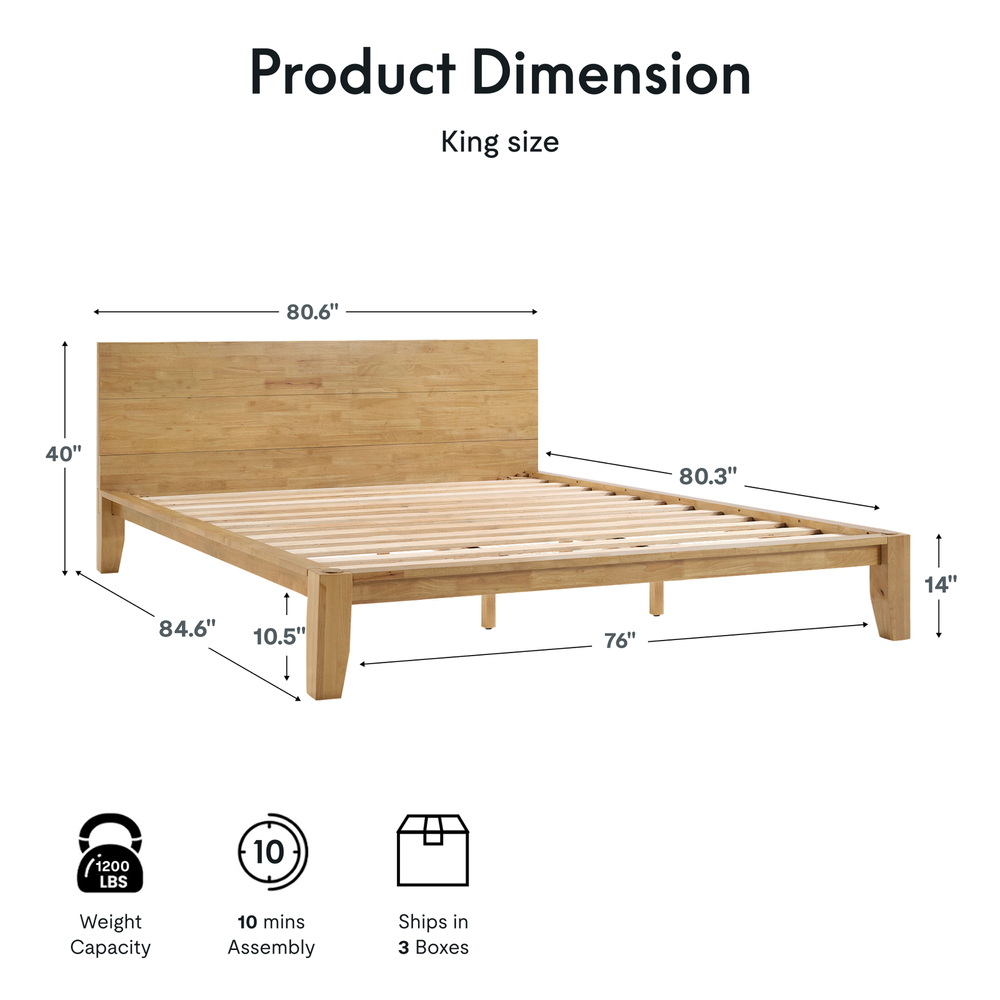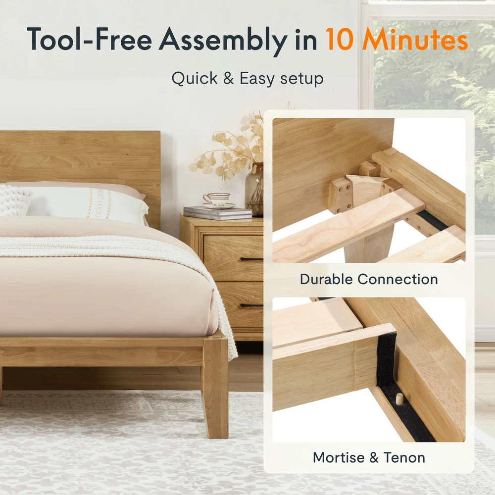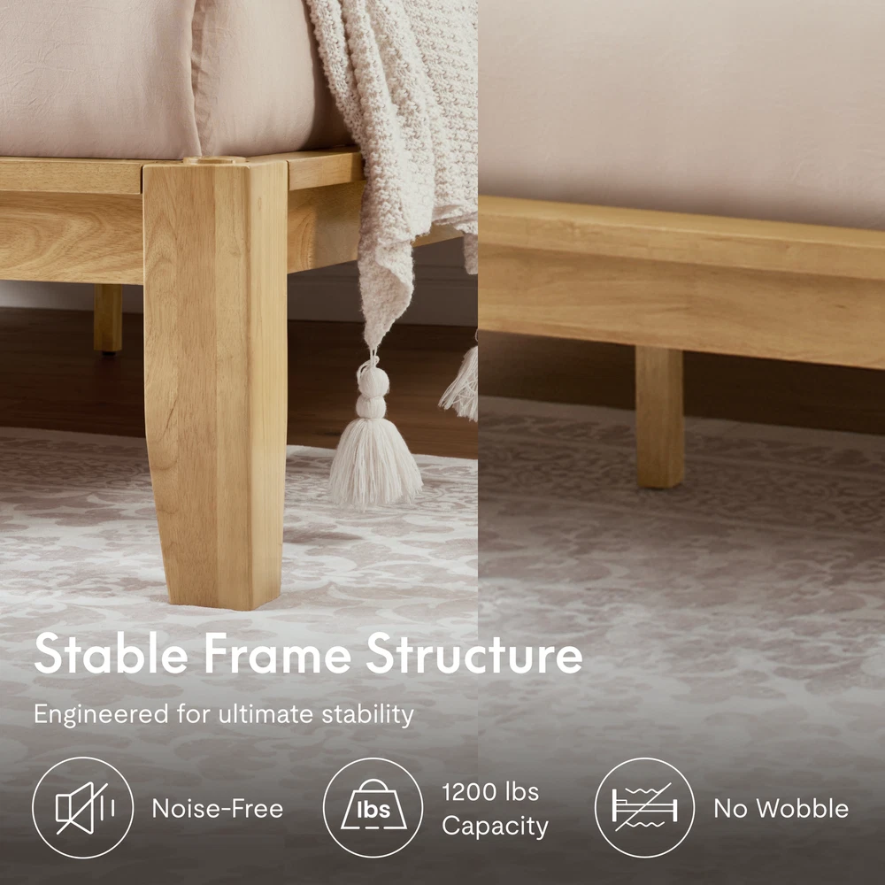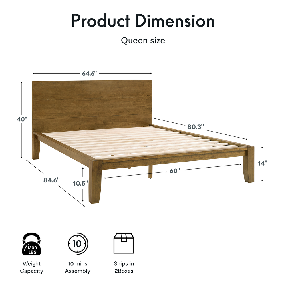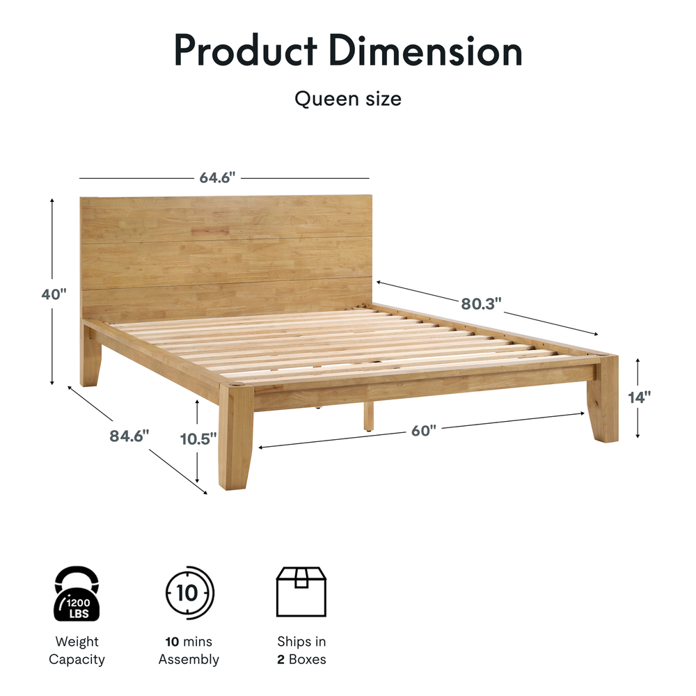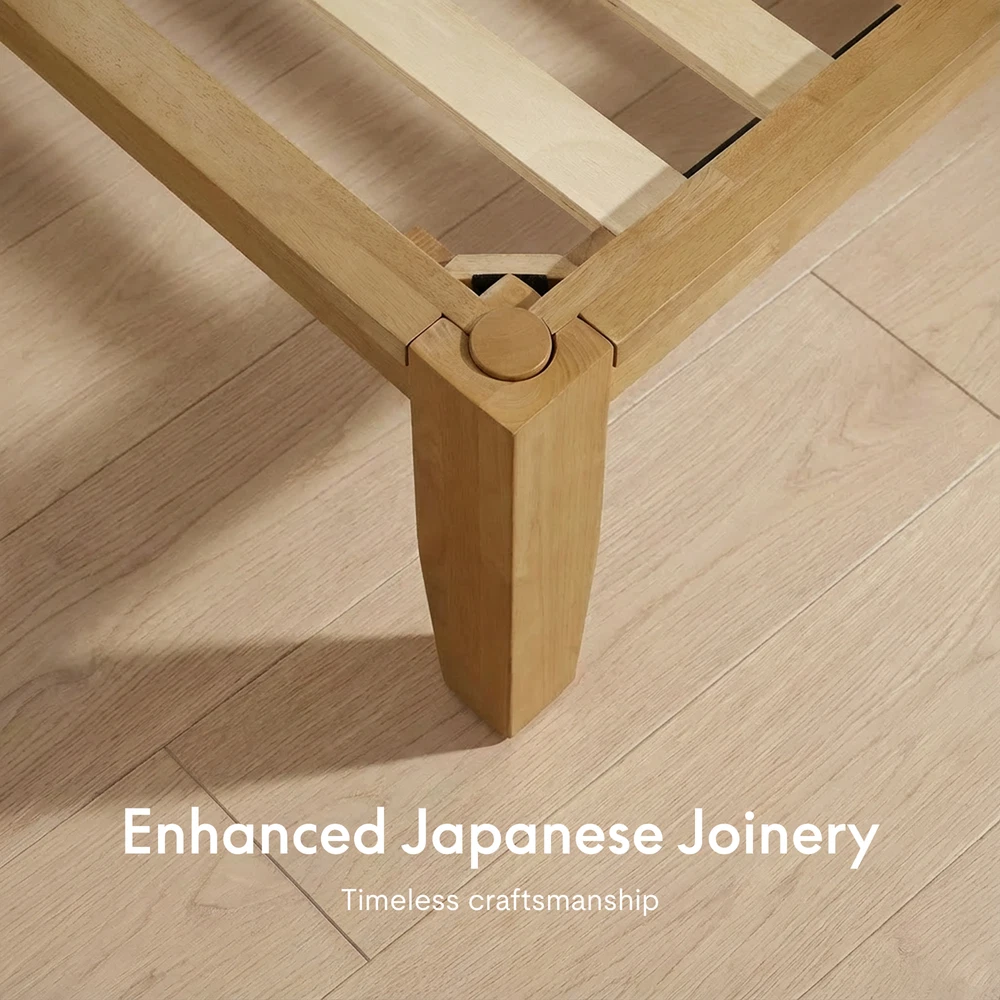 Home Payment Shipping Return Policy About Us Contact Us Feedback Title Other Standing Desk Desk Riser & Desk Converters Desk Bike Ergonomic Office Chair Fitness FLEXISPOT Massage Zero Clearance Adjustable Bed Frame Base with Wireless Remote FlexiSpot solid wood platform bed frame features traditional Japanese mortise-and-tenon joinery for strong, stable support with fast, tool-free assembly in as little as 10 minutes. Crafted from durable solid wood with a moisture-resistant, eco-friendly finish, it offers a quiet, wobble-free design with up to 1200 lbs weight capacity. The hidden headboard shelf keeps essentials organized, while built-in USB-A and USB-C charging ports add everyday convenience. With 10.5” under-bed storage clearance and a clean, timeless look, this wooden bed frame fits seamlessly into modern, farmhouse, or traditional bedrooms. Built with Japanese Joinery Traditional mortise-and-tenon Japanese joinery creates a strong, stable platform bed frame while allowing fast, tool-free assembly in as little as 10 minutes. Easy to disassemble and reassemble for moving or room changes. Integrated USB Charging Headboard The built-in USB charging ports in the headboard keep phones, tablets, and other devices powered overnight. Cords stay neatly hidden, with everything you need within arm’s reach. Under-Bed & Hidden Storage Space Maximize storage with generous under-bed clearance plus a concealed headboard shelf, perfect for books, glasses, or daily essentials—keeping your bedroom organized and clutter-free. Premium Solid Wood Construction Crafted from durable solid wood with an eco-friendly finish that resists moisture and mold. This solid wood platform bed offers long-lasting beauty that fits modern, minimalist, or traditional bedrooms. Quiet, Stable & No Box Spring Needed Strong wooden slats and reinforced center support legs reduce motion, prevent wobbling, and eliminate squeaks—providing quiet, restful sleep. No box spring required. Timeless Japanese-Inspired Bedroom Style Warm natural wood tones and clean lines create a refined, calming look. This Japanese-style platform bed frame serves as a stylish centerpiece for any bedroom. Specifications: Color: Maple/Walnut Weight Capacity: 1200 lbs Interior Width: 60'' W/76''W Overall Width: 64.6'' W/80.6''W Interior Length: 80.3'' L/80.3''L Overall Length: 84.6'' L/84.6''L Overall Product Weight: 83.78 lbs/92.59 lbs Leg Height - Top to Bottom: 14'' H Clearance - Floor to Bottom: 10.5'' H Product Type: Bed Frame Central Support Leg: Yes Material: Solid Wood Mattress Included: No Wood Species: Oak Assembly Required: Yes(Tool Free Assembly) Product Warranty: Yes