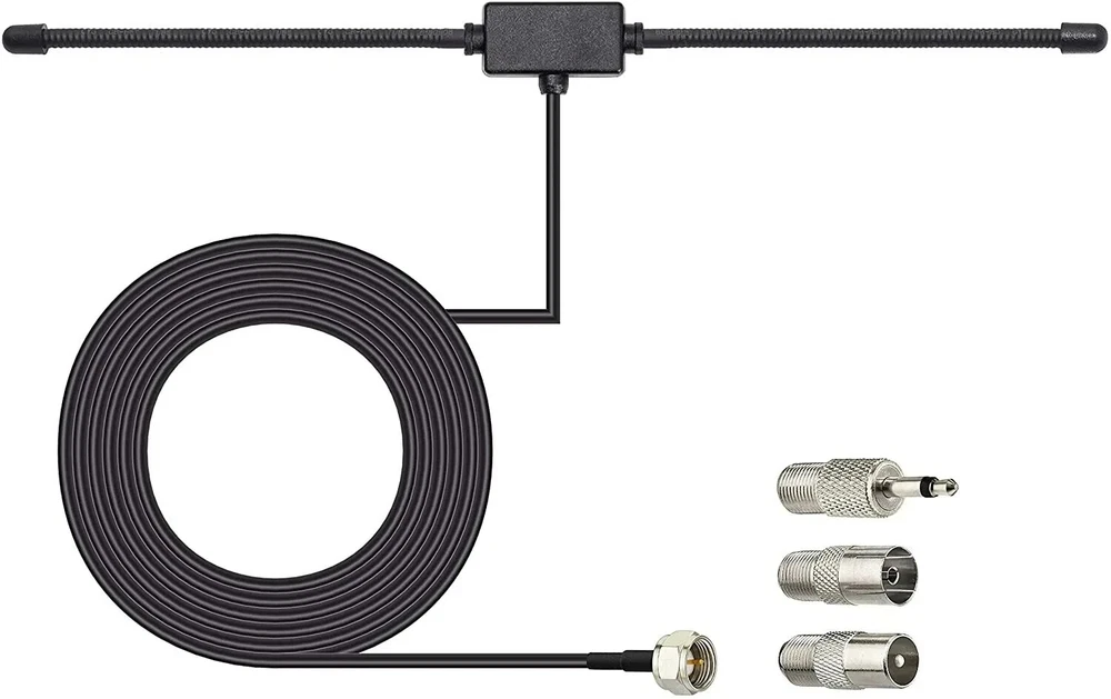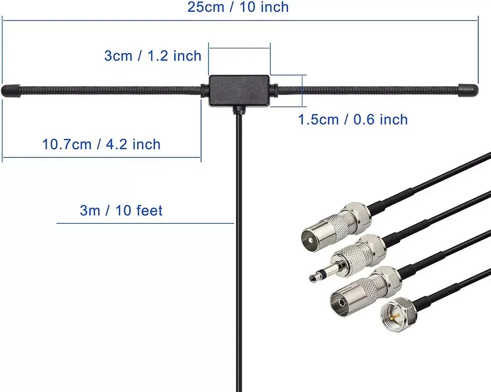 FM Radio Dipole Antenna for Stereo Receiver Indoor Pioneer Bose Yamaha Marantz products details Adhesive Mounting FM Radio Antenna 75 Ohm UNBAL FM Dipole Antenna with Universal Connector and Adapter,for Music System Indoor Radio Bluetooth Stereo Receiver AV Audio video Home Theater Receiver Tuner. Compatible with Yamaha, JVC, Sherwood, Pioneer, Panasonic, Onkyo, Sony, Bose Indoor Sound Radio Home Stereo Audio video Receiver, 75 ohm UNBAL. 10 feet / 3m Coaxial Extension Cable, Antenna Connector Interface: F Type Plug Connector; Included Connector Adapter: TV Female Socket Connector Adapter, 3.5mm Audio Plug Connector Adapter, TV Male Plug Connector Adapter; Easy to install; Adhesive Wall Mounting, Improves FM Radio Stereo Reception; Package List: 1 x Antenna, 3 x Connector Adapters;(As the Picture Shown)