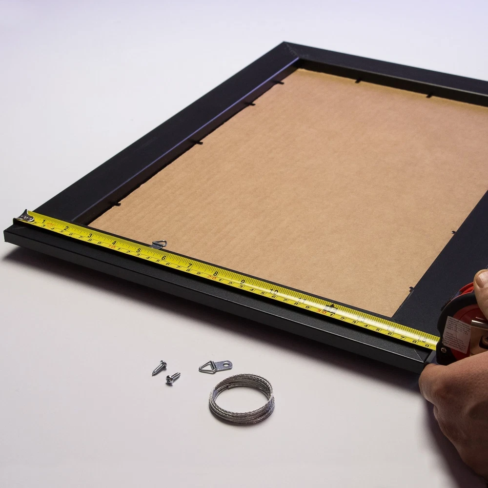 Traditional style; dark walnut brown; distressed wood grain appearance; smooth laminate wrap finish Frame includes: clear acrylic facing, rigid cardboard backing and wire hanging hardware kit (some assembly required) Frame holds a 14 inch by 18 inch photo/print/poster (viewable area reduced by .25" on each side due to frame lip) Frame moulding is 2 inches wide; MDF wood composite Frame is designed for WALL HANGING only (hanging hardware allows for portrait or landscape orientation)