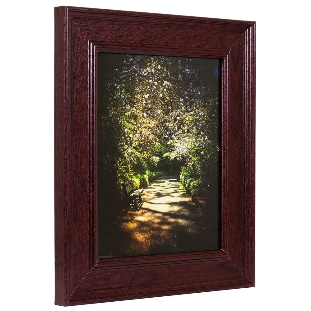 Contemporary style; burgundy red with dark undertones; smooth wrap finish Frame includes: acrylic facing, cardboard backing and wire hanging kit (some assembly required) Frame holds a 14 inch by 20 inch photo/print/poster (viewable area reduced by .25" on each side due to frame lip) Frame moulding is 2 inches wide; MDF wood composite; laminate wrap finish Frame is designed for WALL HANGING only (hanging hardware allows for portrait or landscape orientation)
