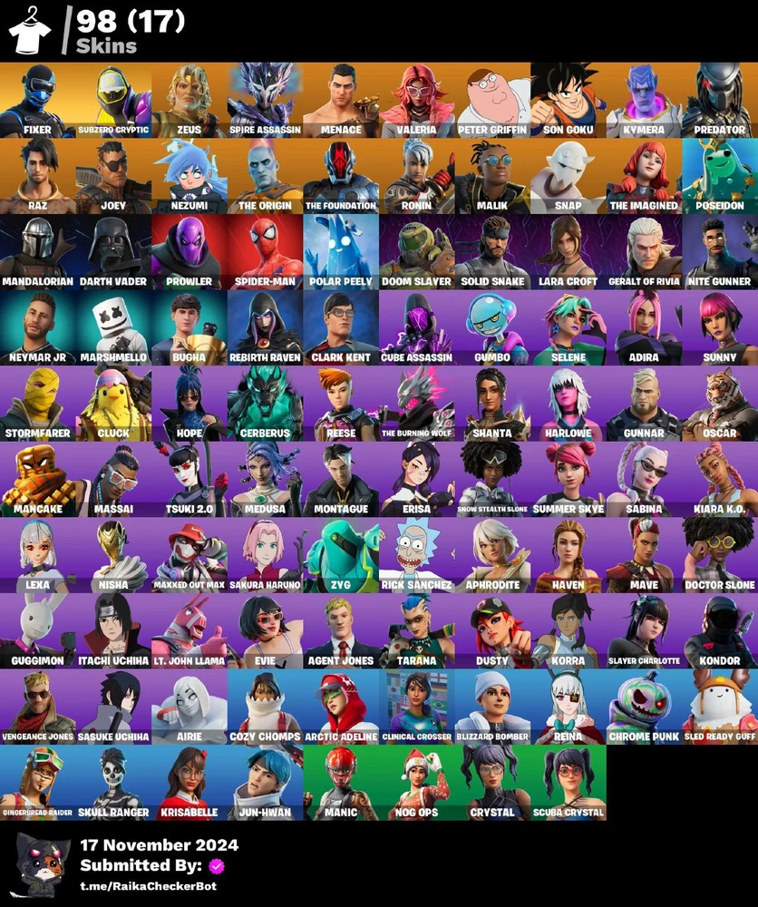 🎮FN Lara Croft, Neymar JR, Nezumi, Darth Vader, Rebith Raven, Son Goku 98 Skin✅