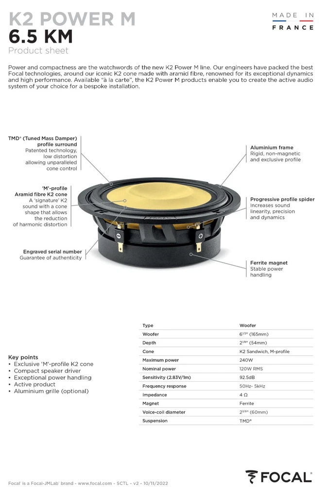 Aperti dal lunedi al venerdi 08.30 - 13.00 > 15.30 - 19.00 e il sabato orario 08.30 - 13.00 Spedizione con corriere espresso, pacco tracciato in Italia e all'estero Assistenza esperta e verifica compatibilità ricambi con il vostro veicolo Ampia disponibilità di ricambi per tutte le vettura di ogni epoca e tipologia Negozio Ricerca per modello Ricerca per prodotto Offerte & promozioni Descrizione : FOCAL 6.5KM WOOFER Coppia di woofer 165mm (6,5") ad alte prestazioni linea K2 Come tutti gli altoparlanti della linea K2 Power M, il Focal 6.5KM è dotato dell'iconico cono a sandwich in fibra aramidica K2. Per ottenere prestazioni sonore ancora più elevate, gli ingegneri Focal lo hanno abbinato al famoso profilo "M". Questa forma del cono offre una migliore risposta in frequenza, una migliore dispersione del suono e riduce la profondità degli altoparlanti. Questi vantaggi si combinano perfettamente con la potenza e il dinamismo offerti dal cono K2. Grazie a questo driver da 165 mm (6,5"), il sistema offre una musicalità impeccabile e un suono puro ad alta fedeltà per il piacere di guida e di ascolto. Prodotta nei laboratori Focal la membrana a sandwich in fibra aramidica K2 è costituita da un'anima in schiuma ultraleggera inserita tra un sottile strato di fibra aramidica e uno strato di fibra di vetro. Combinata con il profilo "M" offre una risposta in frequenza migliorata, una migliore dispersione sonora e una profondità ridotta del driver, pur mantenendo il suono caratteristico . Il nuovo FOCAL 6.5KM sfrutta la sospensione TMD® (Tuned Mass Damper) , dotata di un profilo specifico progettato, per controllare meglio gli effetti di risonanza e ridurre drasticamente la distorsione causata dalla deformazione della membrana. Con i prodotti attivi K2 Power M puoi costruire il sistema audio per l'installazione che preferisci. Potenti e ultra-compatti per una facile installazione in qualsiasi abitacolo FOCAL 6.5KM Specifiche tecniche Tipo: Woofer Woofer: 6-1/2″ (165 mm) Profondità: 21/8″ (54 mm) Cono: K2 Sandwich, con forma M Potenza massima: 240 W Potenza nominale: 120W RMS Sensibilità (2,83V/1m): 92,5dB Risposta in frequenza: 50Hz- 5kHz Impedenza: 4 Ohm Magnete: Ferrite Diametro bobina mobile: 23/8″ (60 mm) Sospensione TMD Compabilità ricambi Veicoli con la stessa marca e modello ma con diverse motorizzazioni, anno di produzione o carburante di alimentazione possono differire, anche in piccola parte, nella componentistica. Per questo motivo, nel caso non foste sicuri che il ricambio di questa inserzione sia compatibile al vostro veicolo, vi invitiamo a inviarci una foto\scansione del vostro libretto in modo da poter verificare tramite i nostri sistemi. Spedizione I vostri ordini verranno imballati con cura e affidati ai nostro corrieri BRT – Bartolini, GLS, DPD o DHL in 24-48 ore lavorative dal momento del vostro ordine. I tempi di spedizione variano in base all'indirizzo di spedizione che ci avete comunicato. Generalmente possono essere riassunti come segue: Destinazione Tempi Sicilia, Basilicata, Calabria, Puglia, Molise 2-4 giorni Isole minori 4-6 giorni Resto d'Italia 1-2 giorni Unione Europea 4-6 giorni Resto del mondo 1-4 settimane Offriamo la possibilità di ricevere il vostro ordine con servizio di Fermo Deposito . Questo è un servizio accessorio, compreso nel prezzo, che vi permetterà di ritirare il vostro ordine direttamente presso una sede del corriere. ATTENZIONE ! Se al momento della consegna del vostro ordine da parte del corriere, l'imballaggio risultasse danneggiato o manomesso, o se scuotendo il pacco si percepissero strani rumori dall'interno dell'imballaggio, DOVRETE ASSOLUTAMENTE compilare la bolla del corriere con "ACCETTAZIONE CON RISERVA PER PACCO DANNEGGIATO" . In questo modo avrete la possibilità di controllare lo stato del vostro oggetto e se doveste riscontrare che questo sia stato danneggiato durante il trasporto da parte del corriere, potrete rifiutarlo. In questo modo potremo avviare una pratica di risarcimento nei confronti del corriere e inviarvi un nuovo oggetto. In caso contrario non avremo nessun tipo di leva per ottenere una rivalsa nei confronti del corriere in quanto avrete dichiarato che il pacco è stato consegnato in ordine. Pagamento Gli acquisti effettuati sul negozio di Autoricambi Tuning sono sicuri e garantiti dal servizio di protezione dei compratori. E' possibile effettuare il pagamento secondo le seguenti modalità: Contrassegno (+ € 5,50 al costo di spedizione) - pagherete l'acquisto al momento della consegna da parte del corriere. Il corriere accetta esclusivamente pagamenti in contanti. Per facilitare la transazione vi preghiamo di preparare la somma giusta per il pagamento in quanto il corriere potrebbe non avere resto a disposizione. Bonifico bancario anticipato - trasferimento sul conto bancario della somma corrispondente al vostro ordine e relative spese di spedizione. I tempi di elaborazione bancaria possono variare dai 2 ai 5 giorni lavorativi. Vi preghiamo di specificare il vostro username\nome utente nella causale del bonifico. Carta di credito e\o prepagata (tramite PayPal) - pagamento tramite Paypal anche senza effettuare la registrazione di un nuovo conto. Paypal - metodo di pagamento ufficiale di eBay. Immediato, gratuito e sicuro, sia per il venditore che per l'acquirente in quanto mette a disposizione diversi strumenti antifrode. In caso di pagamento tramite bonifico bancario sarà possibile effettuare la spedizione solo una volta ricevuta la conferma dell'accredito da parte della nostra banca. Procedura d'acquisto Una volta sicuri che l'oggetto di questa inserzione sia di vostro gradimento potrete cliccare sui pulsanti compralo subito \ aggiungi al carrello per poi completare la procedura di acquisto inserendo le informazioni di spedizione e effettuando il pagamento. Vi preghiamo di effettuare il pagamento entro 48 ore dalla conferma di acquisto. Una volta verificato l'avvenuto pagamento (escluso per gli ord