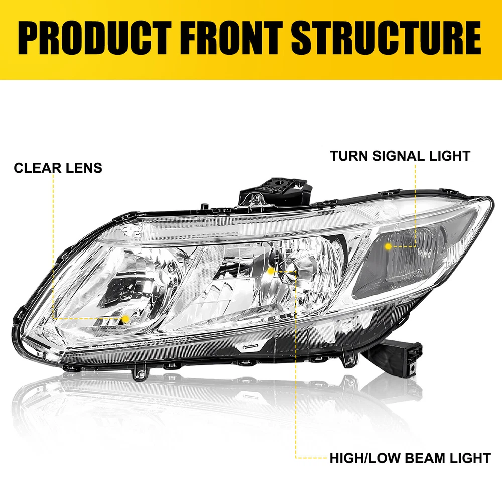 FOR 2012-15 HONDA CIVIC CHROME HOUSING CLEAR CORNER HEADLIGHT REPLACEMENT LAMP