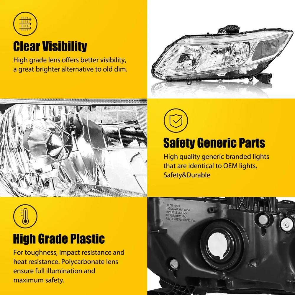 Manufacturer Part Number: F09W140001 Turn Signal Bulb Type: 7443 Bulb (No Included) Interchange Part Number: 33150TR0A01,33400TR0A01,33150TR2A01,331400TR2A01 Number of Bulbs: 0 Other Part Number: HO2502144, HO2503144,HO2502145, HO2503145 Placement on Vehicle: Front, Left, Right Features: DOT-Certified, SAE-Certified Low Beam Bulb Type: 9006 Bulb (No Included) Fitment Type: Direct Replacement OE/OEM Part Number: HO2503144 HO2502150 HO2503150 Type: Headlight Assembly gtin13: Does not apply Items Included: Driver Side & Passenger Side Housing Color: Chrome Fits for 2: For 2012-2013 Honda Civic 2-Door Coupe Lighting Technology: Halogen Bulb Shape Code: 9005;9006 Manufacturer Warranty: 1 Year Superseded Part Number: 33150TR0A01,33400TR0A01,33150TR2A01,331400TR2A01 Fits for 1: For 2012-2015 Honda Civic 4-Door Sedan Bulbs Included: No Lens Color: Clear Brand: AUXITO UPC: Does not apply High Beam Bulb Type: 9005 Bulb (No Included)