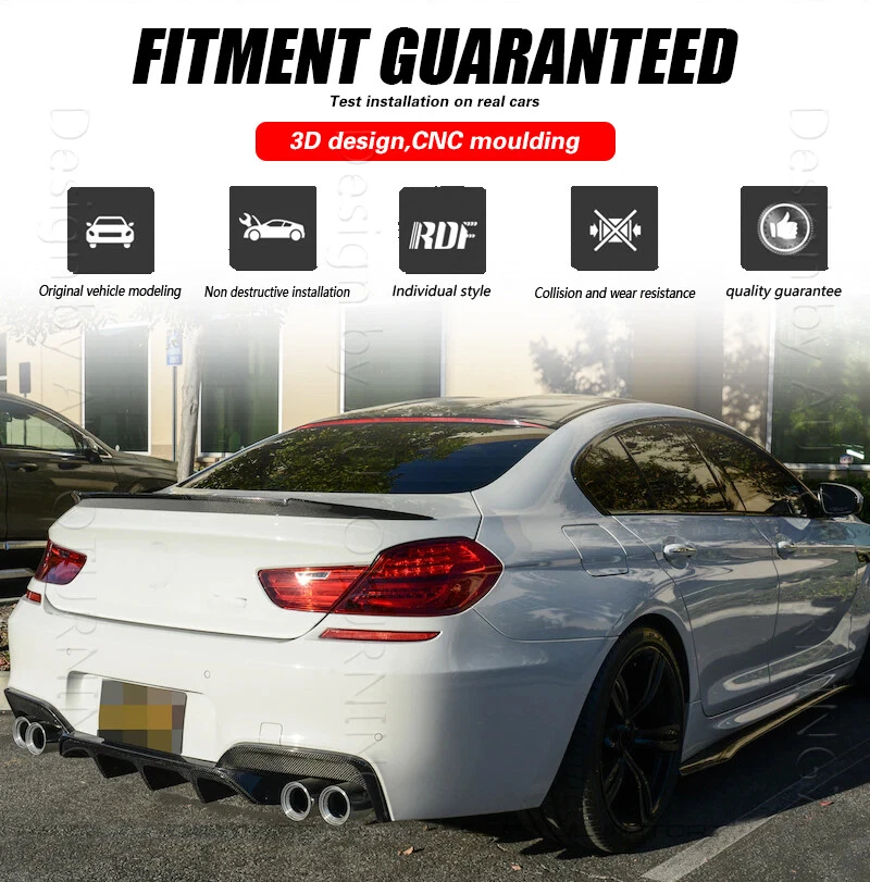 Fitment: Fit for BMW 6 Series F06 F13 640I 650I M6 Gran Coupe 4-Door 2013 2014 2015 2016 2017 2018 2019, not for F12 Convertible Models Specifications: Product Name: Rear Spoiler Material: Carbon Fiber Size:Length:130cm Package Size: 138*39*11cm Package Weight: 2.1kg Features: Made of High Quality Lightweight Carbon Fiber. Latest Design GT Wing Spoiler Completed Kit, Improve Handling And Make Tail More Stable in High Speed. Water Transfer Carbon Fiber for Highest Durability and Appearances. Adjustable Angles for Customizable Usages and Efficiencies, Enhances Aerodynamic. Reduces Drag, Increases Fuel Efficiency, Reinforces Downforce, Traction and Stability. Double-sided adhesive paste, Easy to Install. Package included: 1 x Spoiler with self-adhesive glue tape Carbon Fiber Spoiler The Rear Trunk Spoiler is one of the simplest mods you can do to the exterior of your car that will give your car that completely different look. Not only are spoilers meant for great looks, they also help with the aero dynamics of the car by lowering drag, or helping to put more downforce on the car making sure that the wheels stay grounded for maximum traction. Fitment: Fit for BMW 6 Series F06 F13 640I 650I M6 Gran Coupe 4-Door 2013 2014 2015 2016 2017 2018 2019, not for F12 Convertible Models Specifications: Product Name: Rear Spoiler Material: Carbon Fiber Size:Length:130cm Package Size: 138*39*11cm Package Weight: 2.1kg Features: Made of High Quality Lightweight Carbon Fiber. Latest Design GT Wing Spoiler Completed Kit, Improve Handling And Make Tail More Stable in High Speed. Water Transfer Carbon Fiber for Highest Durability and Appearances. Adjustable Angles for Customizable Usages and Efficiencies, Enhances Aerodynamic. Reduces Drag, Increases Fuel Efficiency, Reinforces Downforce, Traction and Stability. Double-sided adhesive paste, Easy to Install. Package included: 1 x Spoiler with self-adhesive glue tape Delivery details Payment and TAX Warranty Policy Return Policy Contact us Delivery details NOTE: The shipping fee is only for the mainland of each country, it does not include the overseas territories, such as Virgin Islands (U.S.) , Puerto Rico, Hawaii , French Reunion Island, etc. But on ebay, when buyers from Puerto Rico and overseas territories , the shipping fee is equal to United States, it is NOT correct,. please contact us for correct shipping fee, or we will cancel the order. Sorry for the inconvenience, and thanks for your cooperation. 1. If you want to upgrade the shipping, please contact us before making payment, we will revise the shipping fee. 2. We will ship according to your Ebay address. Please make sure it is correct and include phone number for delivery. If you want to know the exact shipping time , please contact us . Payment and TAX 1.We accept Multiple Payment Methods Available: Credit Card, Debit Card, Gift Card, Apple Pay, Goggle Pay, PayPal and PayPal Cred. 2.Please leave note for your special request (e.g. Colors or Size) in ebay note when you pay the order. 3.Your must complete the payment within 7 days or Ebay will automatically open unpaid item case For US Buyer:The invoice value of each item is less than 800USD ,so you no need to pay any tariff . NON-US Buyer Note: Most countries are tax free based on our invoices, if tax is required, which will be buyer's responsibility. Warranty Policy We Warranty Our Product Within the Limited Warranty Policy Specified on Ebay. Please Email us if ou have any question regarding the warranty policy on a specific item. Most of the items are Aftermarket Parts and they are intended for off-road usage only, therefore no installation instruction will be included, Professional installation are Highly Recommended. We are not responsible for any damages to the item or the vehicle that occur during the installation of the item.Also, Please Make Sure Proper Installation is Performed as we are not responsible for item being missing or flew off after the installation. if you don't think the item can stay on the car properly, please do not attempt to drive the car with it and please check with professional shops/mechanics or contact us for assistance. Return Policy We Accept Returns Within the Return Period On Ebay. Return Authorization/Return Approval is Required For Every Return. So If you Wish to Make a Return On Your Purchase. Please Contact us Before You Send The item back For any damages occured to the item upon arrival, Please notify us within 5 days of the delivery so we can take proper action to fix the issue. So Please Kindly inspect and check the item condition upon arrival.For Any other Return Inquries, You can contact us within the return period to obtain return authorization/return approval. In case of return, the merchandise needs to be returned in original condition with origi- nal packaging in order to be eligible for an exchange or a refund. Items must be not opened in their original package. Any mark of installation, mounting, cutting, scratch or using will not be allowed. Contact us 1.We are trying our best to explain all details of the products here! If you have any question, please feel free to contact us by Ebay message, and We will get back to you within 24-48 hours. 2.Customer satisfaction is our NO.1 priority. If you are not happy with the item that you purchase, please contact us first. We will try our best to solve the problem with you.Please leave us a positive feedback if you receive the item.Please do not leave negative or neutral feedback without any contact.If you haven't received item in 30 days, please contact us and we will arrange refund.We appreciate your business.Happy Bidding & Have a nice day! 3.Working hours: From 8 a.m. to 6 p.m. from Monday to Friday. From 8 a.m. to 12 a.m. on Saturday morning Holiday/Rest time: Saturday afternoon and Sunday