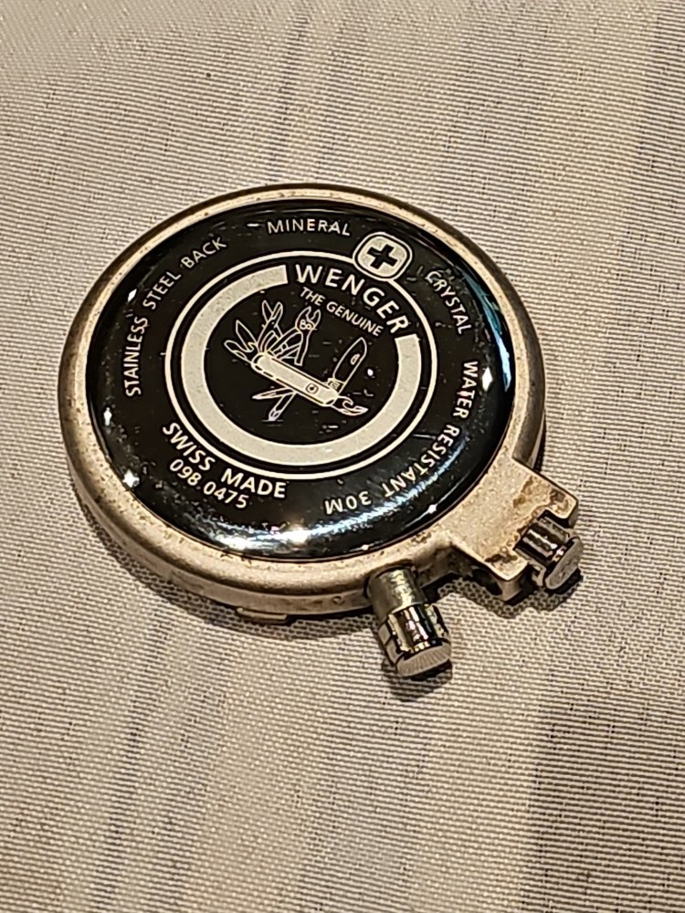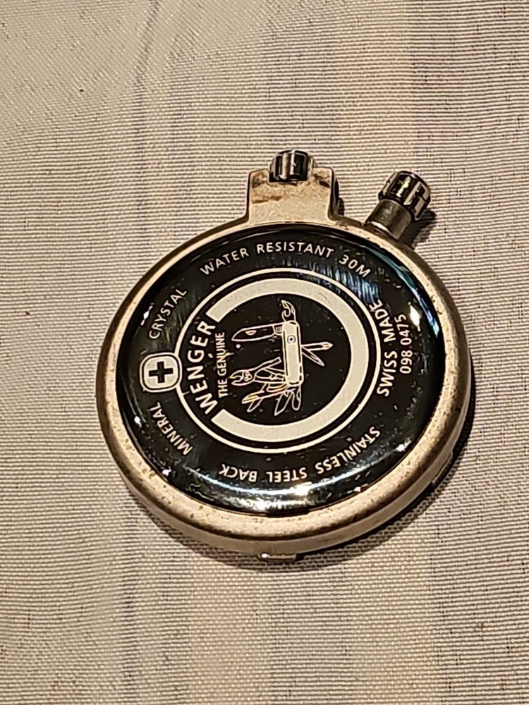 For parts or repair whatch doesn't work we installed a new battery and didn't work The product is a Swiss made Wenger pocket watch with a stainless steel metal case. Designed for men, this specific model is the Wenger 098.0475. Perfect for those looking to repair or use for spare parts, this watch combines precision craftsmanship with durable materials. Ideal for watch enthusiasts or collectors of vintage timepieces, the Wenger pocket watch offers a touch of classic elegance and functionality.