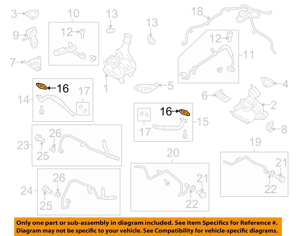 eBay Parts Center Template 1 FORD OEM 10-19 Explorer Turbocharger Components-Lower Pipe Gasket AA5Z6N652A #16 on Diagram Only-Genuine OE Factory Original Item SELLER & PAYMENT INFORMATION Seller name : drg1632 See our other listings CUSTOMER SUPPORT If you have questions about the product or your order please contact us via eBay Messages for assistance. Thank you. SHIPPING & HANDLING Shipping Service: Please refer to shipping section Shipping Cost: Please refer to shipping section Order Processing Time: 5 business days PART AND FITMENT DETAILS Brand: FORD OEM Part Number: AA5Z6N652A Item Description: Lower Pipe Gasket Quantity Needed: 1 Position: Right Item Specifics: UPC Does not apply Part Ref# on Diagram ONLY PART REFERENCE #16 ON THE DIAGRAM IS INCLUDED Category 1 Engine Category 2 Engine / Transaxle Genuine OEM Yes Quantity Needed 1 See Item Specifics section for additional specifications about this part. Vehicle Fitment Summary To confirm that this part fits your vehicle, enter your vehicle's Year, Make, Model, Trim and Engine in the Compatibility Table . Also review the notes section in the compatibility chart for additional specifications about this part. This part generally fits Ford,Lincoln vehicles and includes models such as Explorer,Flex,MKS,MKT,Police Interceptor Sedan,Police I nterceptor Utility,Taurus with the trims of Base Sedan 4-Door,Base Sport Utility 4-Door,EcoBoost Sedan 4-Door,EcoBoost Sport Utili ty 4-Door,Limited Sport Utility 4-Door,Livery Sport Utility 4-Door,Platinum Sport Utility 4-Door,Premiere Sport Utility 4-Door,Res erve Sport Utility 4-Door,SEL Sport Utility 4-Door,SHO Sedan 4-Door,Sport Sport Utility 4-Door,Titanium Sport Utility 4-Door. The engine types may include 3.5L 3496CC 213Cu. In. V6 GAS DOHC Turbocharged,3.7L 3726CC 227Cu. In. V6 GAS DOHC Naturally Aspirated. T his part fits vehicles made in the following years 2010,2011,2012,2013,2014,2015,2016,2017,2018,2019. To confirm that this part fits your vehicle, enter your vehicle's Year, Make, Model, Trim and Engine in the Compatibility Table . Also review the notes section in the compatibility chart for additional specifications about this part. Interchange Part Numbers This item may interchange to the following part numbers from other brands. This is provided for reference only and does not guarantee that the part your are buying is identical to the part numbers from the brands listed below. To confirm that this part fits your vehicle, enter your vehicle's Year, Make, Model, Trim and Engine in the Compatibility Table . Brands: WORLDPAC WP2 Part Numbers: WP-806733-OES Other Information The part or sub-assembly you are purchasing is a Genuine OEM Factory Original part sold by an authorized Genuine OEM parts reseller. The part is not "like OEM", it is the Genuine OEM part sold by the vehicle manufacturer. The part or sub-assembly you are buying may be referenced on a diagram above. The diagram above is a Genuine Factory image from the vehicle manufacturer showing the entire assembly surrounding the part or sub-assembly you are purchasing. ONLY the single part or sub-assembly specified in the callout "Part Ref# on Diagram" is being sold to you. Parts are shown individually with their own Ref #, while sub-assemblies may show multiple parts within a square or circle in the diagram with its own corresponding Ref #. You can find the part or sub-assembly being sold by locating the correct Part Reference # on the diagram. Note: Sometimes the same Reference number can appear multiple times on one diagram. Typically only ONE part from ONE of the callouts will be included. See the Compatibility table "Notes" section for details about the part you are buying. If you have questions, please contact us before buying to avoid confusion. Additional Information The part or sub-assembly you are purchasing is a Genuine OEM Factory Original part sold by an authorized Genuine OEM parts reseller. The part is not "like OEM", it is the Genuine OEM part sold by the vehicle manufacturer. The part or sub-assembly you are buying may be referenced on a diagram above. The diagram above is a Genuine Factory image from the vehicle manufacturer showing the entire assembly surrounding the part or sub-assembly you are purchasing. ONLY the single part or sub-assembly specified in the callout "Part Ref# on Diagram" is being sold to you. Parts are shown individually with their own Ref #, while sub-assemblies may show multiple parts within a square or circle in the diagram with its own corresponding Ref #. You can find the part or sub-assembly being sold by locating the correct Part Reference # on the diagram. Note: Sometimes the same Reference number can appear multiple times on one diagram. Typically only ONE part from ONE of the callouts will be included. See the Compatibility table "Notes" section for details about the part you are buying. If you have questions, please contact us before buying to avoid confusion. ABOUT THE SELLER Dealer Code: 000542 OEC: 001-YE5-X5S RETURN POLICY WARRANTY Warranty Duration: 1 Year Warranty Type: Manufacturer Warranty