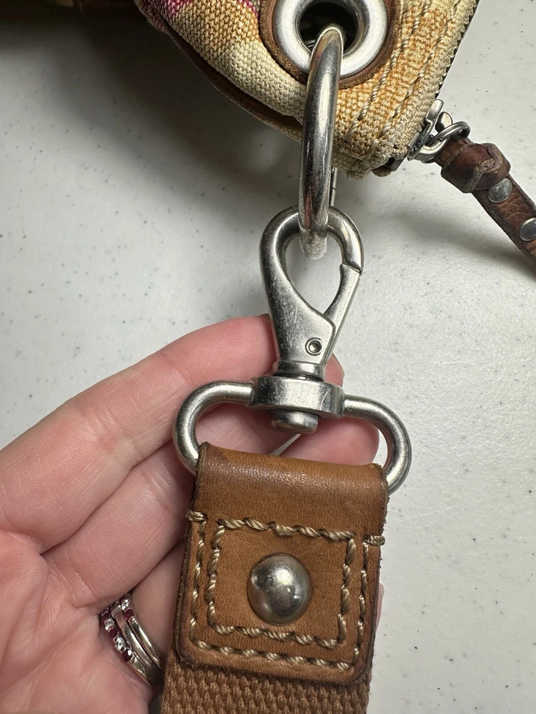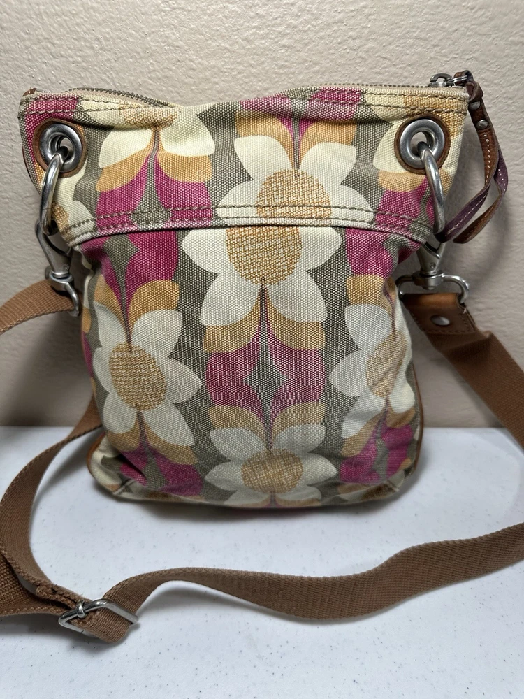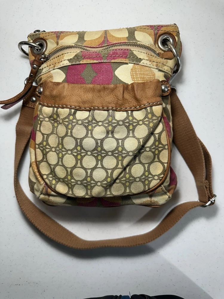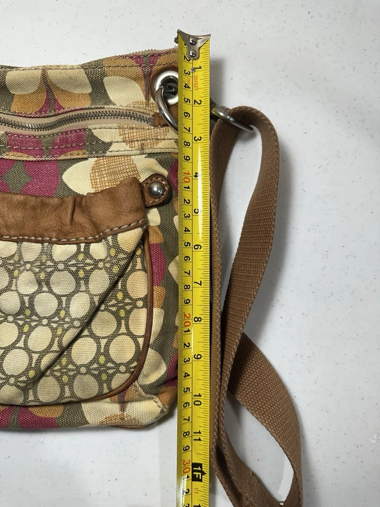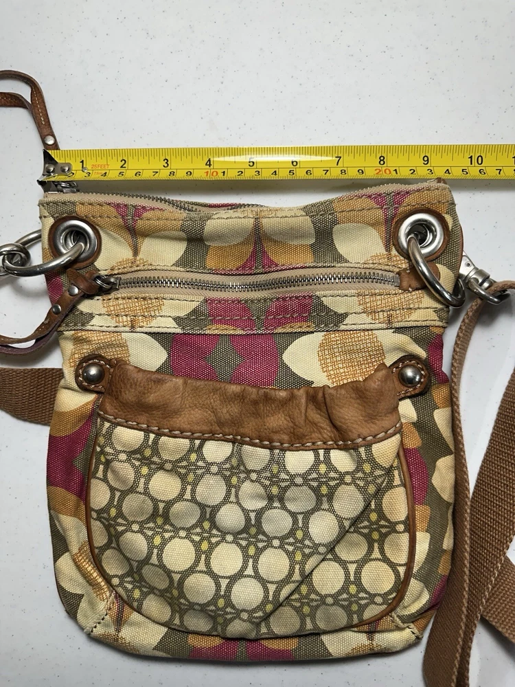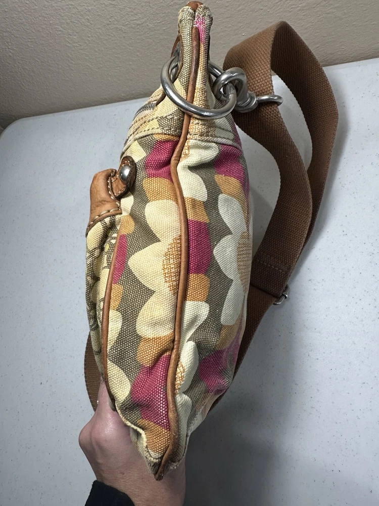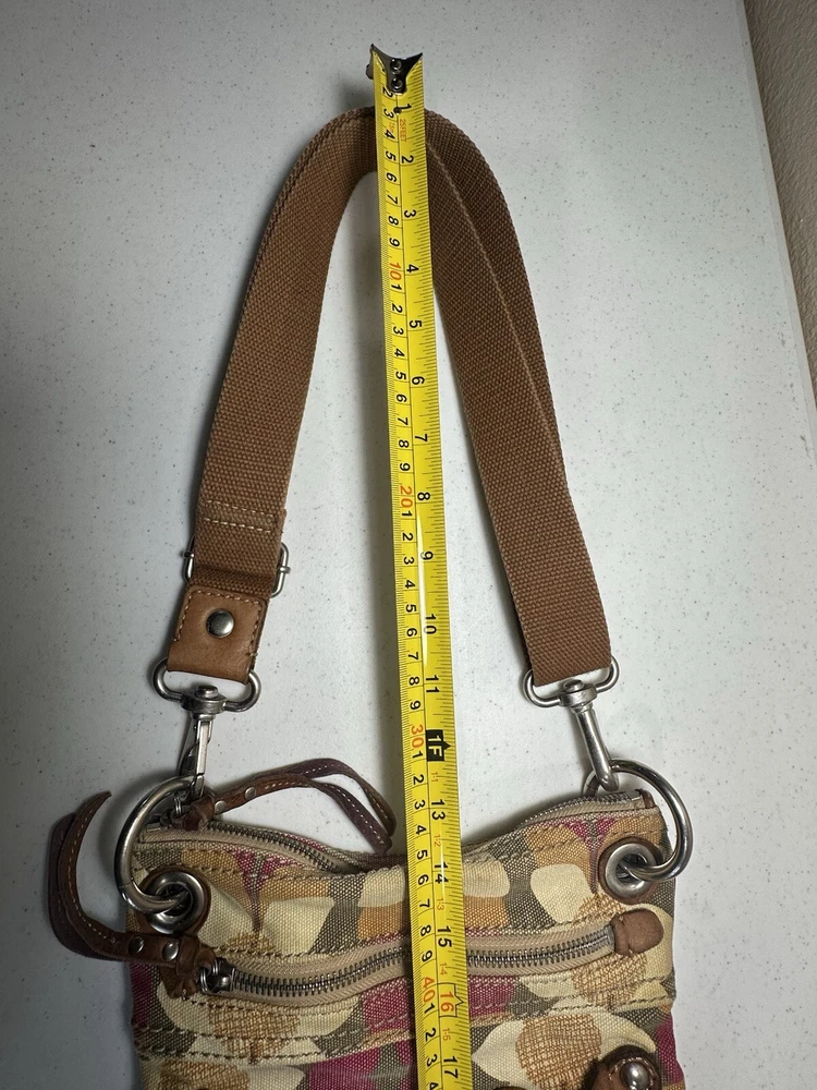 Beautiful vintage Y2K purse in very good CLEAN condition! The inside has really no sign of use! The canvas has its general fade but still vibrant in color! The straps, leather pull tabs and hardware are all in excellent condition! There is some sign of wear on the bottom corners as seen in the photos! The strap is tully adjustable and can be made fairly short at 14 inches long too much longer at 24 inches long! The bag is therefore versatile, in that it can be worn as a shoulder bag or a Crossbody bag as seen on the mannequin. Smoke free home! Ships fast same or next day!