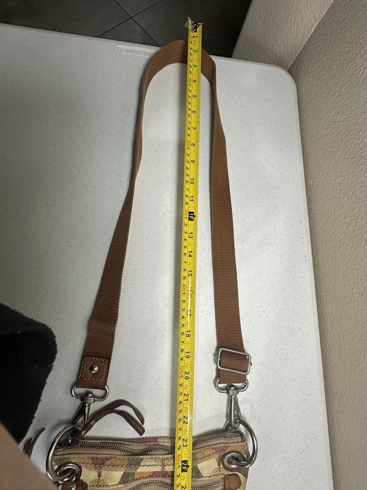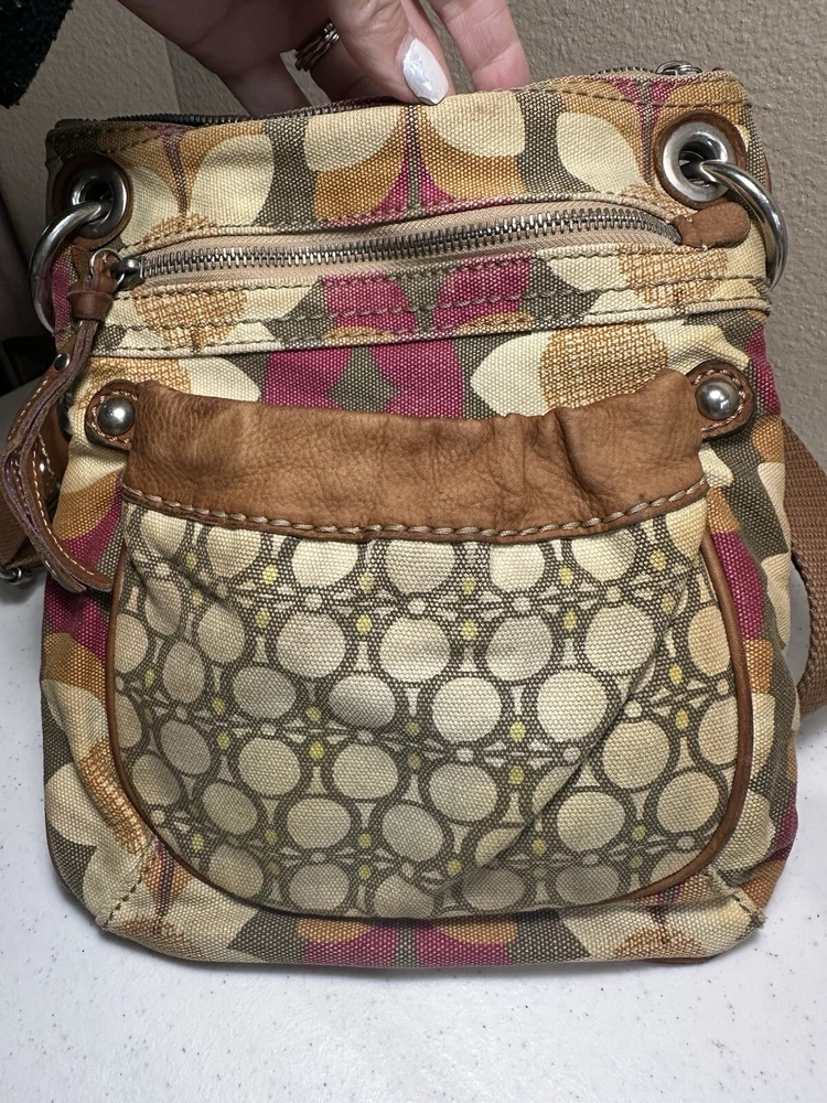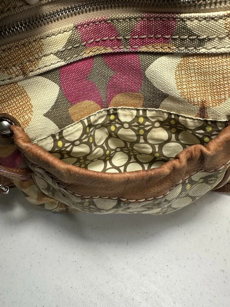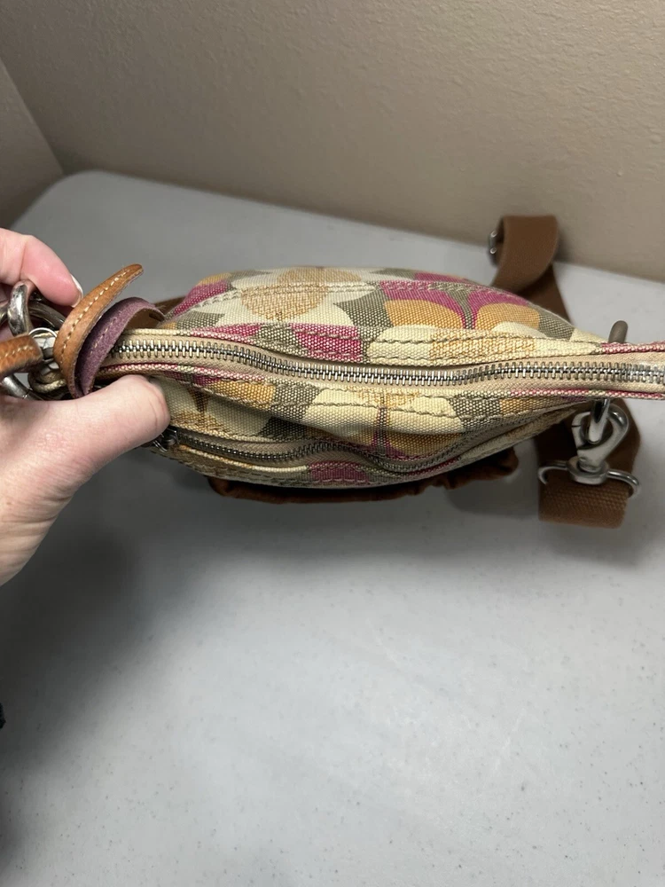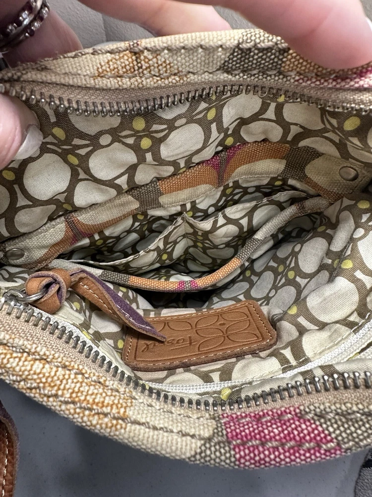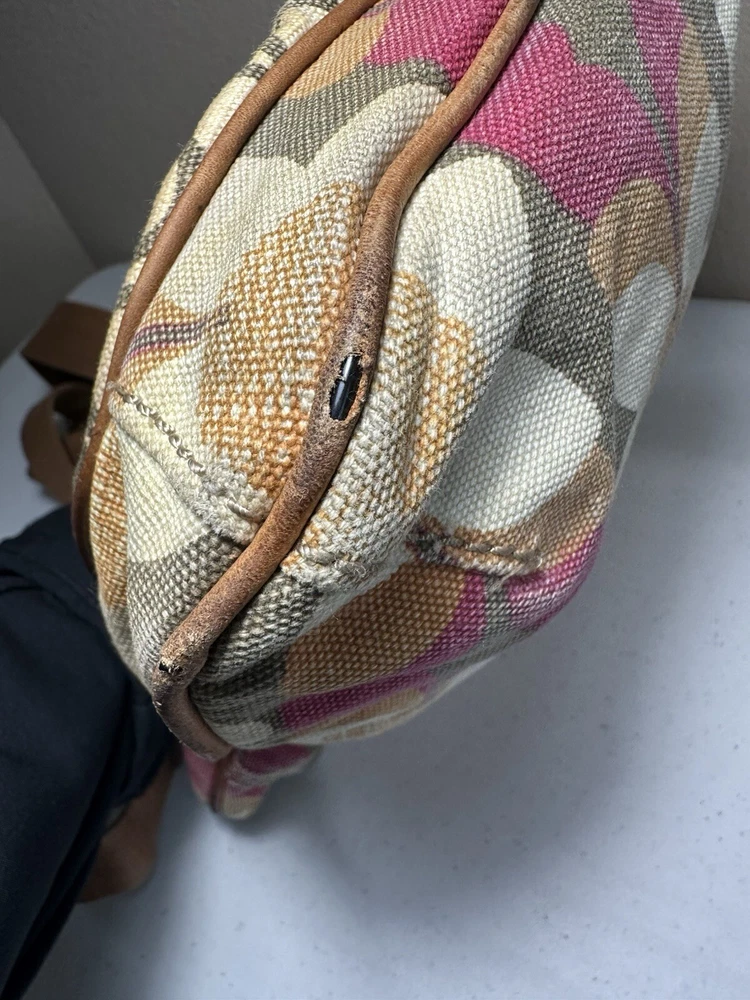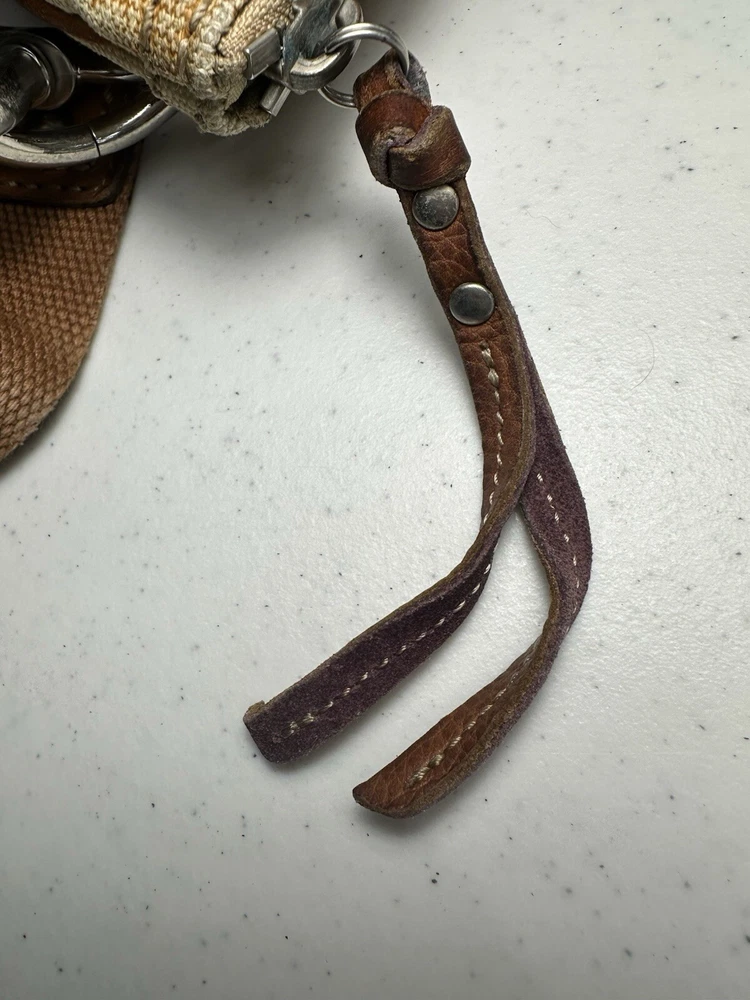 Beautiful vintage Y2K purse in very good CLEAN condition! The inside has really no sign of use! The canvas has its general fade but still vibrant in color! The straps, leather pull tabs and hardware are all in excellent condition! There is some sign of wear on the bottom corners as seen in the photos! The strap is tully adjustable and can be made fairly short at 14 inches long too much longer at 24 inches long! The bag is therefore versatile, in that it can be worn as a shoulder bag or a Crossbody bag as seen on the mannequin. Smoke free home! Ships fast same or next day!