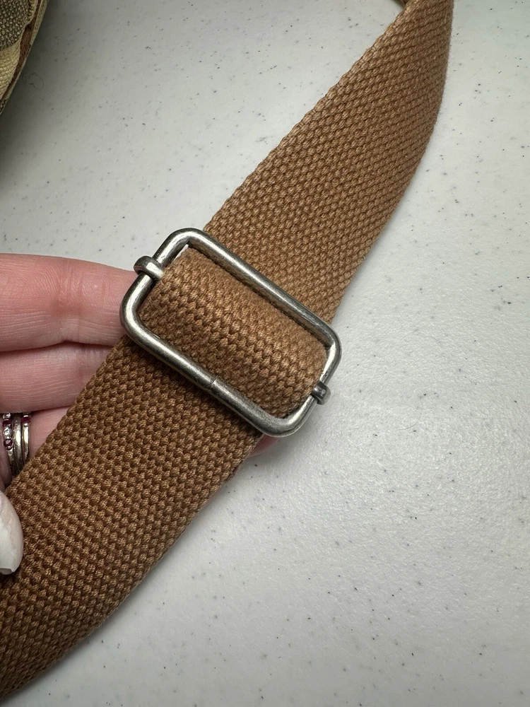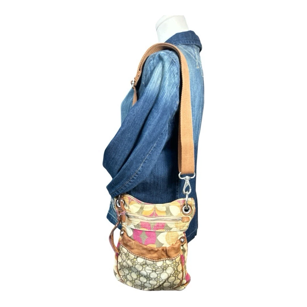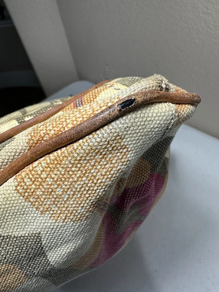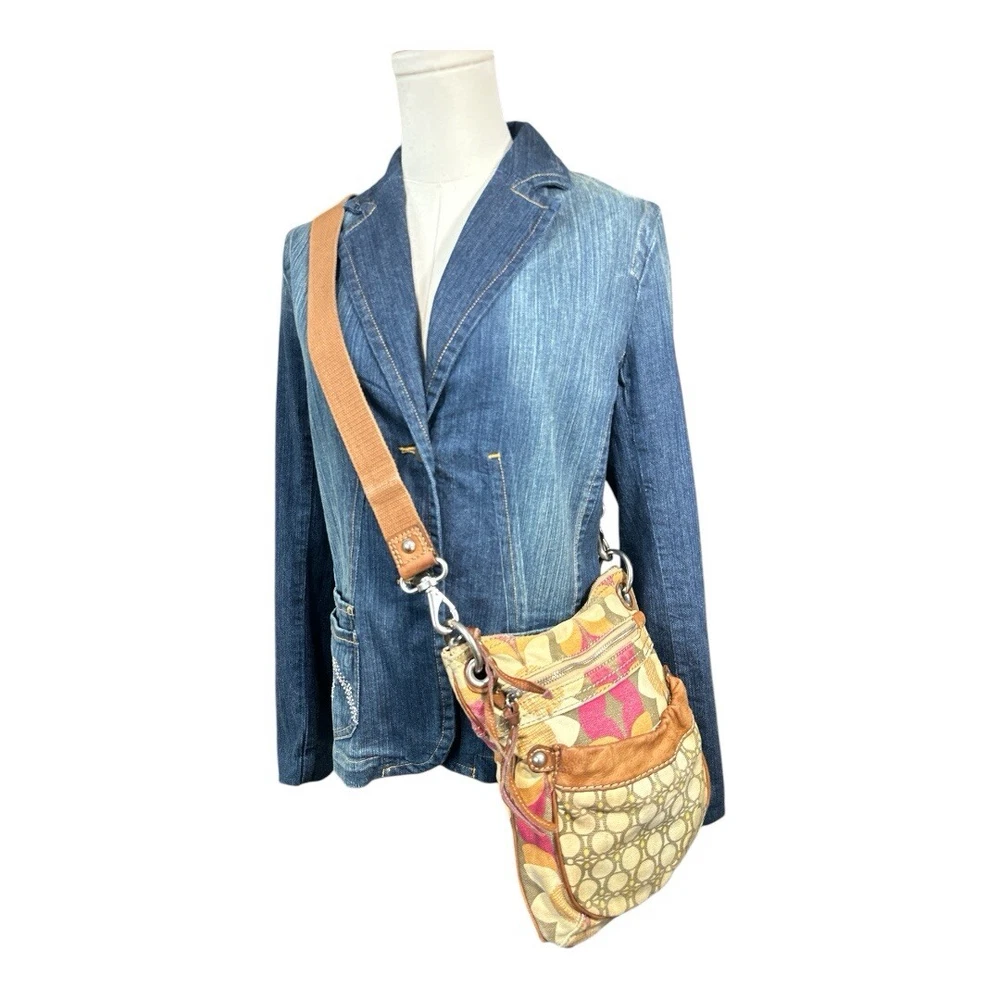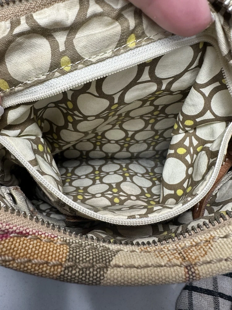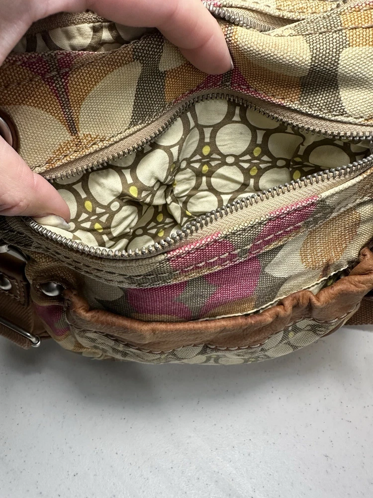 Beautiful vintage Y2K purse in very good CLEAN condition! The inside has really no sign of use! The canvas has its general fade but still vibrant in color! The straps, leather pull tabs and hardware are all in excellent condition! There is some sign of wear on the bottom corners as seen in the photos! The strap is tully adjustable and can be made fairly short at 14 inches long too much longer at 24 inches long! The bag is therefore versatile, in that it can be worn as a shoulder bag or a Crossbody bag as seen on the mannequin. Smoke free home! Ships fast same or next day!