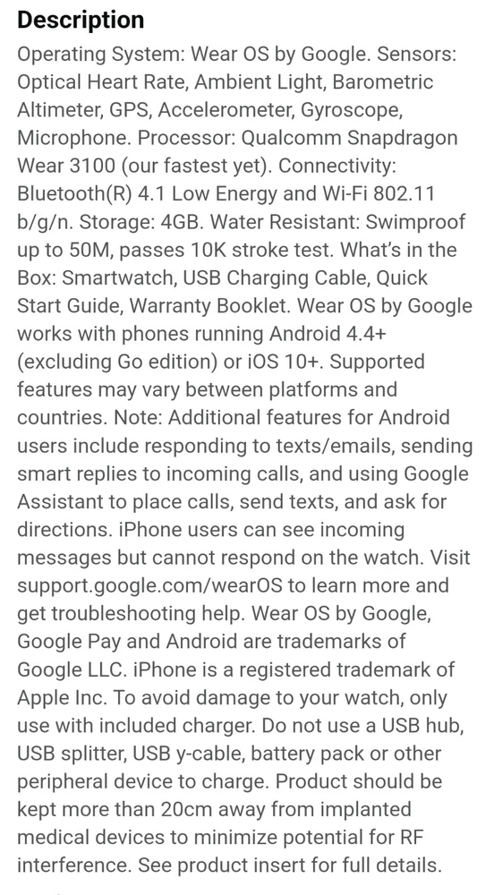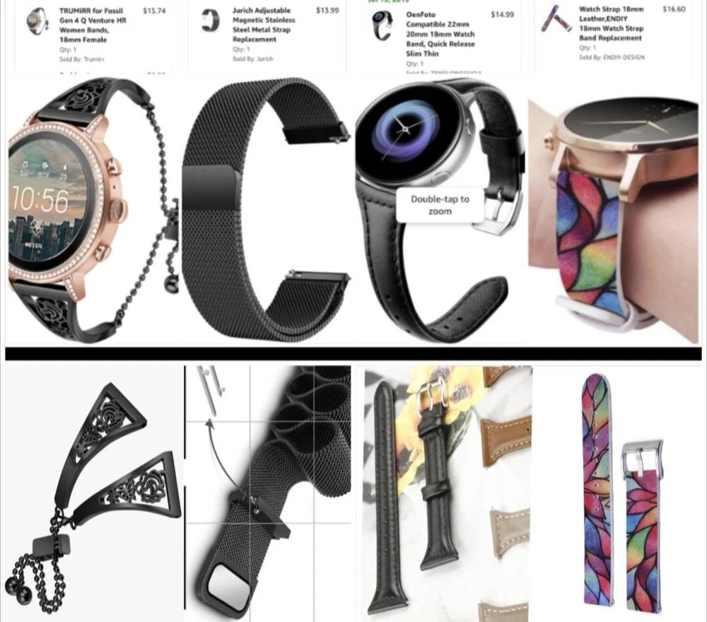 ---------⟨INCLUDED ITEMS:⟩------------- -1 Gen 4 Fossil Smartwatch Sport (FTW4019) -1 charging dock stand (USSKG4CDSB) -4 extra 18mm bands/straps: 1 leather slim black, 1 leather colorful feather print, 1 metal mesh, 1 jewelry cuff TOTAL BUNDLE VALUE: $270 (originally purchased for: $199 watch, $9.99 dock, $61 all 4 bands) Open to offers! -------------------------------------------- - - - -⟨FOSSIL GEN 4 WATCH INFO⟩ - - - - "Google Fossil Gen 4 Sport Smartwatch Wear OS Android, Heart Rate, Metal & Silicone, Touchscreen, 43mm, Swimproof, Grey/Black FTW4019 (UPC: 796483422728 / C2F912301504)" - - [WATCH SPECS] - - MODEL: Fossil FTW4019 SERIES/ GEN: Fossil Q series, Gen 4 Sport UPC: 796483422728 CASE: Metal, Round, 43mm diameter, 12mm thick, silver color BAND: Silicone, Smoke/ gray color, 20mm width PROCESSOR: Qualcomm Snapdragon Wear 3100 OPERATING SYSTEM/ COMPATIBILITY: Wear OS by Google > Compatible with Android OS 4.4+ and iOS 9.3 Number on back of watch: C2F912301504 CONNECTIVITY: Wireless- Bluetooth Smart Enabled / 4.2 Low Energy and NFC technology NOTIFICATIONS: Alarm Clock, App Alerts, Calendar, Email, Multiple Time Zones, Social Media, Text messages FUNCTIONS: Control Your Music, Google Pay, GPS, Heart Rate Tracking, Interchangeable Watch Band, Personalise Your Dial, Swimproof - - [WATCH FEATURES] - - •Touchscreen functionality, Digital display •Heart Rate Monitor •Swimproof/ Water resistant depth: 165ft •GPS, Sensors: accelerometer, gyroscope, altimeter •Comprehensive monitoring of: distance, calories, heart rate, steps taken •Wear OS by Google: App notifications (smartphone , SMS, enail, social, calendar apps), Google Pay, Google Assistant with microphone, music storage & controls •Custom goal & alarm settings, multiple time zones, Calendaring •24hr battery based on usage /rapid charging up to 80% in 1hr •Lightweight, customizable watch faces, interchangeable with other 16mm bands •Vibrate mode •Built-in microphone - - [WATCH DESCRIPTION] - - "Gen 4 Sport Smartwatch is part of the Fossil Q series with features to help you stay on top of your health. This ultra-lightweight 43mm watch features a smoke silicone strap, lets you track your heart rate, track your workout (even swimming), customize your dial, view notifications at a glance and more. The Bluetooth and Wi-Fi capabilities make it easy to integrate your favorite applications, while the interchangeable band offers a host of customization options." - -[WATCH PRICE/ CONDITION] - - Smartwatch and dock are in excellent used condition: everything is fully functioning, no clear damage, and barely used. A few tiny scratches around edge of silver casing can be seen from side but not noticable when on wrist and superficial marks- shown in last photo. No other evident wear or issues with the watch. Original boxes unavailable, watch Instruction pamphlet included. Watch works perfectly, setup with Wear OS app PRICING: Originally purchased $199.00 ------------------------------------------- - - - -⟨CHARGING DOCK INFO⟩- - - - "Soarking Charging Dock/Stand black, 5 Ft Cable, 5 Volts, 10 watts USSKG4CDSB" - - [DOCK SPECS]- - Model #: Soarking USSKG4CDSB UPC: 714449588578, ASIN: BO7S2NDVL6 Connectivity: USB/ total Ports: 1 Current Rating: 1 Amps Output Voltage: 5 Volts Wattage: 10 watts Power Plug: Type A-2 pin, Source: Corded Electric FEATURES: Fast Charger, Magnetic, Short Circuit Protection, overvoltage/overcurrent/overheat/short circuit protection. Magnetic mount, Case Friendly and Charging at Portrait Orientation View, long 5 ft cable Compatible models: Fossil Gen 6/5E/5 carlyle men, Fossil Gen 5 julianna women, Fossil Sport,Fossil Gen 4 Explorist HR,Venture HR,Emporio Armani, MK Runway,Sofie Heart Rate,Diesel ON Fullguard 2.5 Smartwatch DZT9001, Skagen falster 3/2,Kate spade scallop 2, Misfit vapor 2. ----------------------------------------- --⟨BAND/ STRAP DESCRIPTIONS⟩-- ⟨FLORAL HOLLOW OUT JEWELRY CUFF BRACELET⟩ "TRUMiRR 18mm Jewelry Cuff Bracelet Black Stainless Steel" (like new/ no wear, +extra pins »paid $15.75) ⟨MAGNETIC METAL MESH BAND⟩ "Jurich Adjustable Magnetic Stainless Steel" (Good used condition-only few scratches on band, +extra pins »paid $14) ⟨THIN NARROW BLACK LEATHER BAND⟩ "OenFoto Quick Release Slim Thin Narrow Small Leather-18mm Black" (Like new, no wear »Paid $14.99) ⟨COLORFUL FEATHER DESIGN LEATHER⟩ "ENDIY Soft leather 18mm -Blue Lovely Cute Flower Floral Pattern" (Good condition, Slightly bent from storage but curved to fit wrist »Paid $16.60) PRICE: $61 total paid originally for all 4 bands ----------------------------------------