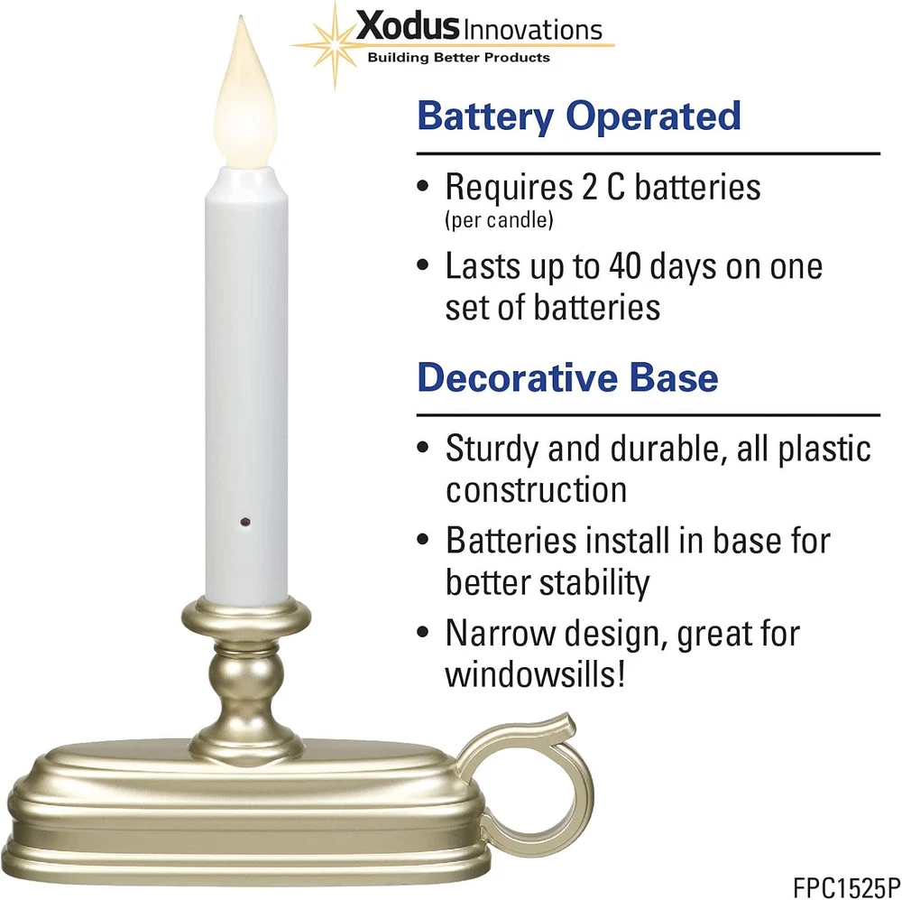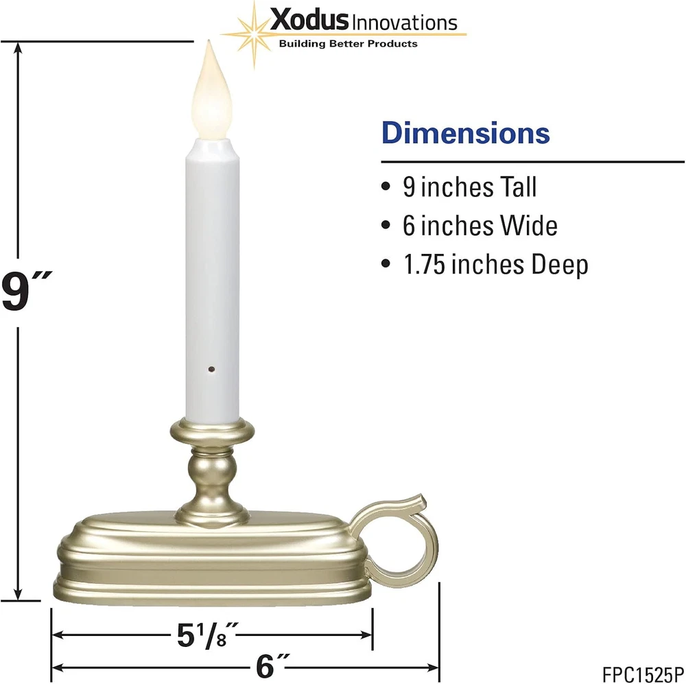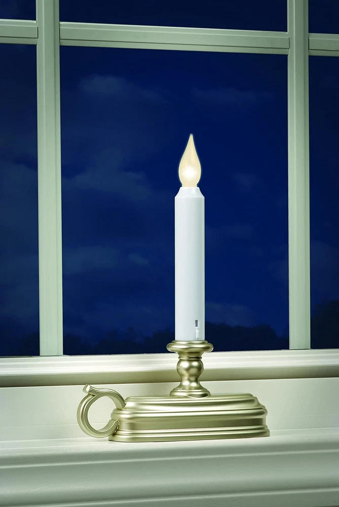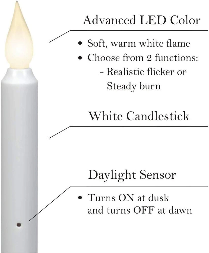 Features a soft, warm white LED light and Large Pewter (silver) base Automatically turns on at dusk and off at dawn LED window candles will last 45 days on 2 C batteries (batteries sold seperately) 3 position switch for flame setting: Off/Steady On/Flicker Measures: 9"H x 6"W x 1.75"D Illuminate your windows safely and cheerfully with this LED-light dusk to Dawn sensor window candle. Battery operated for a clean, wireless look; this classic-style ivory taper with a "flame" has three settings: off, steady on flame or flickering light and has a handsome sculpted candle holder. A discreet automatic sensor turns the candle on at dusk and off at dawn so it's effortless to use, and unlike an incandescent bulb, the LED bulb stays cool for worry-free lighting all night long. Requires 2 C batteries (not included). Batteries will last 20 days when lit for 12 hours on per day and measures: 9"H x 6"W x1.75"D. For indoor use only. Great for window sills since it's only 2 inches deep.