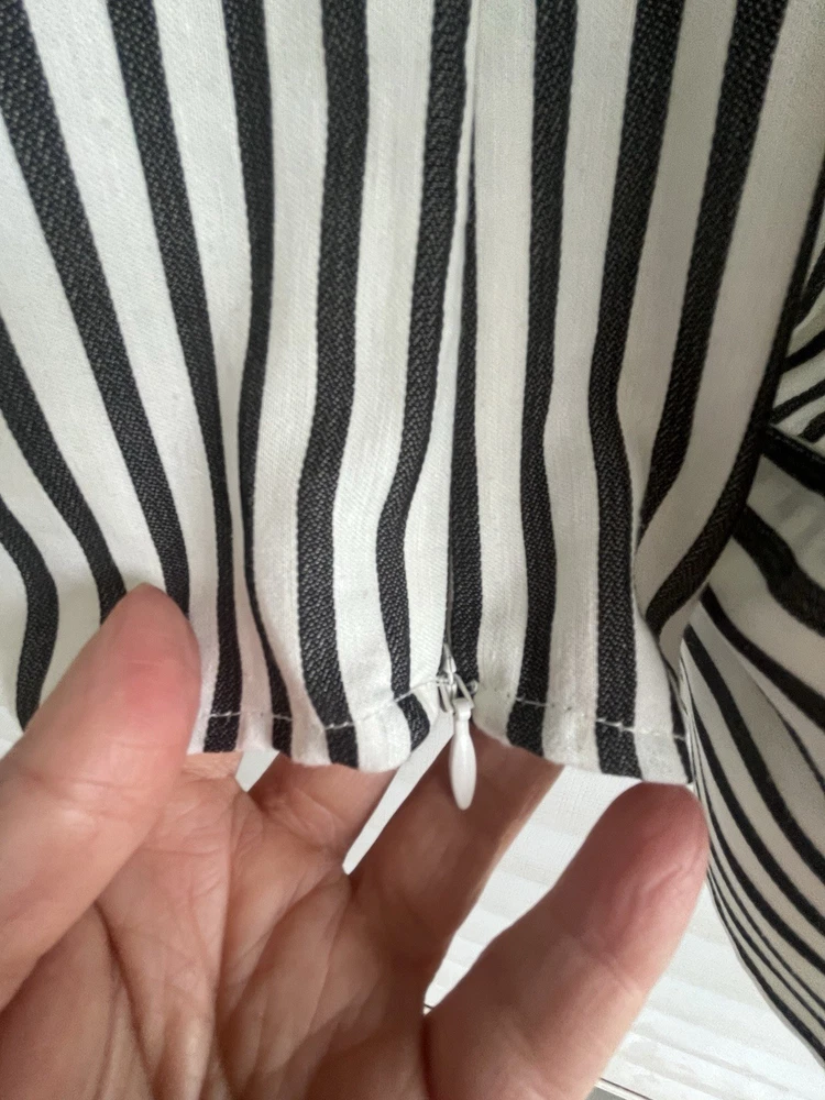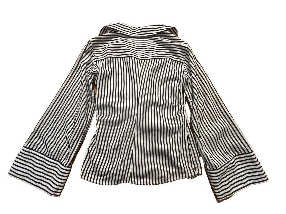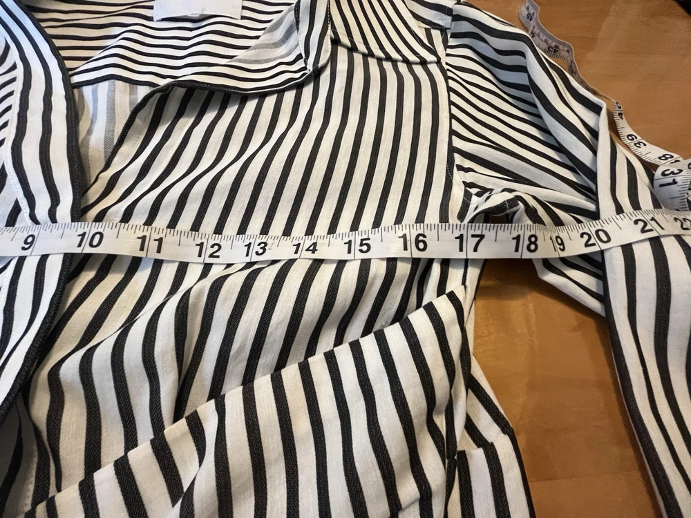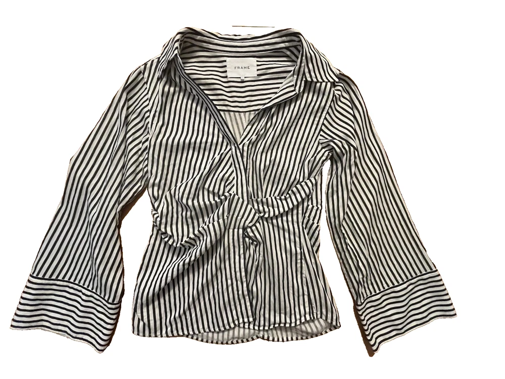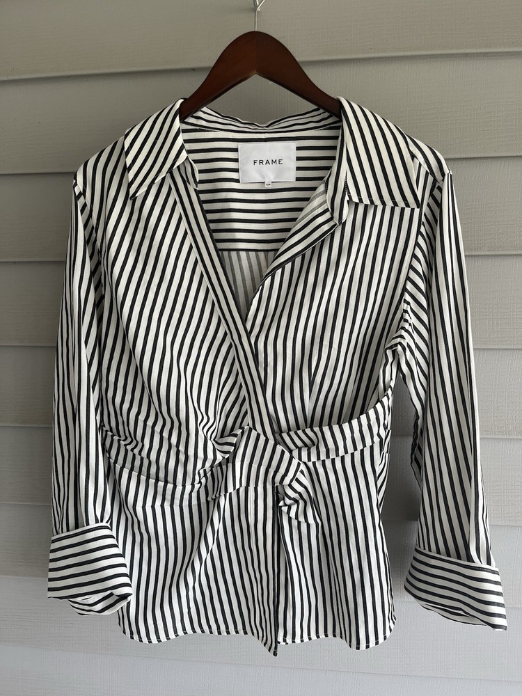 FRAME Wrap Drape Linen Blend Black & White Striped Blouse Wide Sleeve Size = Small Armpit to armpit = approx. 17" Length = approx. 25" Linen, Cotton. Viscose Blend Side Zip Close Career, Breathable, Lightweight, Professional, Business, Night Out, Evening, Flattering, Chic, Elegant, Office