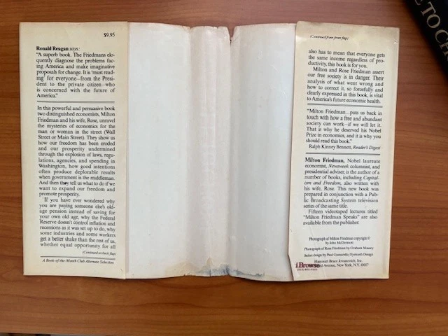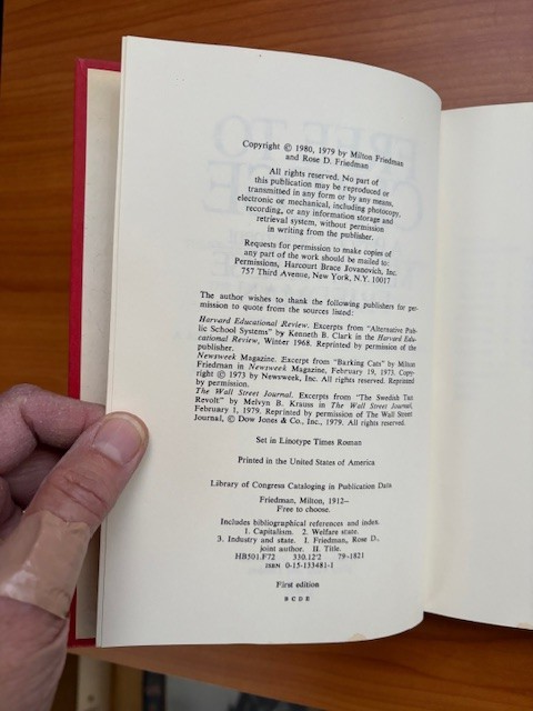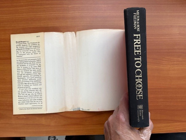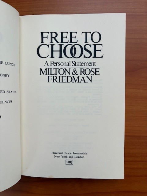 FREE TO CHOOSE: A Personal Statement Friedman, Milton and Rose Published by Harcourt Brace Jovanovich, New York, 1980 FIRST EDITION STATED, APPARENT FIRST PRINTING Hardcover. Condition: Very good. Dust Jacket Condition: Very good. First Edition. States "First edition" on the copyright page, with "BCDE" below, the HBJ criterion for FIRST PRINTING. The classic inquiry into the relationship between freedom and economics. This book and its companion ten-part television series had an enormous influence on the way not just highly educated policy makers but also the general public viewed a wide range of issues. Milton Friedman (1912-2006) was a Nobel Prize-winning economist, while Rose Friedman (1910-2009) was an influential theorist who advised American presidents and world leaders on the formation of their economic policies. Octavo: xii, [2], 338 p. COMPARE $350-$500