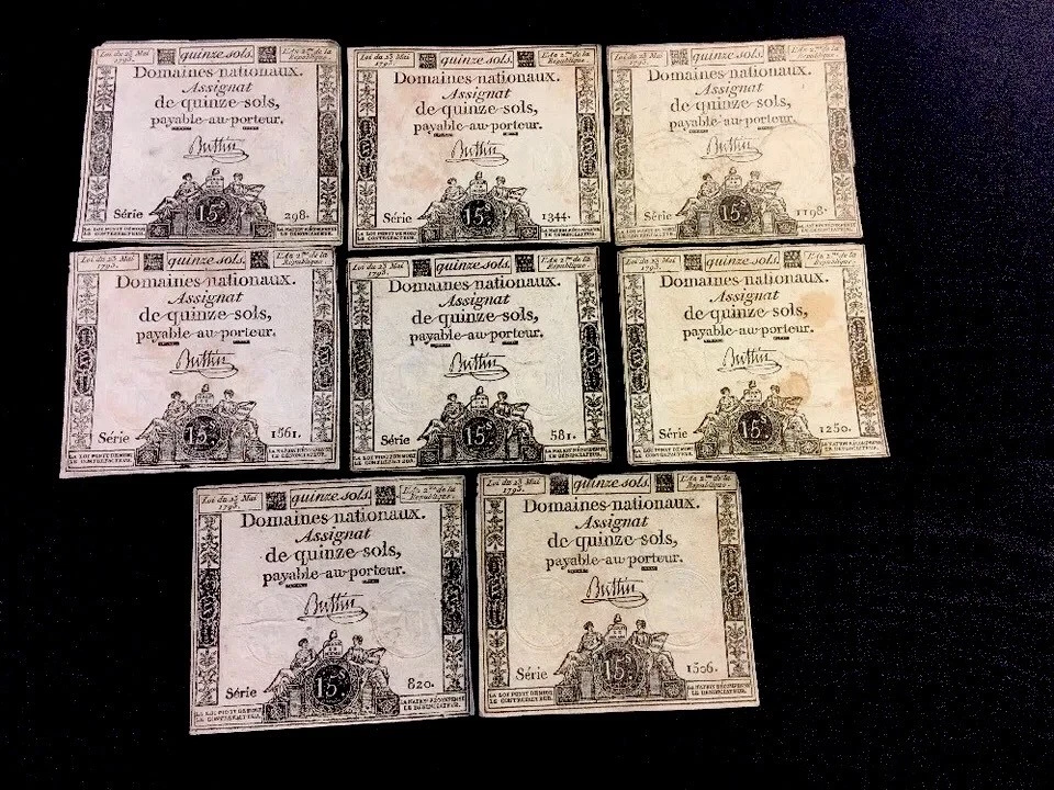 PRICE PER SINGLE BANK NOTE. Assignat , paper bill issued in France as currency from 1789 to 1796, during the French Revolution. In December 1789, to pay its immediate debts, the National Assembly issued the assignat as a bond bearing 5 percent interest, with the recently nationalized church lands as security. By September 1790 the Assembly made the assignat into a paper currency. The initial effect of the paper currency was beneficial, stimulating economic growth and eliminating a money shortage. But a deep public distrust of paper money and the fear that the currency would be worthless if the uncertain Revolutionary regime collapsed soon caused the assignat to depreciate. The outbreak of war with the other European powers in 1792 caused a further decline in the value of the assignat. In 1796 the assignats were replaced by the mandats territoraux (land warrants) at the rate of one mandat for 30 assignats. The failure of the mandat to gain public confidence forced the Directory to return to a metallic currency (February 4, 1797). Stamped and watermarked. Watermarked. Size: 3.5" x 3" See other items.