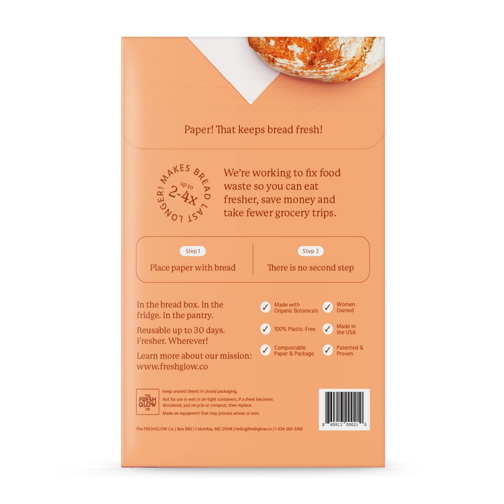 NATURALLY KEEP FOOD FRESH – FRESHPAPER Food-Saver Sheets for Bread & Baked Goods are 100% BPA-free, food-safe, -free, and plastic-free. Scientifically proven, patented product infused with organic that naturally extends the life of fresh baked goods for up to 2-4 times longer. SAVE MONEY – FRESHPAPER reduces costly food spoilage and lets you buy & fresh breads without preservatives. Each package contains 8 Reusable FRESHPAPER Food-Saver Sheets for Bread & Baked Goods. Each sheet keeps working for a month or until the distinctive maple-like scent fades. Save money & enjoy fresh baked goods for longer. EASY TO USE FLEXIBLE DESIGN - Just add FRESHPAPER to any bread bag, container, bread box etc. to preserve your baked goodies for up to 2-4 times longer. Ideal for fresh bagels, cupcakes, baguettes, muffins, quick breads, and other pastries. They can even be cut into custom sizes to fit small containers. SUPPORTS A HEALTHY LIFESTYLE- By extending the life of your fresh breads and baked goods up to 2-4 times longer, FRESHPAPER makes it easier to maintain a healthy lifestyle. Eating healthy can be hard, so take the out of home baking, meal prep & fresh food storage with easy-to-use FRESHPAPER sheets. ECO-FRIENDLY PROVEN SOLUTION – FRESHPAPER is the only patented, food saver product made with organic on the market. Proudly made in the USA. Each sheet is biodegradable, compostable, and recyclable and helps reduce global food waste. As seen on TV and QVC. Packaging may vary