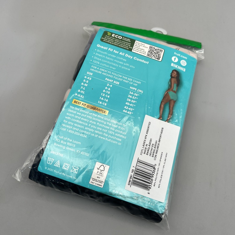 Features: Stretch, Tagless, 92% Polyester / 8% Spandex, 100% Cotton Liner Size Type: Regular Material: 92% Polyester / 8% Spandex Style: Soft Microfiber Bikinis Rise: Bikini Number in Pack: 6 Pack Personalize: No Department: Women Theme: Colorful Fabric Type: Blended Fabric gtin13: 885306993689 Model: Microfiber Bikinis Compression Area: Buttocks Vintage: No Country of Origin: Vietnam Type: Bikini Panties Brand: Fruit of the Loom Garment Care: Machine Washable UPC: 885306993689 Pattern: Solid Color: Multi-Color Size: 7 (L)