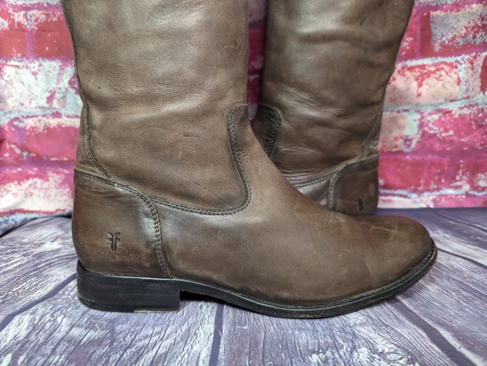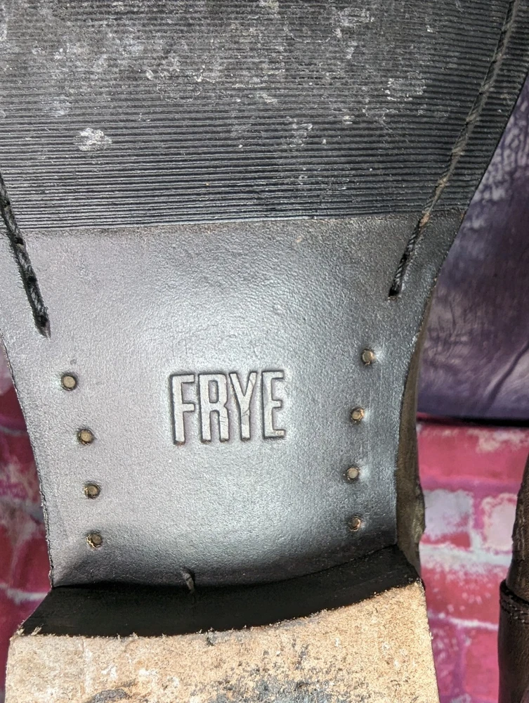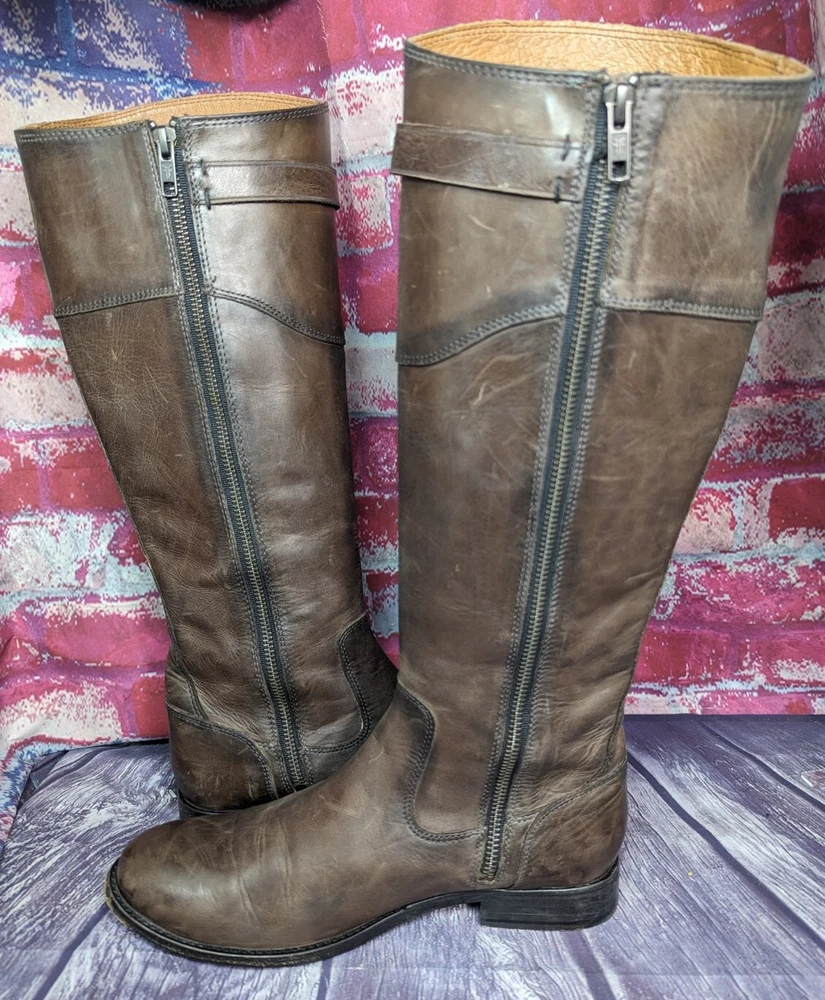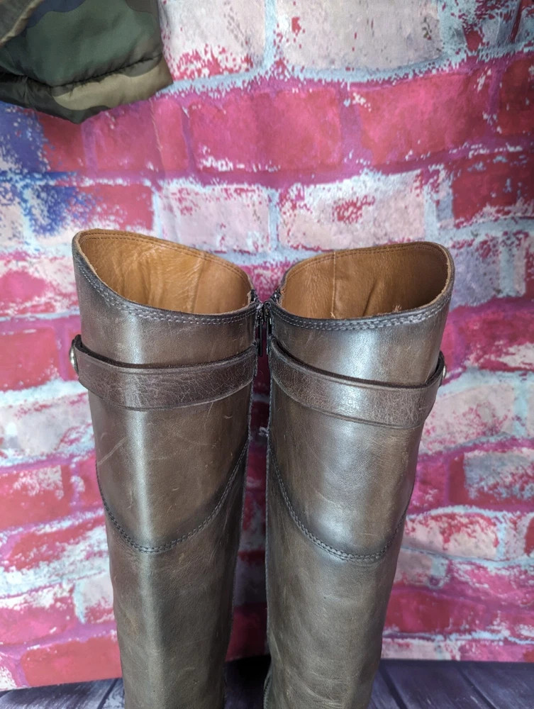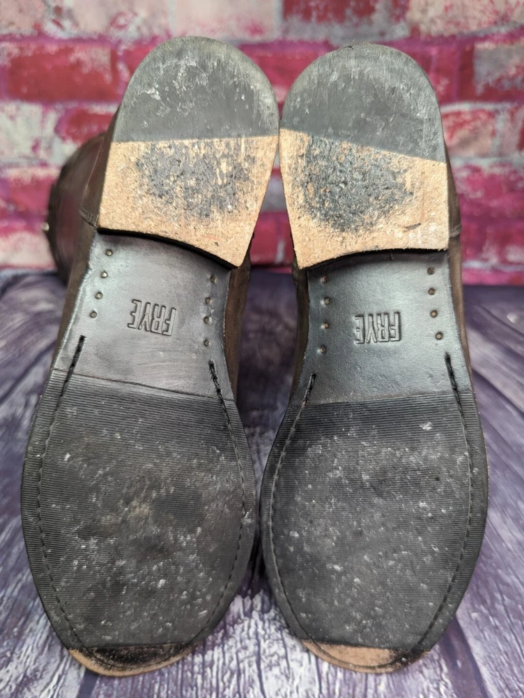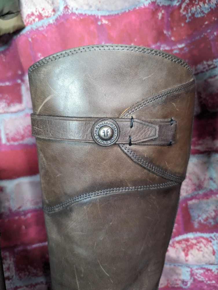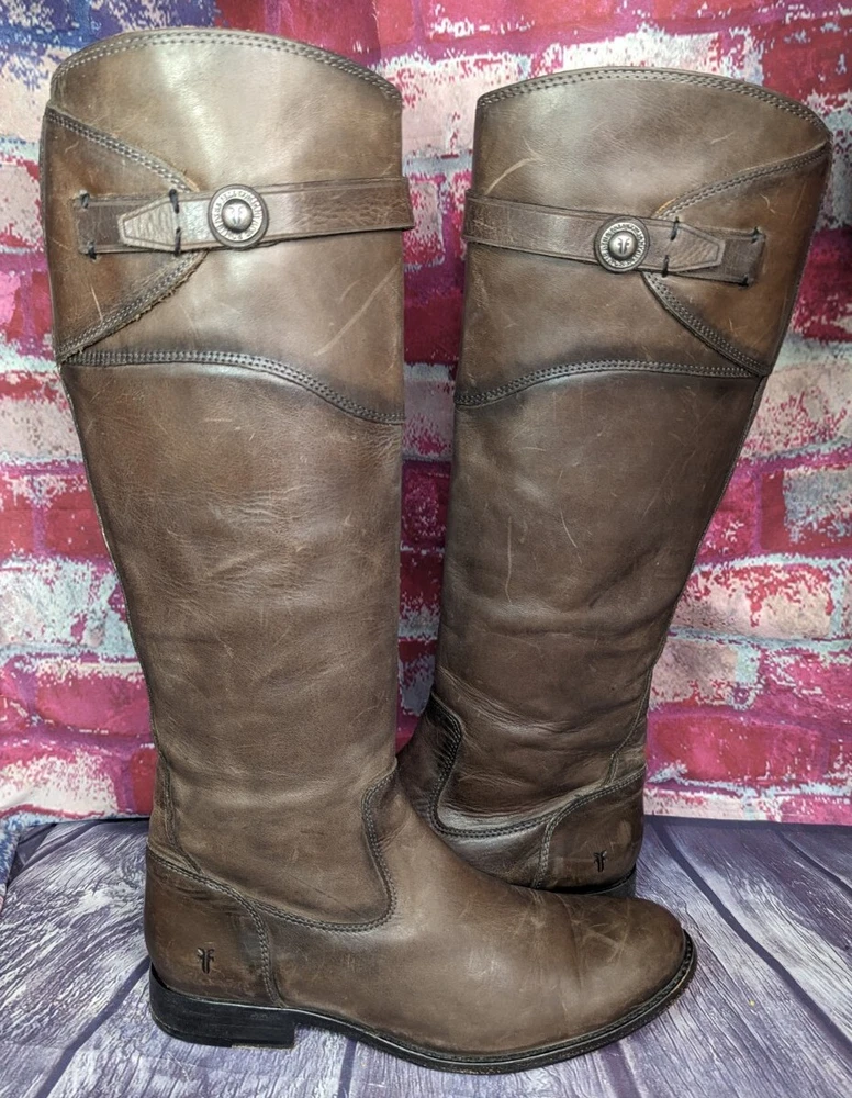 FRYE MOLLY BUTTON KNEE HEIGHT RIDING BOOTS - SIZE 8 B 100% Leather Imported Leather and Rubber sole Shaft measures approximately 15" from arch Heel measures approximately 1" 14" Circumference Knee-high riding boot with asymmetric opening and curved cuff with decorative logo buckle strap Full-length instep zipper
