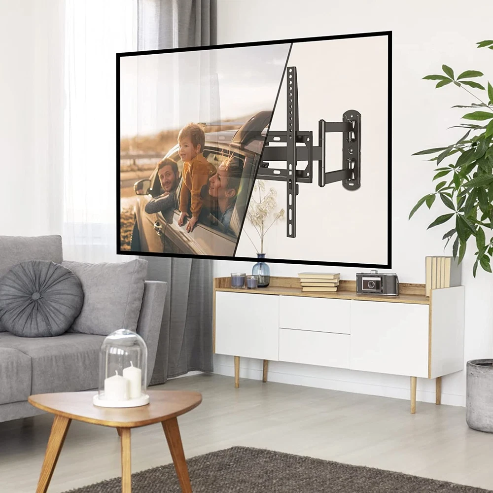 This Full-motion mount accommodates most 26"-55" flat panel TVs up to 77lbs. This mount extends out 14" from wall and allows full-motion capabilities. Full motion allows maximum flexibility — tilts and swivel your TV for easy viewing from any seat in a room. Its post-installation leveling adjustment ensures the TV is perfectly positioned on the wall. Integrated cable management system keeps cables organized and protected. FITS MOST SCREEN SIZES 26" - 55" Screen size support used as a general guideline only. Actual fit is determined by the VESA measurements and weight capacity of this mount. VESA measurements are your mounting hole distance on the back of your TV Supports TVs up to 77lbs (Triple Tested) Includes all mounting hardware required to install mount onto wall. Common screws included to install TV onto mount. These included screws will fit 95% of TV on the market. If you TV requires special screws, they will need to be purchased separtly from a hardware store. TV tiles +3/- 15 degrees Swivels freely from side to side VESA mounting compliant Max TV to wall distance: 14" Saftey Retaining Screw Color: Black Single stud mountable. Cable Management Great for corners