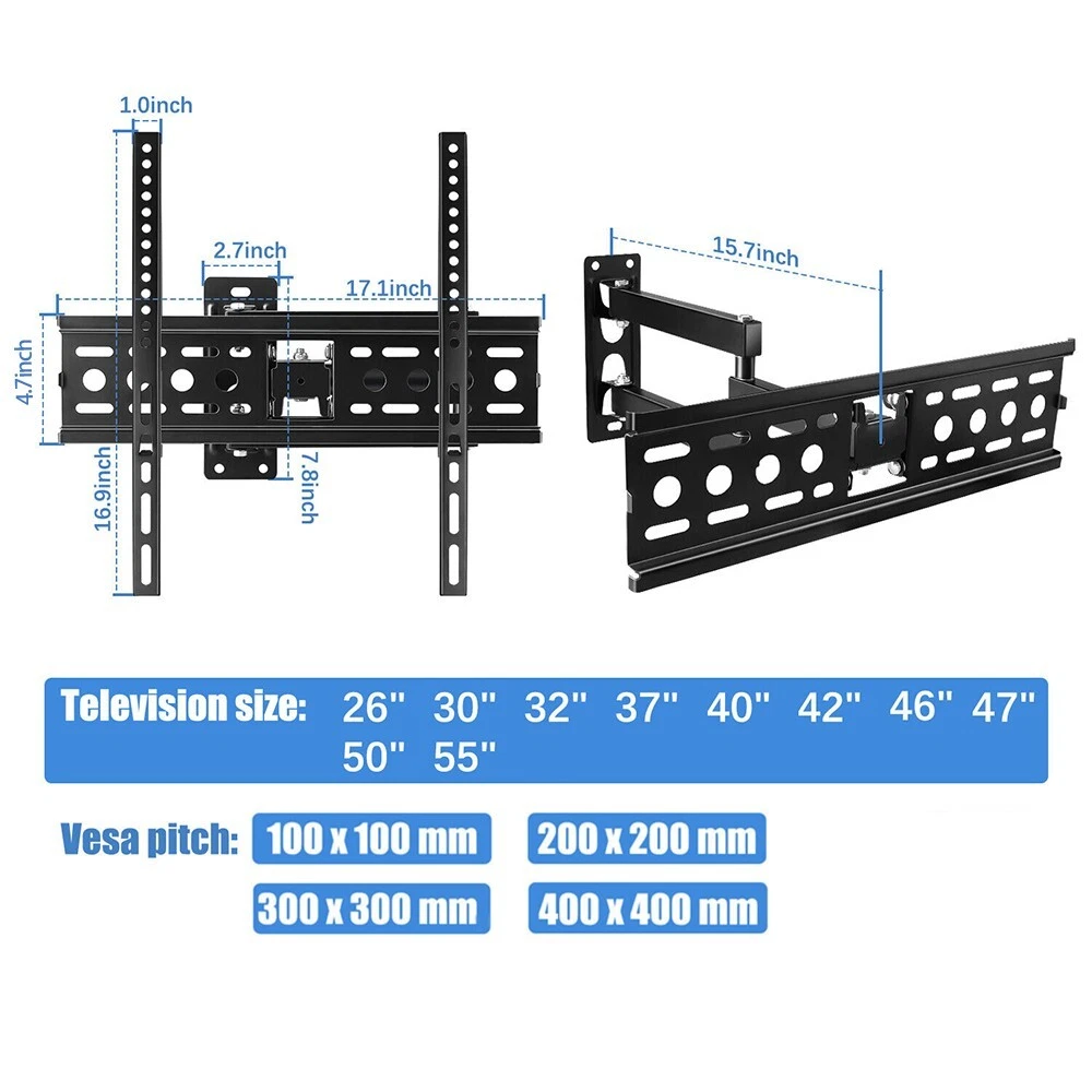 Double Layer Cat Litter Mat Trapping Honeycomb Soft Waterproof Kitty Litter Mat 12.34 USD 12.99 USD Free shipping 5% off BBQ Brush Scraper 18" Stainless Steel Oven Grill Tool Cleaning Three-Head New 11.39 USD 11.99 USD Free shipping 5% off 100 - 200 pcs 4" to 20" INDUSTRIAL WIRE CABLE ZIP UV NYLON TIE WRAPS 8.11 USD 8.54 USD Free shipping 5% off 100-200 X CABLE ZIP TIES Heavy Duty UV Resistant UL 4" 6" 8" 12" 15" 18" 24" 36" 6.64 USD 6.99 USD Free shipping 5% off Full Motion TV Wall Mount Bracket Swivel Tilt for 26 32 36 37 40 42 46 49 50 55" 19.94 USD 20.99 USD Free shipping 5% off Holder Kitchen Roll Towel Paper Rack Under Cabinet Wall Toilet Self Adhesive 10.44 USD 10.99 USD Free shipping 5% off 2/4 Pack Solar Firefly Lights 64 LED Solar Garden Lights for Outside Waterproof 17.09 USD 17.99 USD Free shipping 5% off Full Motion TV Wall Mount Bracket Swivel Tilt for 26 32 36 37 40 45 49 50 55 60" 23.74 USD 24.99 USD Free shipping 5% off Pop Up Privacy Shower Tent Portable Outdoor Shower Tent Camp Toilet Rain Shelter 31.34 USD 32.99 USD Free shipping 5% off 50× Disposable Shower Drain Hair Catcher Mesh Sticker Strainers for Shower Drain 12.63 USD 13.29 USD Free shipping 5% off Rectangle 3D Mesh Bath Pillow Spa Pillow With Suction Cup For Hot Tub Bathtub 13.53 USD 14.24 USD Free shipping 5% off 6 Pack Metal Wonder Closet Hanger Organizer Hook Space Saving Clothes Rack NEW 11.72 USD 12.34 USD Free shipping 5% off Product Description FULL MOTION SWIVEL TILT LCD LED TV WALL MOUNT BRACKET 26 32 40 42 43 47 50 55 Universal TV Mount - This TV wall bracket fits most 26,30,32,37,40,42,46,47,50,55 inch TVs with VESA patterns from 100x100mm to 400x400mm and holds up to 77 lbs. /35kg. Please CHECK TV weight, size, VESA, wood stud location, and input access before purchase. Optimised Viewing Experience - The full motion TV mount can swivel left or right 90°, tilts up 5°, tilts down 13°, and has +3°/-3° screen level adjustment capability. The swivel TV wall mount gives you the maximum flexibility to point your TV where you want. Perfect Center Design - Single stud TV mount is easy to center the TV or mount in the corner to save space. Articulating wall mount made of heavy duty steel ensures the strong arms to hold your TV stable. Automatic robot welding tech makes the whole TV mounting bracket sturdy and safe. Easy Installation - The wall TV mount comes with hardware mounting kit and step-by-step instructions for easy installation within 10 minutes. Concrete Anchors will be sent per request. All our wall mount TV brackets can not be installed on drywall alone. About Us Payment Shipping Returns Contact Us My friend, What a beautiful day! Thank you for choosing my store. Welcome to my store and see if you like these products. You are not just our customer, but our friend. If there is any product you need that we don't have, you can tell me, and I will update the product for you. In the process of purchasing the product, if you are satisfied, please give me a positive feedback, your encouragement will let me move on. If you have any dissatisfaction with my products or services, please let me know once and please do not leave bad feedback. If you have any questions, please contact me first. Best regards to you and your family. Thank you and have a great day! We accept PayPal and all forms of credit card. We will only ship to the confirmed Paypal shipping address given with the payment. We do not offer local pick up service. The shipping rates listed are only for residential or commercial destinations in the continental 48 United States. All international sales will go through eBay Global Shipping Program.please ask us if there are any questions. We only ship the item to the address that is sent to us at the time of checkout. Please verify the correct shipping address in your PayPal account before making your payment. If we ship your item to an old or invalid address and you are not able to locate the item, we are not responsible for shipping a replacement.Currently, we do not ship to Hawaii, Alaska, Puerto Rico,APO/FPO/PO Boxes. We use USPS, UPS & FedEx as shipping method. Payments cleared before 12 PM PST, will be shipped on the same day. 30 days Money Back Guarantee. If any package that needs to be returned, please contact our customer service first to receive a RMA form. All return items MUST be in brand new condition. Your five-star reviews help us grow and improve our business, and help us keep eBay fees down. Please give us positive feedback when the item arrives and you are satisfied. Please contact us before leaving any neutral or negative feedback. We always consider our customers to be our number one asset. Please feel free to let us know if there are any problems or inquiries with an item and we will take care of it for you. so that we can resolve the issue in the best way possible without having to open a case through eBay and without negative feedback. About Us My friend, What a beautiful day! Thank you for choosing my store. Welcome to my store and see if you like these products. You are not just our customer, but our friend. If there is any product you need that we don't have, you can tell me, and I will update the product for you. In the process of purchasing the product, if you are satisfied, please give me a positive feedback, your encouragement will let me move on. If you have any dissatisfaction with my products or services, please let me know once and please do not leave bad feedback. If you have any questions, please contact me first. Best regards to you and your family. Thank you and have a great day! Payment We accept PayPal and all forms of credit card. We will only ship to the confirmed Paypal shipping address given with the payment. We do not offer local pick up service. Shipping The shipping rates listed are only for residential or commercial destinations in the continental 48 United States. All international sales will go through eBay Global Shipping Program.please ask us