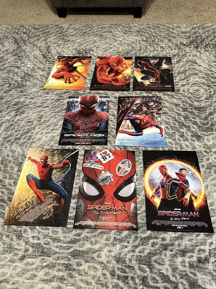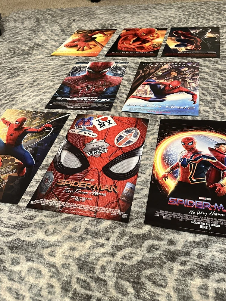 This lot includes authentic 11x17 posters of all of the 2024 Spiderman rereleases, featuring one poster from each movie. These original posters are a must-have for any movie memorabilia collector, and are sure to add some excitement to your collection. The posters are in great shape and ready to be displayed in your home or office. Don't miss out on this opportunity to own a piece of movie history. I was lucky enough to have one extra duplicate of each movies posters when I went to each and every screening myself. I took a full month and a half going to each movie to make this lot happen. Hope it’s worth it to the lucky fan who get’s it!