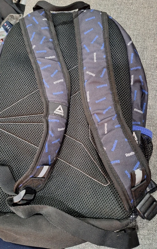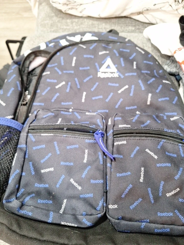 FULL SIZE REEBOK BACKPACK 17X 13 BLACK WITH BLUE AND WHITE ACCENTS PREOWNED