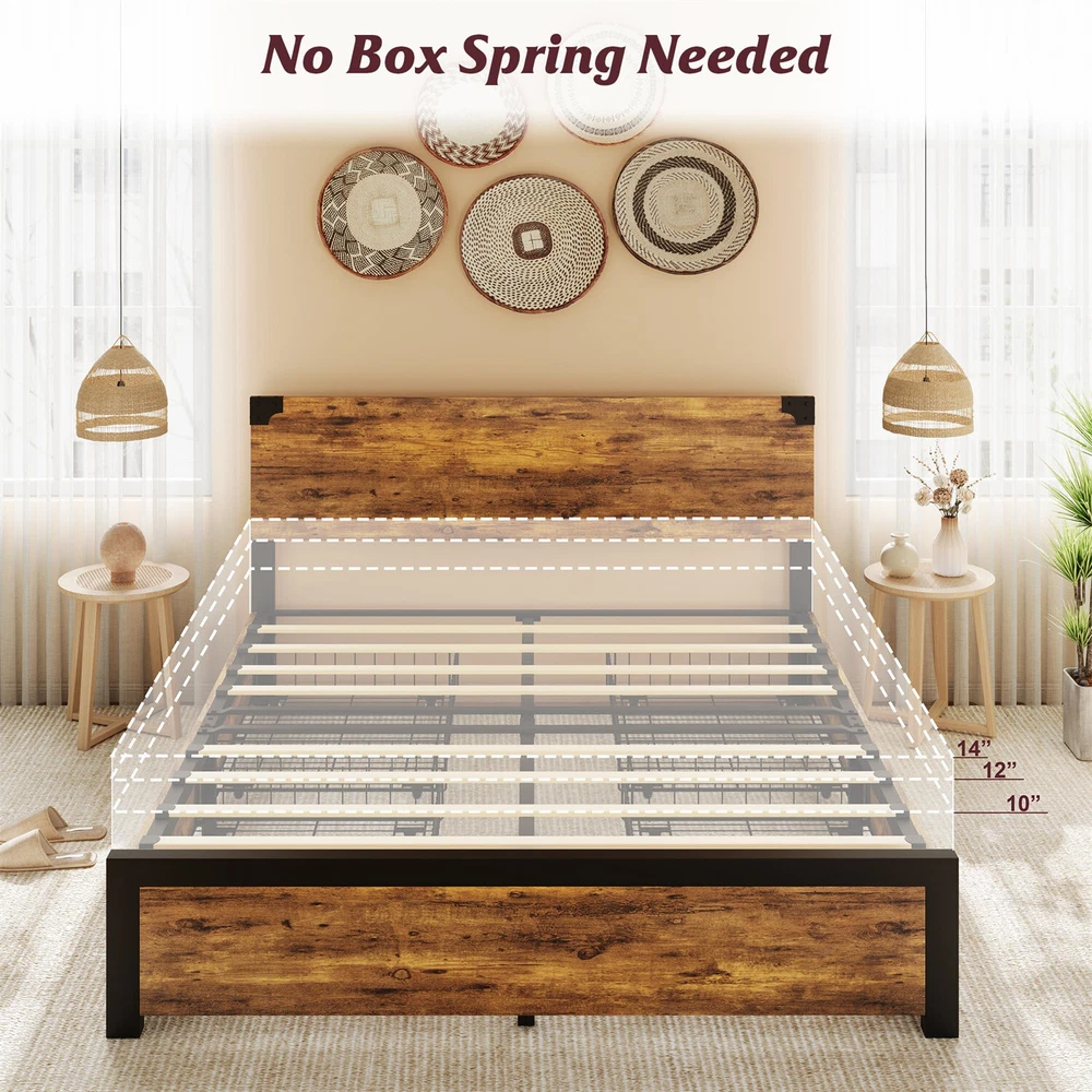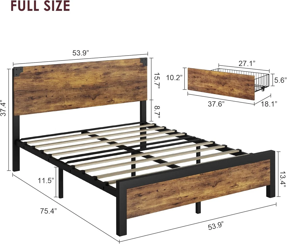 Large Storage Space: Bed frame FULL size comes with four removable drawers for under-bed storage, providing ample space to store bed sheets, off-season clothing, accessories, and more. Say goodbye to clutter and embrace a tidy bedroom. Sturdy FULL Size Bed Frame: 13 heavy duty metal slats are tightly arranged to ensure no noise or vibration. Additionally, 9 support legs provide a stable base for foam, latex, or spring mattresses. Recommended weight capacity: 700 pounds. User Friendly Design: Silicone anti-slip strips are pressed onto the slats to prevent noise. The integrated FULL metal frame in the middle enhances weight-bearing capacity. Plastic feet protect the floor from scratches. Each drawer has 2 fixed holes to prevent automatic sliding when closed. Industrial Style: The platform bed frame has great durability and stability, while the vintage wooden boards add to the natural and warm feeling of the room, making the decoration effect both durable and comfortable, adding a unique charm to your room. Installation: The FULL bed with storage provides detailed installation instructions, special assembly tools and numbered parts, which save you time and effort during installation, help you easily complete the assembly of the bed frame, and allow you to quickly enjoy a comfortable sleeping environment. Product Description GAOMON FULL bed with 4 Drawers and Headboard The combination of vintage wood panels and metal bed frame MDF adds a unique charm to your room. The FULL bed frame with storage drawers allow you to organize beddings, off-season clothing, socks, and more, making your room neater and more organized. The integrated metal frame connection is more conducive to load-bearing and stability. Each rib slat of platform bed is equipped with silent buckle, fixed the rib strip to prevent noise issued. Align it into the hole on the metal frame and the stabilizing bracket will not scratch out Size FULL Color Rustic Brown Weight 83.8 Lbs Material PB & Metal Dimensions 77.4"L x 57.1"W x 42.2"H Max. Load Capacity 1000 Lbs Package Includes 1 x Bed Frame, 4 x Drawers, 1 x Instruction, 1 x Accessory Bag Box Spring Required No Payment Delivery details Terms of sales About us Contact us Payment We accept payment either via PayPal or any of the following credit cards; Visa, MasterCard, Discover, and American Express. Wishing you a happy life! Delivery details We will provide you with the tracking number on the same day or the next day, and transport your package through UPS, DHL, FedEx and other courier methods. If you have any questions, please feel free to contact me and I will do my best to help you solve the problem. Wishing you a happy life! Terms of sales We offer a one month free return and exchange service, and you don't have to bear any losses. We will provide multiple solutions for you to choose from. If you have any questions, please feel free to contact me and I will do my best to help you solve them. We offer a two-year warranty period. If you have any quality issues with the product you purchased within two years, please feel free to contact me. I will provide you with a free replacement service. If you have any questions, please feel free to contact me. I will do my best to help you solve the problem. Wishing you a happy life! About us We are committed to becoming the best eBay seller, with high-quality suppliers, providing the most sincere service, including pre-sales and after-sales service, to give you a satisfactory shopping experience. If you have any questions, please feel free to contact me, and I will do my best to help you solve the problem. Wishing you a happy life! Contact us If you encounter any problems, please contact me by email at the first time, I will provide you with a solution as fast as possible so that I can give you a satisfactory shopping experience, wish you a happy life! Brand Merxeng Compatible Mattress Size Full Frame Material Metal Type Bed Frame Features No Box Spring Needed, with 4 Drawers Number of Drawers 4 Style Retro Room Bedroom Product Dimensions 77.4"L x 57.1"W x 42.2"H Item Weight 95 Pounds Maximum Weight Recommendation 700 Pounds 1000 Pounds