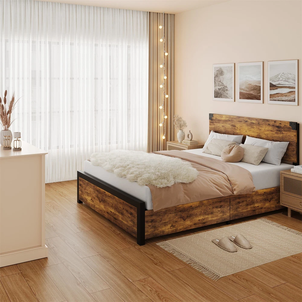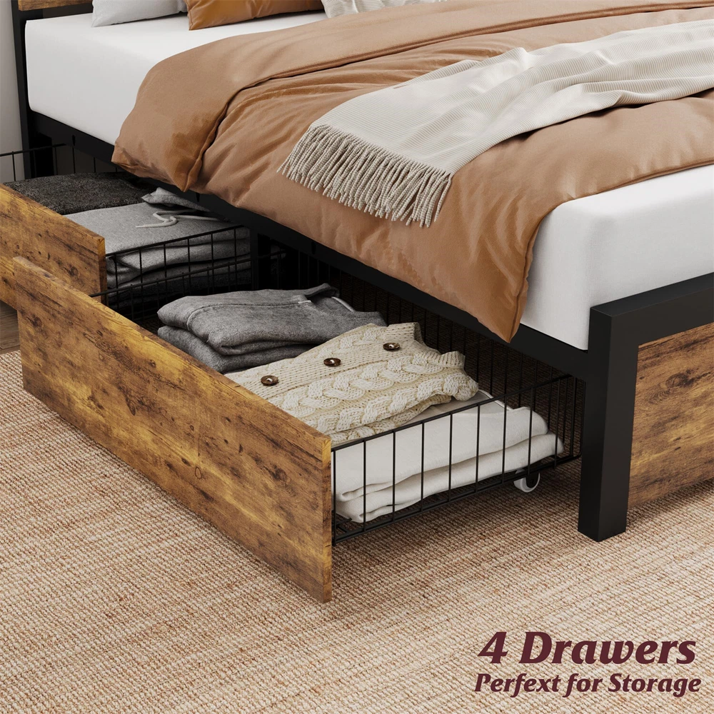 ✅FULL Size Bed Frme w/ 4 Drwers Pltform Metl Bed Frme with Wooden Hedbo