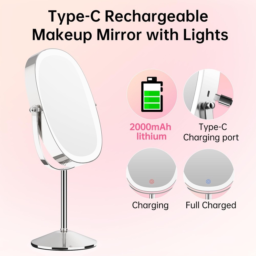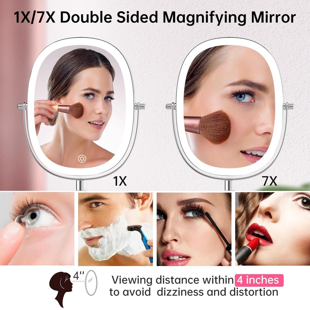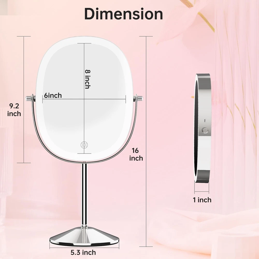 FUNTOUCH Lighted Makeup Mirror with Magnification, Oval 1X/7X Magnifying Mirror with Light, 3 Color Option Dimmable Rechargeable Light up Mirror, 360 Rotation Double Sided Magnified Lighted Mirror Product Details Color: Chrome Brand: FUNTOUCH MPN: SM392 makeup mirror UPC: Does not apply EAN: Does not apply Brand: FUNTOUCH Room Type: Office Shape: Oval Product Dimensions: 15"L x 9"W Frame Material: Metal Brand: FUNTOUCH Room Type: Office Shape: Oval Product Dimensions: 15"L x 9"W Frame Material: Metal Style: Modern Mounting Type: Dresser Mount Finish Type: Polished Special Feature: Rechargeable makeup mirror, Detachable lighted makeup mirror, Built in lithium battery, Double sided magnifying mirror Color: Chrome Theme: Modern Specific Uses For Product: Makeup Number of Pieces: 1 Number of Items: 1 Frame Type: Framed Item Weight: 2 Pounds Assembly Required: Yes Magnification Maximum: 7 x Manufacturer: Funtouch Item Weight: 2 pounds Country of Origin: China Item model number: SM392 makeup mirror Batteries: 1 Lithium Ion batteries required. (included) Date First Available: May 11, 2023 Oval Lighted Makeup MirrorThis makeup mirror with lights features an oval design and a large 8-inch mirror surface, making it perfect for perfect makeup. In addition, it is equipped with a 7X magnifying mirror to ensure that every detail is to the point. Do you need portability? No problem! The non-slip removable base protects you from slipping or tipping over. 1X/7X Magnifying Double SidedThis double-sided vanity mirror is your ultimate makeup companion. Use 1X side edges to enhance your overall makeup and skincare routine. But when precision is the key, eyeliner, eyebrows or lipstick - using a 7x magnified lighted mirror will provide you with detailed makeup observation. Warm Tips: When using a 7X magnifying mirror with light, please keep your face 4 in away from the mirror to avoid dizziness and distortion. Magnifying Makeup Mirror RechargeableThis magnifying mirror with light is powered by a built-in 2000mAh battery, which has a longer lifespan and saves the cost of battery replacement. In addition, the lighted makeup mirror is equipped with a Type-C charging cable (excluding the charger), which can enjoy 3-4 hours of use time when fully charged. 3 Color Lighting ModesThis lighted makeup mirror with magnification has 3 color lighting modes and 84 built-in LED lights, which can perfectly illuminate your face. Whether it's work, parties, or romantic dates, we will provide you with security. Simply short press the sensor switch to change the color of the makeup mirror light, meeting all your needs in different environments. 360 Degree Rotation & Stepless DimmingEasily achieve perfect angles and lighting through 360 degree rotation and stepless dimming. Just press the lighted makeup mirror with magnification touch button to turn the power on/off, and long press to adjust the brightness for any setting. long press to adjust the brightness of any setting. Perfect Gift and Satisfaction ServiceLooking for the perfect gift? Don't look anymore! Ouris makeup mirror with lights and magnification perfect for anyone on your gift list. In addition, we offer a 12 month warranty and a 60 day refund guarantee. If you have any problems with your makeup mirror, please feel free to contact us and we will replace it free of charge.