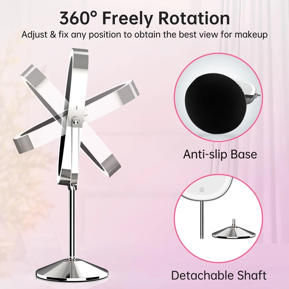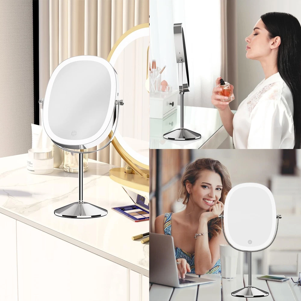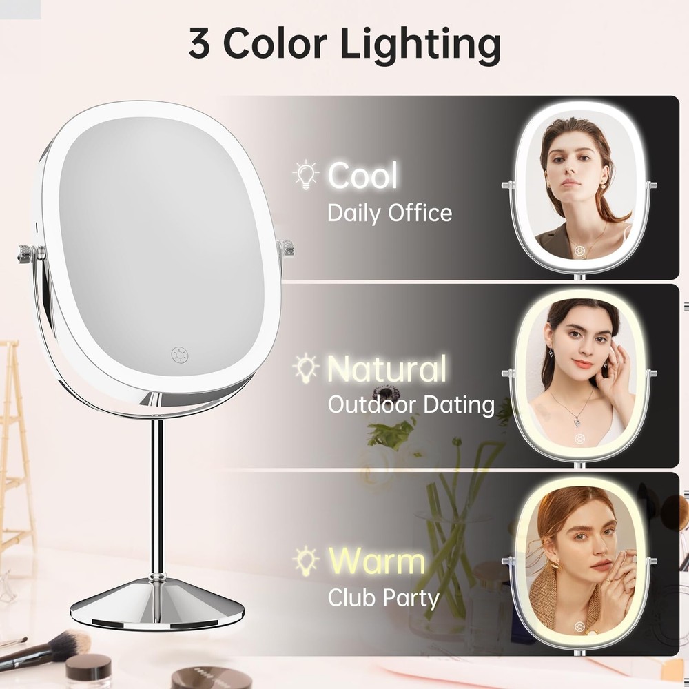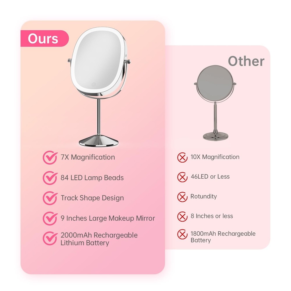 FUNTOUCH Lighted Makeup Mirror with Magnification, Oval 1X/7X Magnifying Mirror with Light, 3 Color Option Dimmable Rechargeable Light up Mirror, 360 Rotation Double Sided Magnified Lighted Mirror Product Details Color: Chrome Brand: FUNTOUCH MPN: SM392 makeup mirror UPC: Does not apply EAN: Does not apply Brand: FUNTOUCH Room Type: Office Shape: Oval Product Dimensions: 15"L x 9"W Frame Material: Metal Brand: FUNTOUCH Room Type: Office Shape: Oval Product Dimensions: 15"L x 9"W Frame Material: Metal Style: Modern Mounting Type: Dresser Mount Finish Type: Polished Special Feature: Rechargeable makeup mirror, Detachable lighted makeup mirror, Built in lithium battery, Double sided magnifying mirror Color: Chrome Theme: Modern Specific Uses For Product: Makeup Number of Pieces: 1 Number of Items: 1 Frame Type: Framed Item Weight: 2 Pounds Assembly Required: Yes Magnification Maximum: 7 x Manufacturer: Funtouch Item Weight: 2 pounds Country of Origin: China Item model number: SM392 makeup mirror Batteries: 1 Lithium Ion batteries required. (included) Date First Available: May 11, 2023 Oval Lighted Makeup MirrorThis makeup mirror with lights features an oval design and a large 8-inch mirror surface, making it perfect for perfect makeup. In addition, it is equipped with a 7X magnifying mirror to ensure that every detail is to the point. Do you need portability? No problem! The non-slip removable base protects you from slipping or tipping over. 1X/7X Magnifying Double SidedThis double-sided vanity mirror is your ultimate makeup companion. Use 1X side edges to enhance your overall makeup and skincare routine. But when precision is the key, eyeliner, eyebrows or lipstick - using a 7x magnified lighted mirror will provide you with detailed makeup observation. Warm Tips: When using a 7X magnifying mirror with light, please keep your face 4 in away from the mirror to avoid dizziness and distortion. Magnifying Makeup Mirror RechargeableThis magnifying mirror with light is powered by a built-in 2000mAh battery, which has a longer lifespan and saves the cost of battery replacement. In addition, the lighted makeup mirror is equipped with a Type-C charging cable (excluding the charger), which can enjoy 3-4 hours of use time when fully charged. 3 Color Lighting ModesThis lighted makeup mirror with magnification has 3 color lighting modes and 84 built-in LED lights, which can perfectly illuminate your face. Whether it's work, parties, or romantic dates, we will provide you with security. Simply short press the sensor switch to change the color of the makeup mirror light, meeting all your needs in different environments. 360 Degree Rotation & Stepless DimmingEasily achieve perfect angles and lighting through 360 degree rotation and stepless dimming. Just press the lighted makeup mirror with magnification touch button to turn the power on/off, and long press to adjust the brightness for any setting. long press to adjust the brightness of any setting. Perfect Gift and Satisfaction ServiceLooking for the perfect gift? Don't look anymore! Ouris makeup mirror with lights and magnification perfect for anyone on your gift list. In addition, we offer a 12 month warranty and a 60 day refund guarantee. If you have any problems with your makeup mirror, please feel free to contact us and we will replace it free of charge.