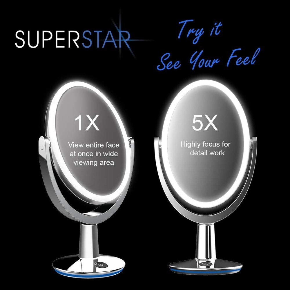 FVLFIL Biomax Superstar Oval Shaped Dual-Sided Lighted Makeup Mirror, 1X/5X Magnifying Vanity Makeup Mirror, 360 Degree Rotating Adjustable Brightness Mirror, Brushed Nickel Product Details Brand: FVLFIL Room Type: Bedroom Shape: Oval Product Dimensions: 17.7"L x 6.7"W Frame Material: Premium Pearl Nickel Brushed, Shiny & Smooth Brand: FVLFIL Room Type: Bedroom Shape: Oval Product Dimensions: 17.7"L x 6.7"W Frame Material: Premium Pearl Nickel Brushed, Shiny & Smooth Style: Modern Mounting Type: Floor Mount Finish Type: Brushed Surface Recommendation: Glass Special Feature: dual_sided, magnifying, lighted Color: Silver Theme: Space Specific Uses For Product: Dressing, Makeup Number of Pieces: 100 Number of Items: 1 Material: Glass, Plastic Frame Type: Framed Item Weight: 5 Pounds Assembly Required: No Frame Color: brushed nickel Magnification Maximum: 5 Manufacturer: Lomak Industrial Company Ltd UPC: 704078999593 Item Weight: 5 pounds Country of Origin: China Item model number: 552000018 Is Discontinued By Manufacturer: No Date First Available: March 25, 2020 SUPERSTAR is an elegantly designed, oval-shaped, dual-sided lighted makeup mirror with a brushed nickel finish on plastic, effectively preventing moisture and condensation. It features the True Lux lighting system, offering ultra-clear, distortion-free mirrors for a flawless beauty experience. Equipped with 192 high-quality, long-lasting LEDs, SUPERSTAR delivers optimal daylight effects at a brightness level of 875 LUX, ensuring even illumination across the face. The brightness is adjustable between 60% and 100%, controlled by holding the on/off switch. A short press turns the light on or off, catering to various makeup needs for a more refined look. The signature touch switch, combined with an intelligent memory function, allows for simple brightness adjustments and retains the users preferred light level. Additionally, the smart timer automatically turns off the light after 30 minutes. Dual-Sided Mirror: The 360-degree rotating, dual-sided oval mirror offers 1X and 5X magnifications, providing superb reflection, clarity, and distortion-free viewing. Nightlight: SUPERSTAR includes an ambient light setting that projects a blue halo in night environments, creating a romantic and warm atmosphere. It is powered by an AC adapter. The SUPERSTAR Dual-sided Lighted Vanity Mirror features an elegant chrome finish designed to resist moisture and condensation. Equipped with the True Lux lighting system, it provides ultra-clear, distortion-free mirrors for a flawless beauty experience. The mirror boasts 192 long-lasting, high-quality LEDs that can operate up to an impressive 100,000 hours during regular use. The package includes an AC adapter, user manual, and warranty card.