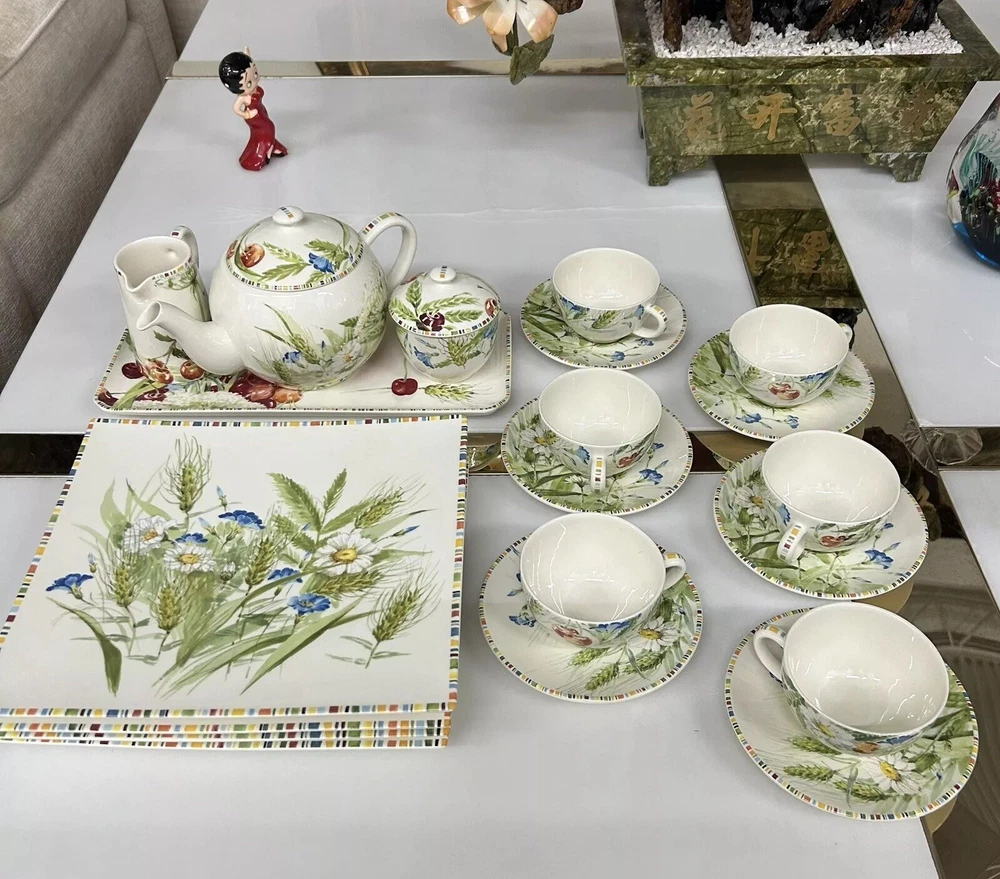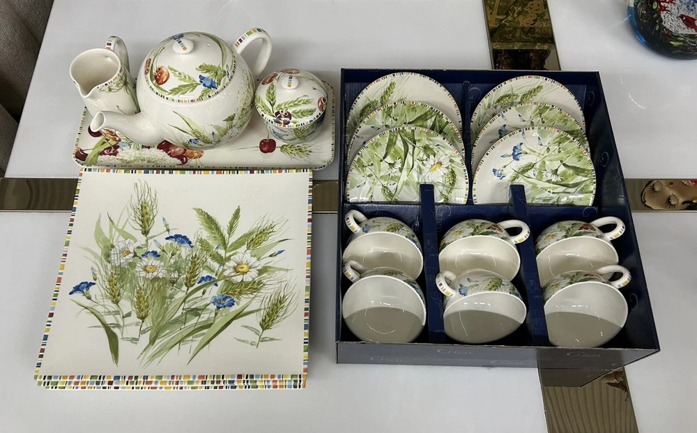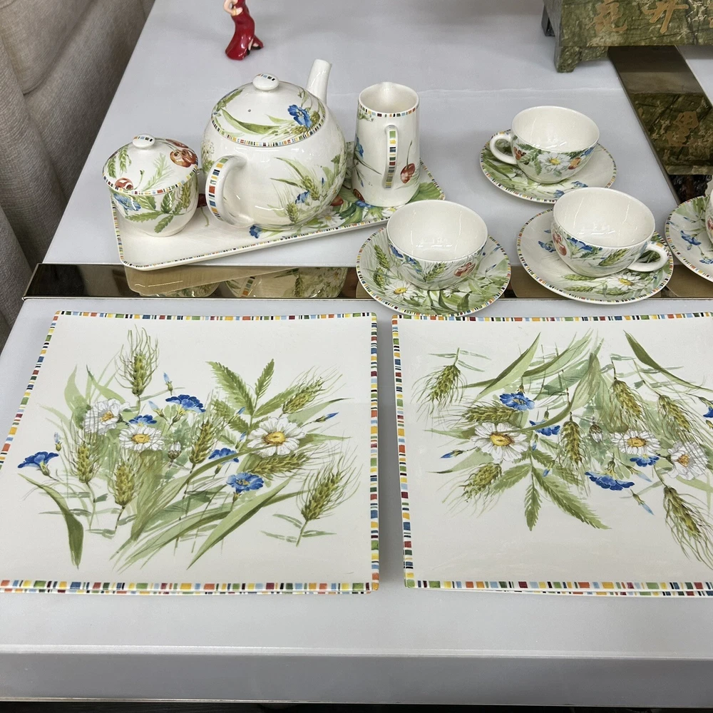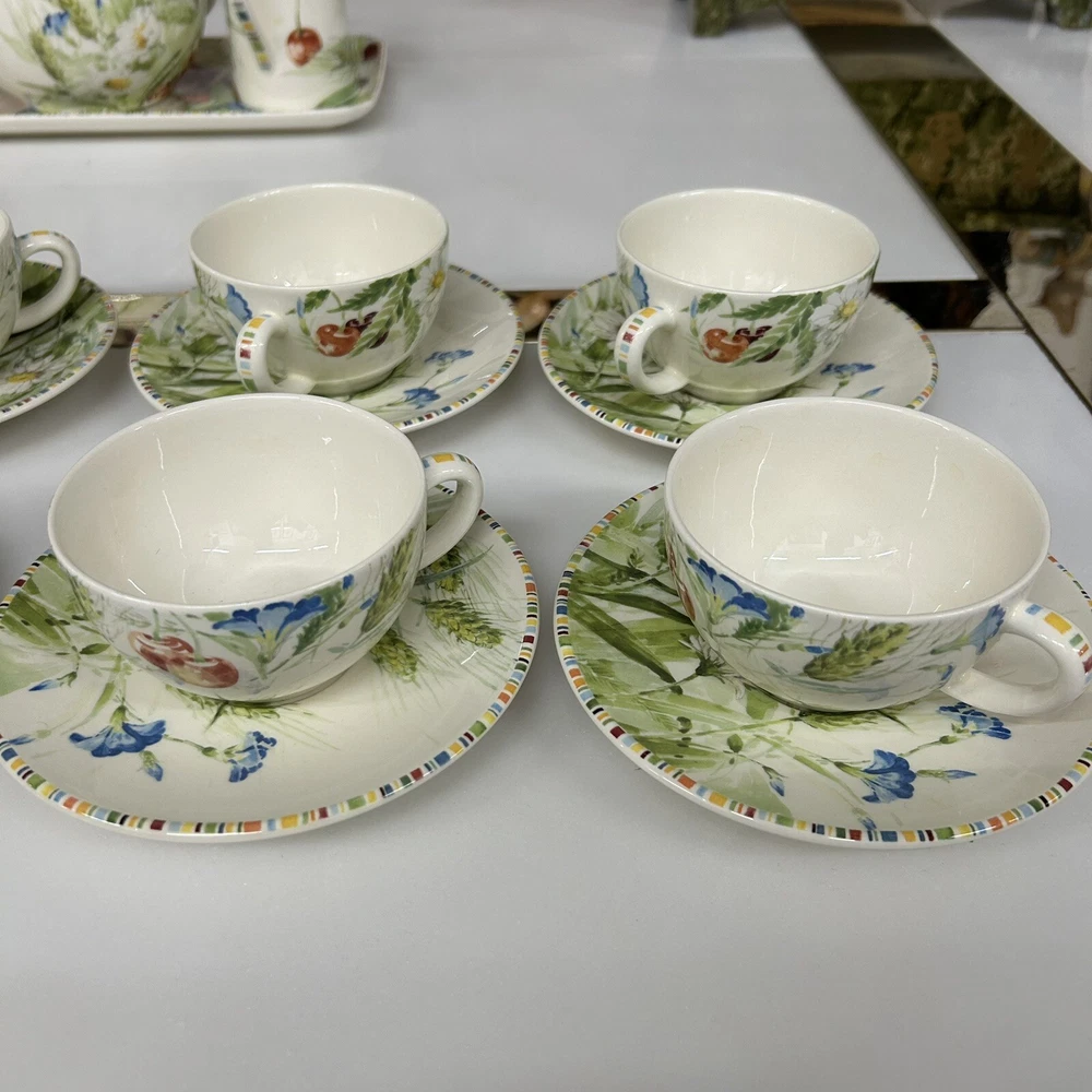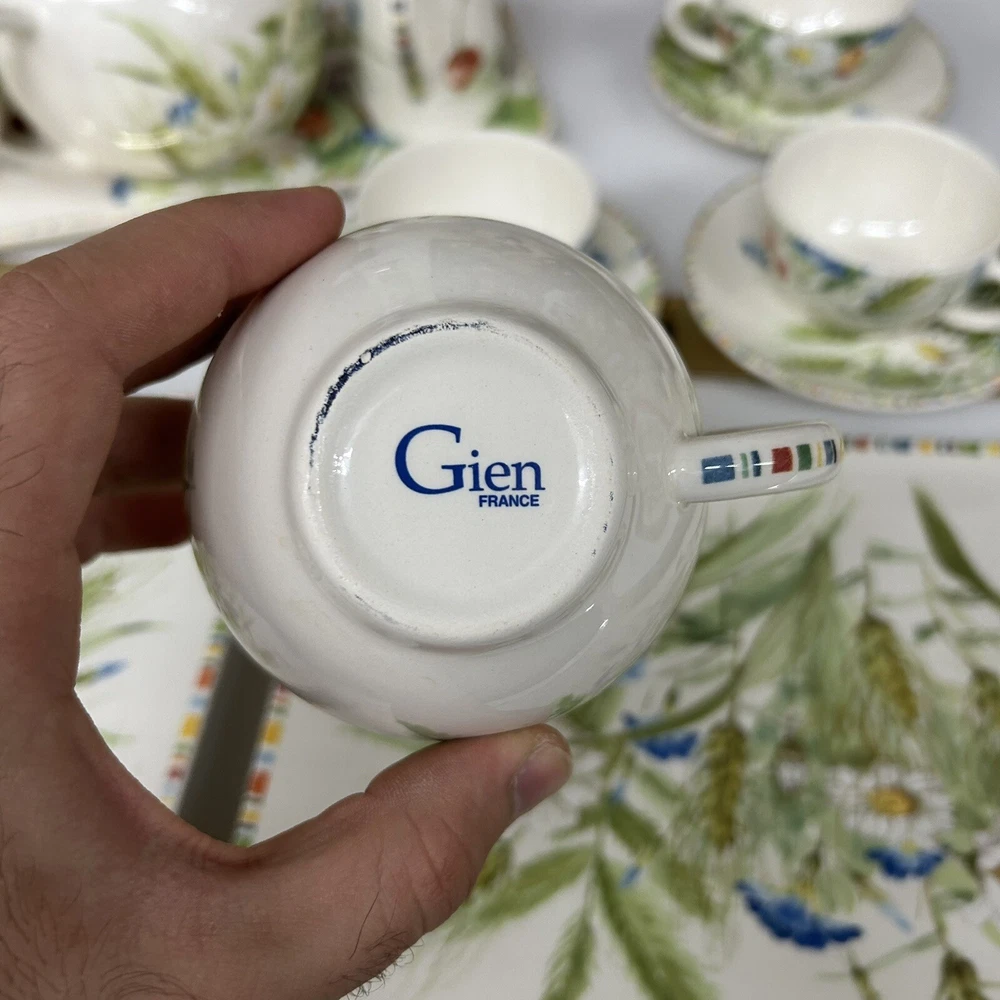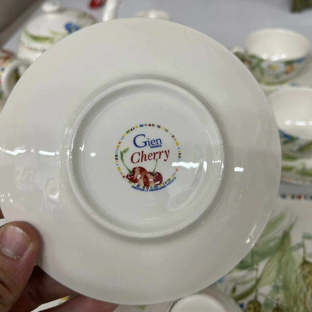 This beautiful Faïencerie de Gien Cherry Full Breakfast Set in the GIECHER pattern is the perfect addition to any collector's kitchen. Made in France using traditional pottery techniques, this vintage set includes a round plate, cup, and plate set. The multicolor design features a charming cherry motif that adds a touch of whimsy to any table setting. Crafted from a combination of porcelain and ceramic, this set is both durable and functional. Ideal for breakfast or any special occasion, this Gien brand set is sure to impress. In perfect condition no damage