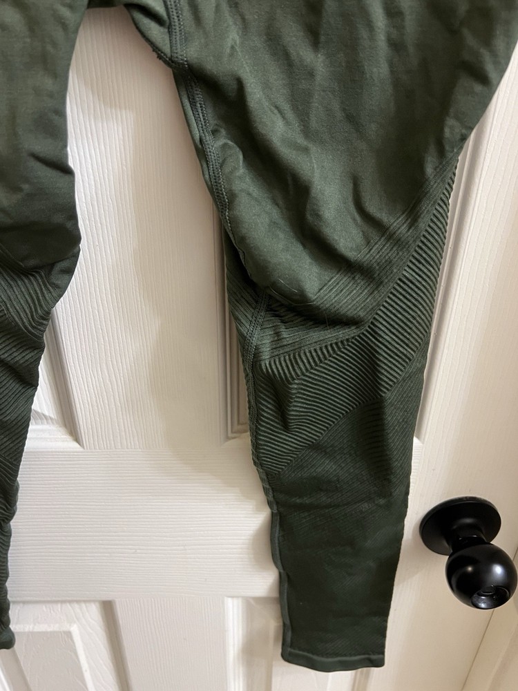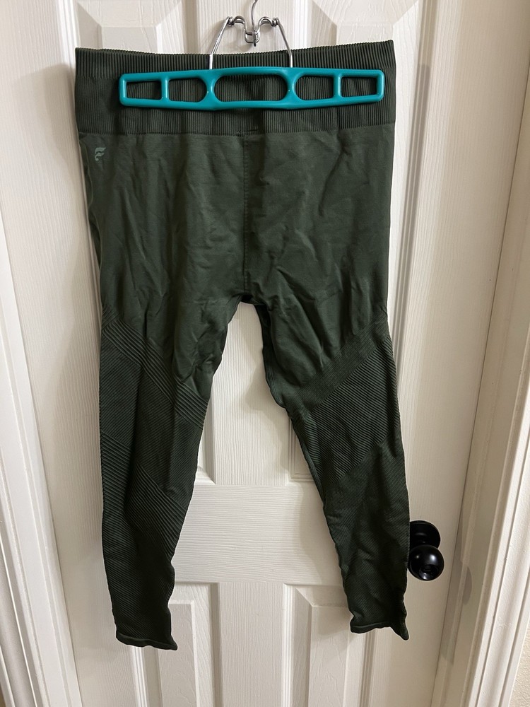 These Fabletics leggings in olive green are perfect for women looking for comfortable and stylish activewear. Made from a blend of polyester, nylon, and spandex, these leggings are suitable for various activities such as yoga, running, and cross training. They feature a logo accent, pockets for convenience, and are machine washable for easy care. The medium size and regular fit make them a versatile option for both casual wear and workouts.