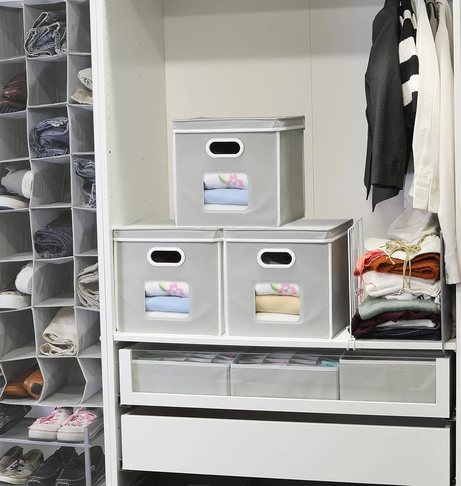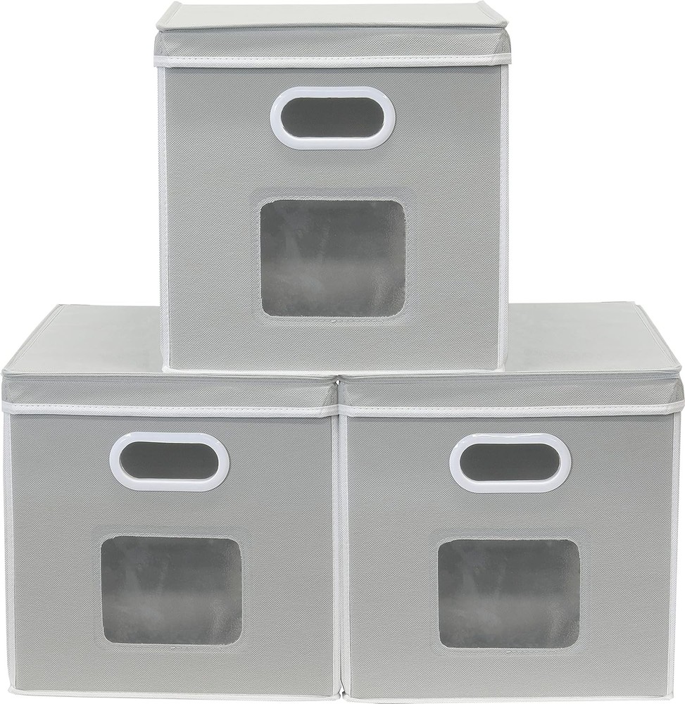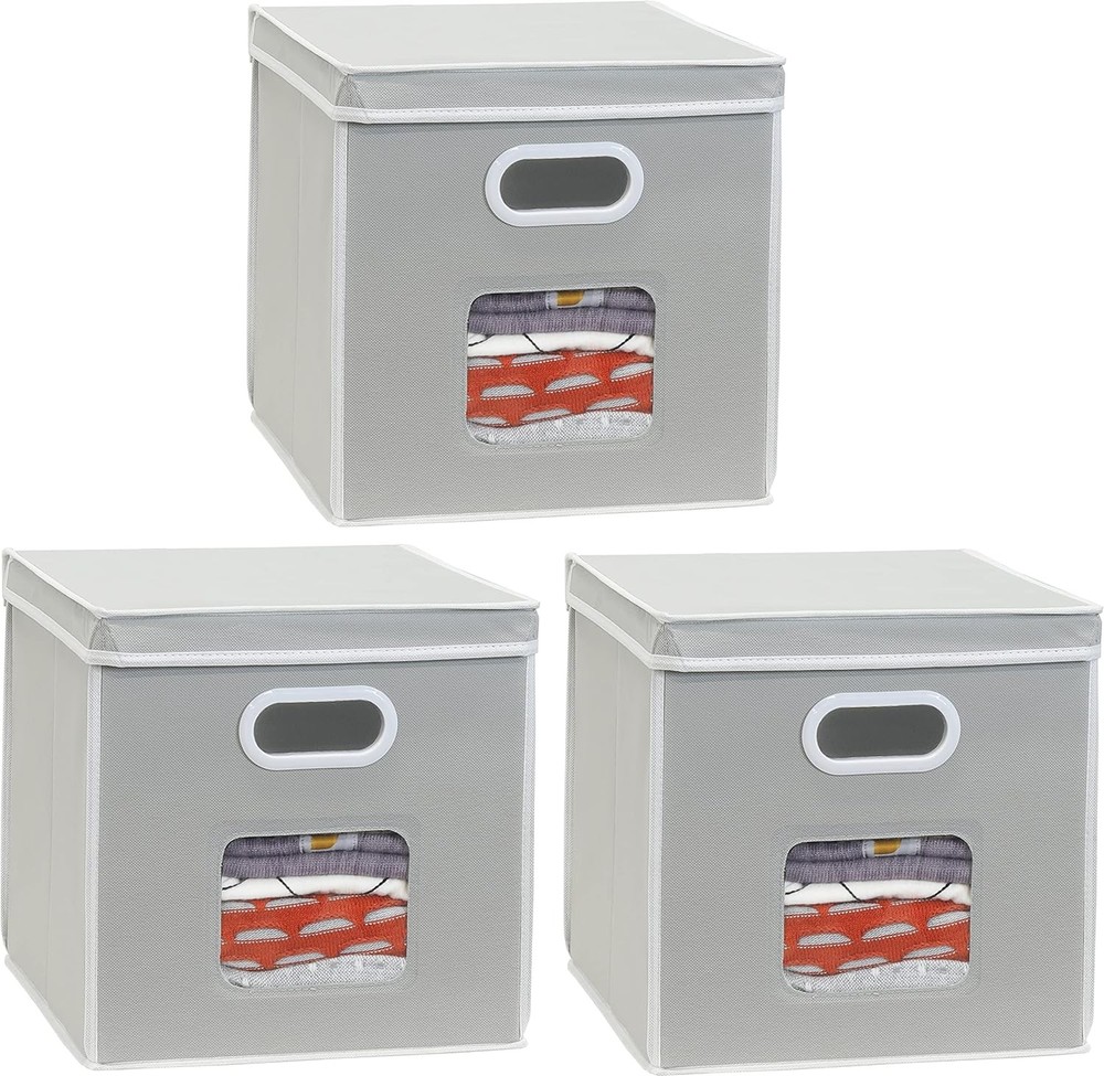Clear Window Design: Front window makes it easy to see what's inside, perfect for quick access and organization Removable Stick-On Lid: Lid can be easily attached or removed with a self-adhesive strip for flexible storage Lightweight but Sturdy: Reinforced with 6 heavy-duty cardboard panels, including the lid and bottom, to hold shape well Stackable & Foldable: Stack to save space or fold flat when not in use Practical Size: Measures 12" L x 12" W x 12" H, great for storing clothes, toys, books, and more