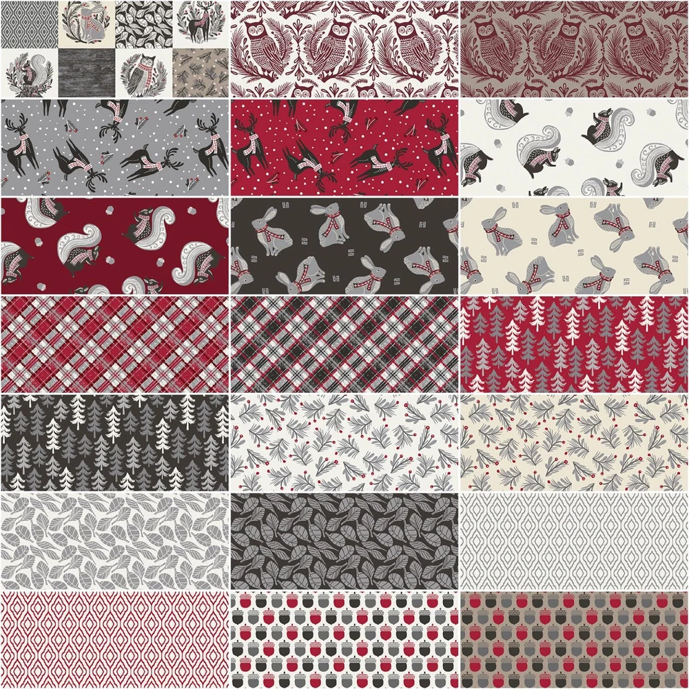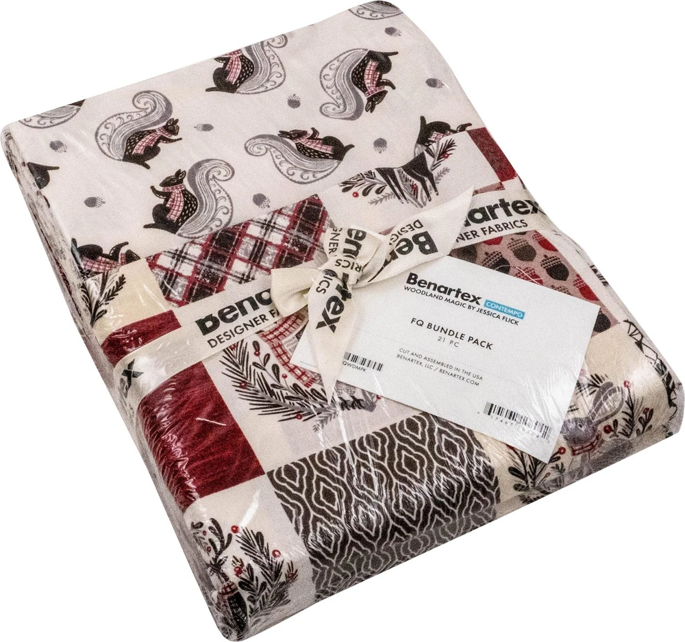 Fabric bundle of 21 18-inch by 22-inch fat quarters from the Woodland Magic collection by designer Jessica Flick for . Trendy colors and stylish prints make this Woodland truly Magic! Charming owls, deer, bunnies, and squirrels frolic through the wilderness, all decked out in their tartan scarves. Coordinates featuring trees, berries and acorns bring the collection to life; while the neutral color palette with pops of red bring an air of sophistication to the collection. Playful yet elegant, these fabrics are perfect for every trend setter! Woodland Magic collection from Designed by Jessica Flick Fat Quarter Bundle includes 21 18-inch by 22-inch fat quarters 100% Cotton; premium quilt shop quality fabric