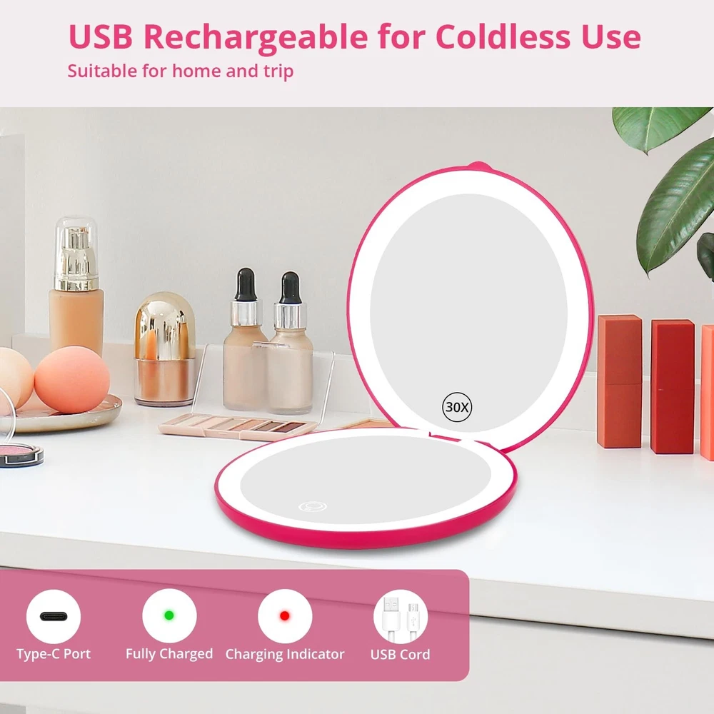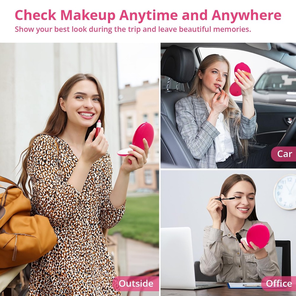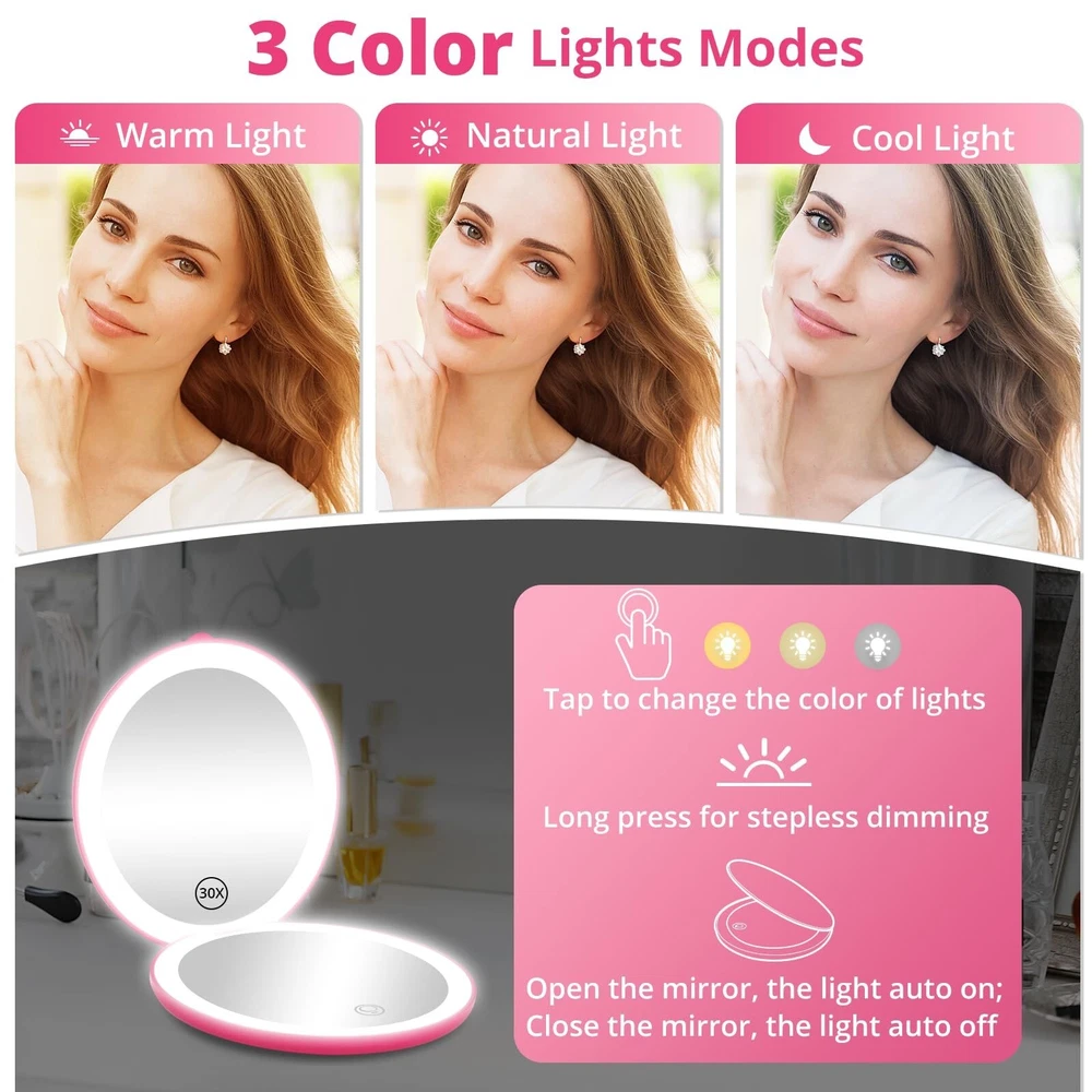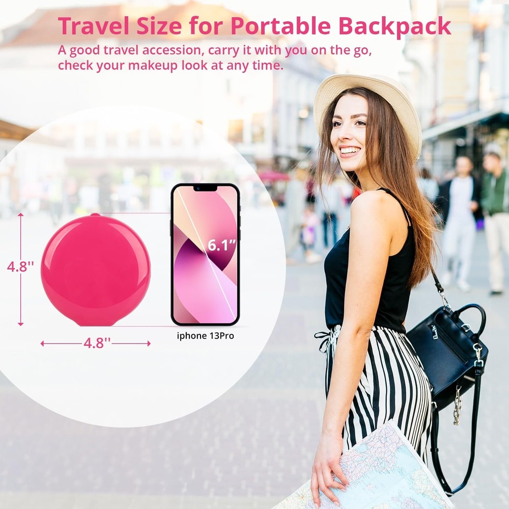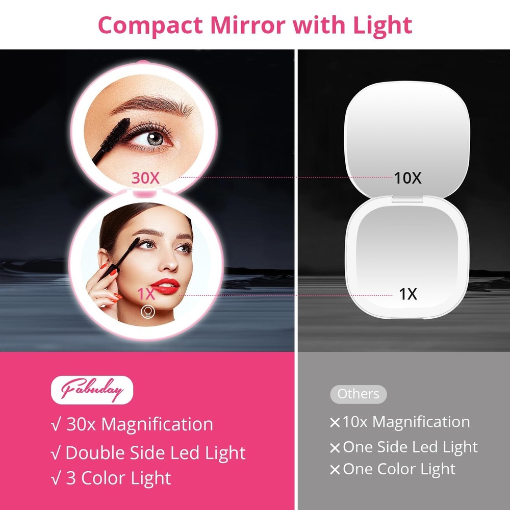 Fabuday Travel Compact Magnifying Makeup Mirror - 1x/30x Led Lighted Foldable Small Pocket Mirror with 3 Color Light, Rechargeable Portable Make Up Magnified Lighting Hand Mirrors for Purse, Berry Product Details Brand: Fabuday Room Type: Dressing Room, Bathroom, Bedroom, Living Room Shape: Round Product Dimensions: 4.84"L x 4.72"W Frame Material: Plastic Brand: Fabuday Room Type: Dressing Room, Bathroom, Bedroom, Living Room Shape: Round Product Dimensions: 4.84"L x 4.72"W Frame Material: Plastic Style: Modern Mounting Type: Tabletop Mount & Hand Hold Special Feature: 180 Degree, 2-Sided, Cordless, Compact, Magnifying Color: Berry Theme: Travel, Beauty, Trip Specific Uses For Product: Beauty, Travel, Makeup, Workout, Camping Number of Pieces: 1 Number of Items: 1 Material: Glass, Plastic Frame Type: Framed Item Weight: 0.42 Pounds Assembly Required: Yes Frame Color: Berry Manufacturer: Dealer Well Item Weight: 6.7 ounces Country of Origin: China Item model number: 211 Date First Available: May 24, 2024 Travel Essentials for Women - Fabuday travel mirror has a cute mini size to fits pocket, backpack, purse, bag, luggage. You could carry it on the go for traveling, business trip, road trip, camping etc. A must have travel gift for women. They will love it and won't let it go Stay Gorgeous and Confident - Check your makeup anytime and anywhere to make sure your makeup stays in perfect condition. Show your confidence at any time and have a beautiful traveling time Double Sided 1x/30x Mirror - Upgraded lighted mirror provides strong 30x magnification, the image is clearer and specific than 20x & 10x. Make you more efficient in doing face beauty, checking skin and hair style, and eyelash makeup. Also a must makeup mirror for older eyes 3 Color Light & Brightness Adjustable - Electric illuminated mirror provides warm/natural/cool light to meet the makeup needs of date/outside/office. Tap the sensor to turn ON/OFF the lighting, long press 3s to adjust the brightness. The light will automatically turn on or off as the mirror opens and closes Rechargeable Foldable Mirror - Light up face mirror built-in 800 mAh lithium battery, suitable for home and trip, meets your cordless use need. It can be continue to light up 3 hours in the highest brightness state,only takes 1.5-2 hours to fully charge The mirror. It comes with type-c cable