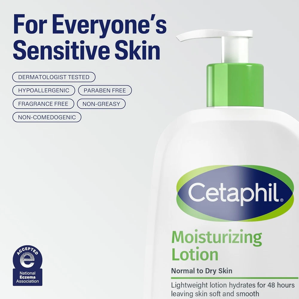 CETAPHIL BODY MOISTURIZING LOTION FOR ALL SKIN TYPES: Lightweight, fast absorbing, non-greasy body lotion that's ideal for use on the entire body INSTANTLY SOOTHES AND PROVIDES 48 HOUR HYDRATION: Immediately boosts skin hydration and continues to strengthen skin moisture barrier throughout the day IDEAL FOR USE ON THE ENTIRE BODY: Non-greasy, formula absorbs quickly and is excellent for hands, feet, elbows and knees DERMATOLOGIST BACKED INGREDIENT BLEND: With hydrating glycerin and skin essential vitamins B5 (panthenol) and B3 (niacinamide) DEVELOPED FOR EVEN THE MOST SENSITIVE SKIN: The hypoallergenic, non-comedogenic formula is free of parabens and fragrance DEFENDS AGAINST 5 SIGNS OF SKIN SENSITIVITY: Dryness, irritation, roughness, tightness and a weakened skin barrier Find skin care that works for you with CETAPHIL Moisturizing Lotion, a lightweight and fast absorbing moisturizer designed to comfort and hydrate all skin types. The unique formulation of skin essential vitamin E and 6 moisturizing ingredients provides instant lightweight hydration that leaves skin soft and smooth. And now formulated with a new blend of key ingredients: hydrating glycerin, panthenol (vitamin B5) to hydrate, soothe and preserve the skin barrier, and niacinamide (vitamin B3) to help smooth skin texture and retain skin moisture barrier. Water binding agents deeply replenish the skins moisture and prevent moisture loss, providing long lasting 48 hour hydration that completely restores the skins moisture barrier in one week, helping to defend against 5 signs of skin sensitivity. Fragrance free, lanolin free, paraben free and sulfate free, this gentle lotion is clinically tested for even the most sensitive skin. Treat your skin right thanks to the gentle, non-comedogenic formula, providing instant, everyday moisturizing care that leaves skin immediately feeling soft, smooth and replenished.