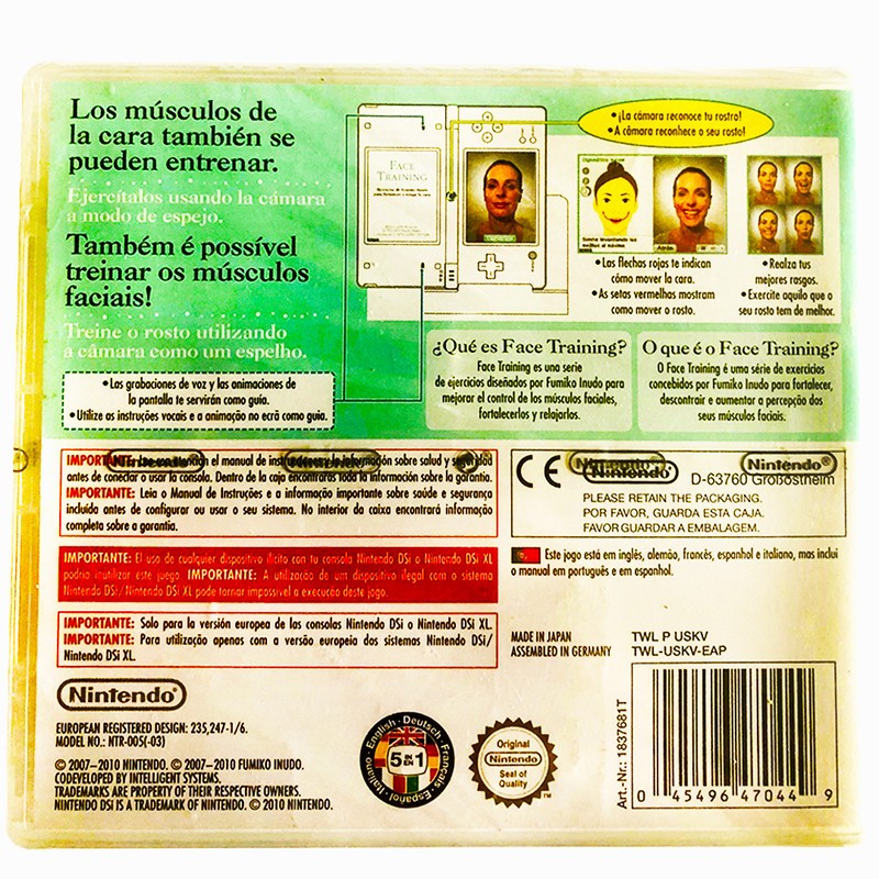 Nuestra tienda Perfil del vendedor Reputacion Guardar vendedor Contactar Face Training Videojuego Nuevo Precintado Buen Estado Nintendo DS NDS Face Training Videojuego Nuevo Precintado Buen Estado Nintendo DS NDS El objetivo de este videojuego, que se ha creado en cooperación con la esteticista japonesa especialista en expresión facial Fumiko Inudo, es el de mover los músculos de la cara, así como mejorar la circulación de la sangre, aliviar la rigidez y conseguir un tono saludable de piel. contiene más de quince ejercicios guiados que colaboran en preservar la vitalidad y expresividad del rostro. Es muy importante trabajar "los músculos oculares, pasamos muchos horas frente al ordenador" ha advertido la especialista en gimnasia facial. Es un juego de entrenamiento facial que es capaz de leer varias expresiones hechas con la cara del usuario. El juego fue uno de los muchos videojuegos de Touch Generations, y lamentablemente no salió a la venta en Estados Unidos ni fuera de Europa o Japón. Pago Compradores nacionales comprarán a través de Transferencia Bancaria (ING DIRECT), PayPal o Google Pay. Maximo periodo de tiempo para realizar el pago 7 días después de la compra. Mayoría de formas de pago están disponibles en el proceso Pago y envío. Garantía al cliente de eBay, se aplica cuando se paga con PayPal, o tarjeta de crédito o débito. Envío Todos los envíos son Certificados y se hacen a través de Correos, con Numero de Seguimiento. Tiempo de manipulación constará entre 0 y 2 días para enviar el artículo. Por la compra combinada de varios artículos se sumará 2¬ adicionales por el segundo artículo. Los artículos comprados irán debidamente protegidos para que lleguen en perfecto estado. Devoluciones Solo se aceptan devoluciones los 14 días siguientes a la recepción del artículo y por una causa justificada. Sustitución por otra unidad del mismo artículo si se dispone de él. Sustitución por otro artículo diferente si el comprador está de acuerdo. Devolución del importe.