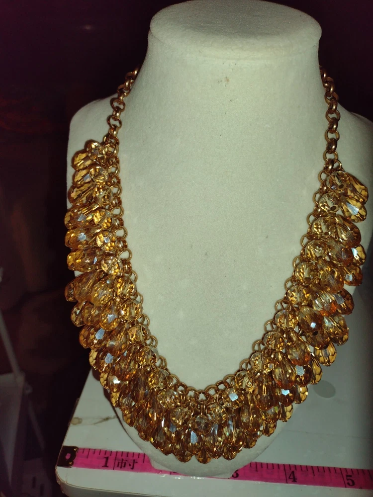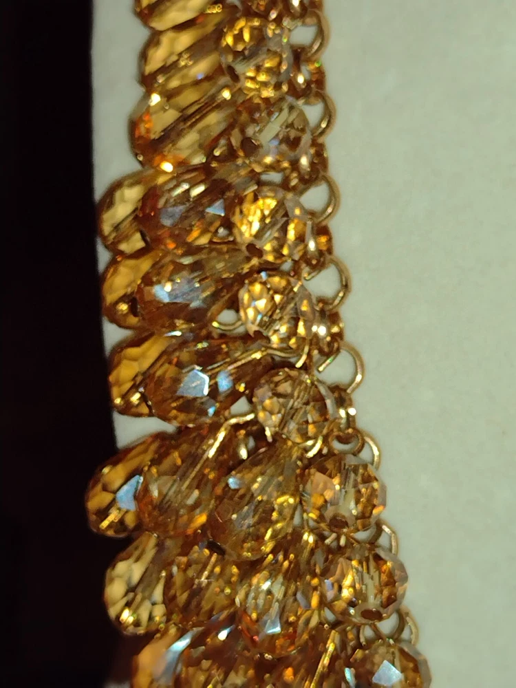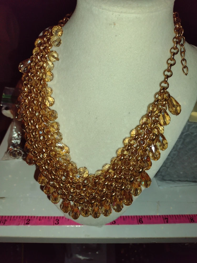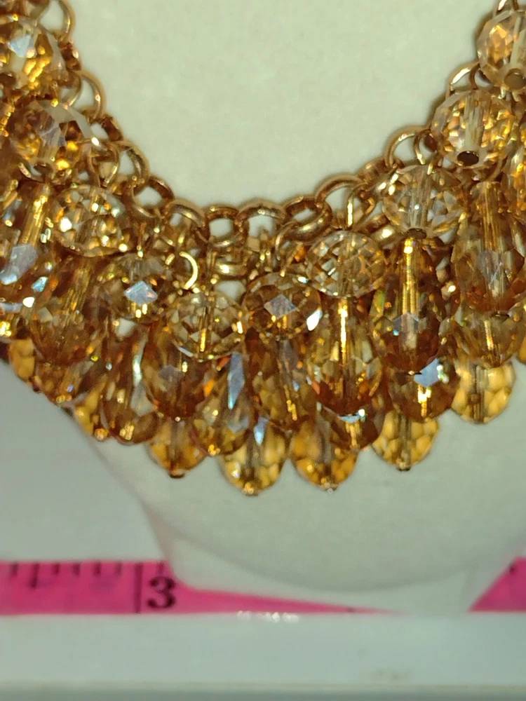 This classy and bold statement necklace features a beautiful teardrop-shaped champagne crystal as its main stones, set in a gold-tone mesh chain. The necklace is adorned with faceted beads, creating a stylish and eye-catching design. With a lobster closure and a length of 18 inches, this piece exudes a blend of beauty, bohemian, ethnic, and fashion & costume themes, making it a versatile accessory for various occasions. **Any wear or discoloration (for example near/on clasps) is commeserate with the age and pre-loved nature of the pieces I list. Items may need a gentle wipe down. I price fairly based on comparables when available. I'd like this experience to be fun. Good luck and thank you 🕊️