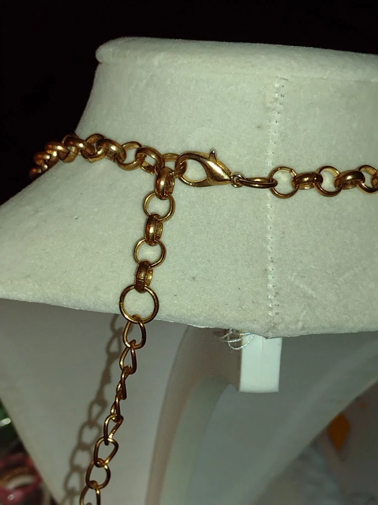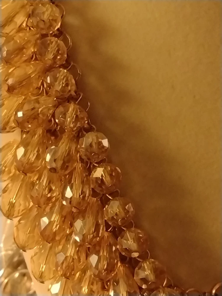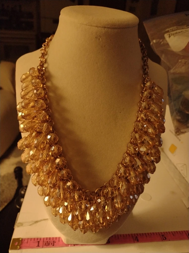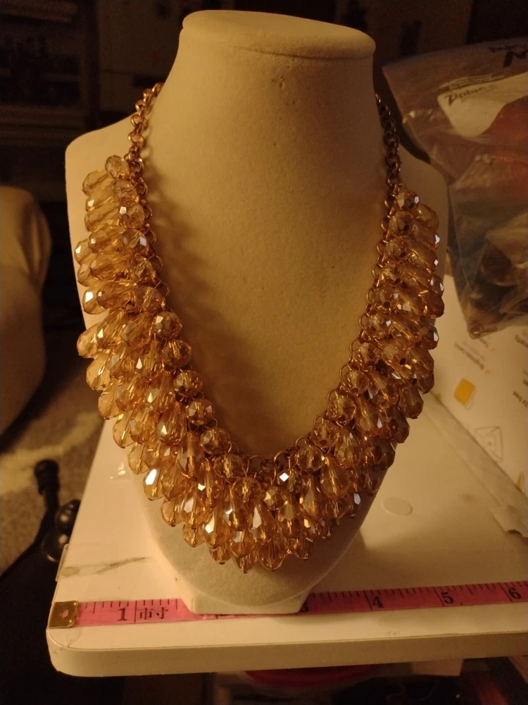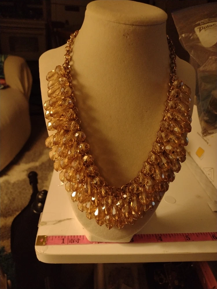 This classy and bold statement necklace features a beautiful teardrop-shaped champagne crystal as its main stones, set in a gold-tone mesh chain. The necklace is adorned with faceted beads, creating a stylish and eye-catching design. With a lobster closure and a length of 18 inches, this piece exudes a blend of beauty, bohemian, ethnic, and fashion & costume themes, making it a versatile accessory for various occasions. **Any wear or discoloration (for example near/on clasps) is commeserate with the age and pre-loved nature of the pieces I list. Items may need a gentle wipe down. I price fairly based on comparables when available. I'd like this experience to be fun. Good luck and thank you 🕊️