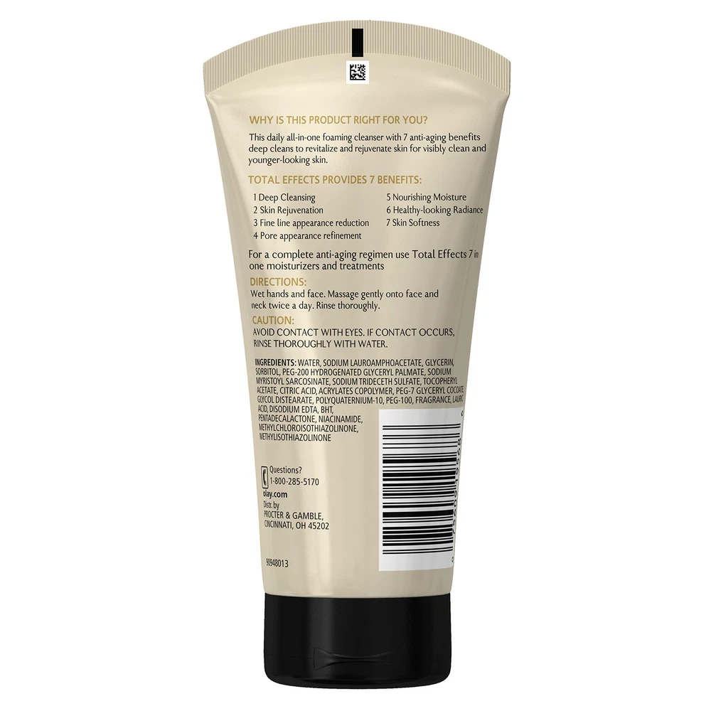 Facial Cleanser by Olay Total Effects Revitalizing Foaming Face Cleanser, 5.0 Features Daily foaming face cleanser that revitalizes skin for a rejuvenated clean Cleanses to remove dirt and impurities to revive skin Replenishes moisture, softens skin and enhances brightness Multitasking formula helps fight 7 signs of aging, including the look of fine lines and pores Suitable for most skin types: dry, normal, oily, combination/oily Fast and Free Shipping You're already purchasing the item. Why pay additional for shipping, especially slow shipping? We get your order shipped out within 1-business day and delivered to your doorstep as quickly as possible. Competitive Pricing With our dynamic pricing model, our prices are always competitive. Our prices are some of the lowest that you will find on the internet. Rest assured that you're getting a good deal when purchasing with us. 30-day Money Back Guarantee We are committed to making sure that you leave this transaction satisfied. If you're unhappy with the product for any reason, you may return it back for your money-back or a replacement within 30 days. No questions asked!