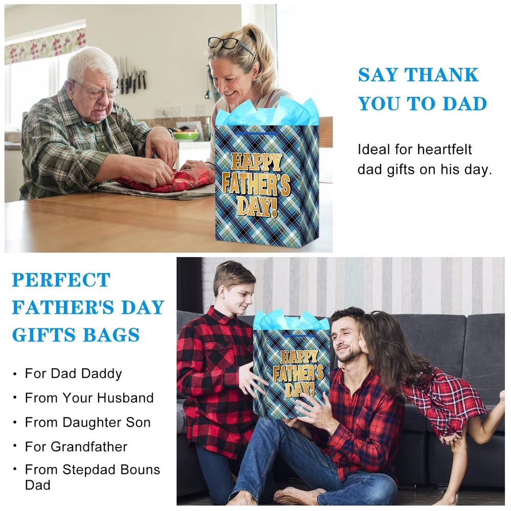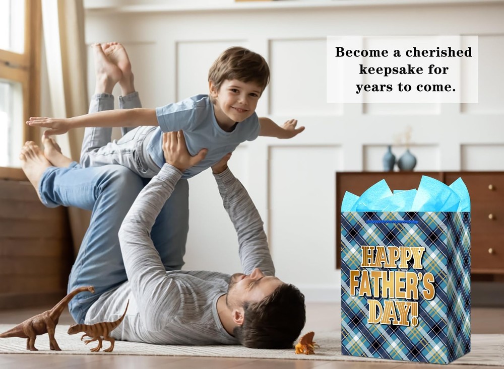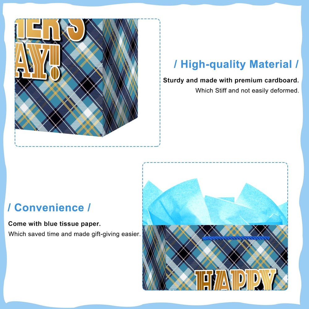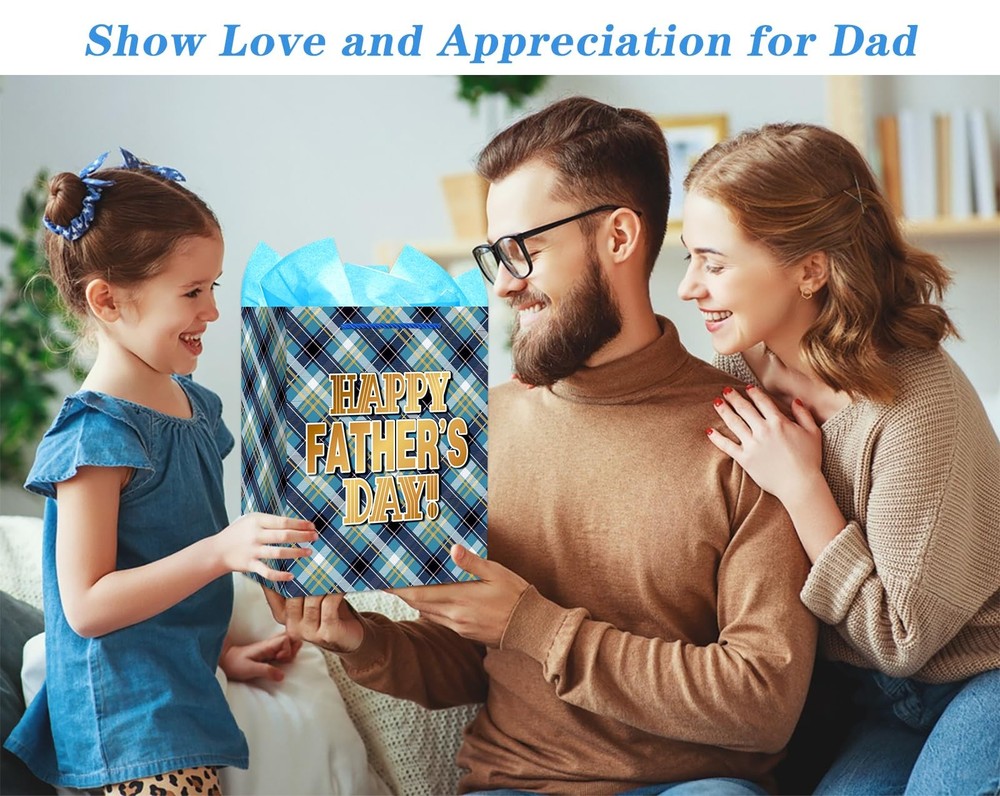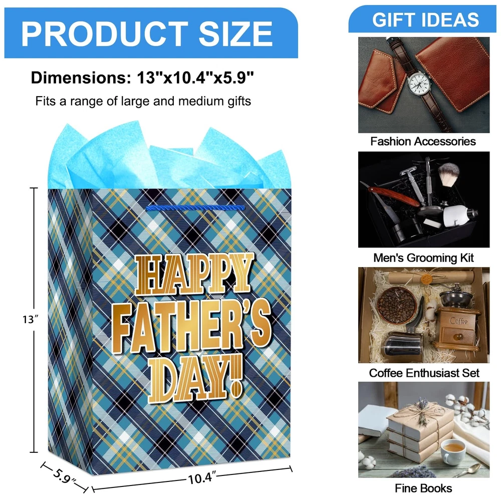 Product Page FaCraft Fathers Day Gift Bag - 13" Large Happy Fathers Day Paper Gift Description: Features: Effortless Gift-Giving: With a "Happy Father's Day" design perfectly capturing the spirit of the holiday, this fathers day bags adds a personal touch to your gift. No wrapping required—just place your gift inside and present it with ease. Sturdy & Reusable: Happy fathers day gift bag made from sturdy cardstock and featuring a strong jute rope handle, this gift bag is built to hold gifts of various sizes and weights. Plus, it's reusable, making it a practical and eco-friendly choice. Ideal Large Size with Elegant Presentation: Happy father's day gift bag measure 13"x10.4"x5.9", this large-sized bag is perfect for a wide range of gifts. The matching blue tissue paper enhances the presentation, giving your gift an added touch of ceremony. Ideal for All Givers: Whether you're a wife shopping for your husband, a kid selecting a gift for dad, a grandchild presenting a gift to grandfather, or a friend looking for stylish packaging, this happy father's day gift bag suits everyone. Also ideal for new fathers celebrating their first father's day. Unique Keepsake Value: Elevate any father's day celebration with a gift bag that adds special value to the occasion. Ideal father's day gifts for dad, stepdad, grandfather, or husband, this gifts wrap bag makes your gift more memorable and meaningful.