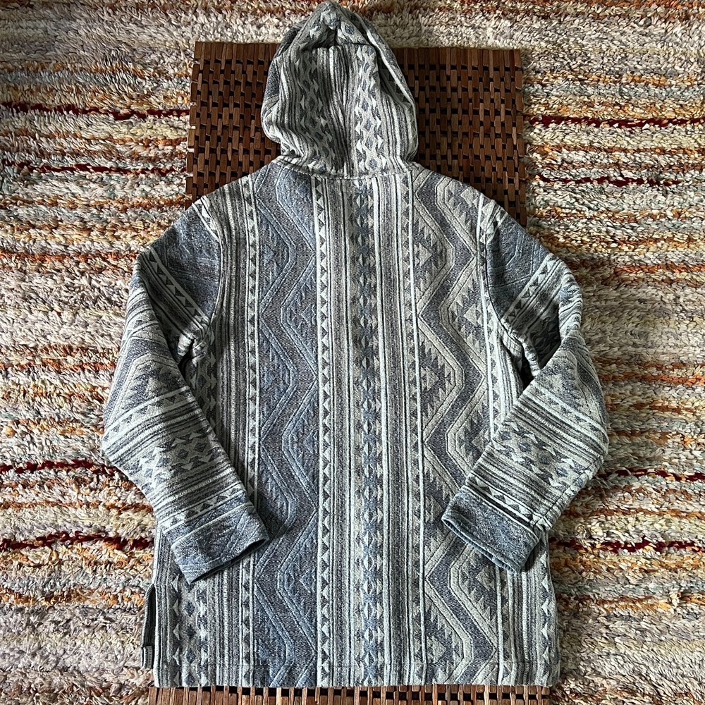 The Faherty Brand Aztec Print Henley Hoodie in Grey Blue is a stylish and comfortable men's size medium hoodie. Made of cotton knit fabric, this hoodie features long sleeves, a drawstring closure, and a hooded design. The Aztec print adds a unique touch to the pullover style, making it a great choice for the winter, fall, and spring seasons. Perfect for casual wear and walking activities, this hoodie by Faherty is a versatile addition to any man's wardrobe.