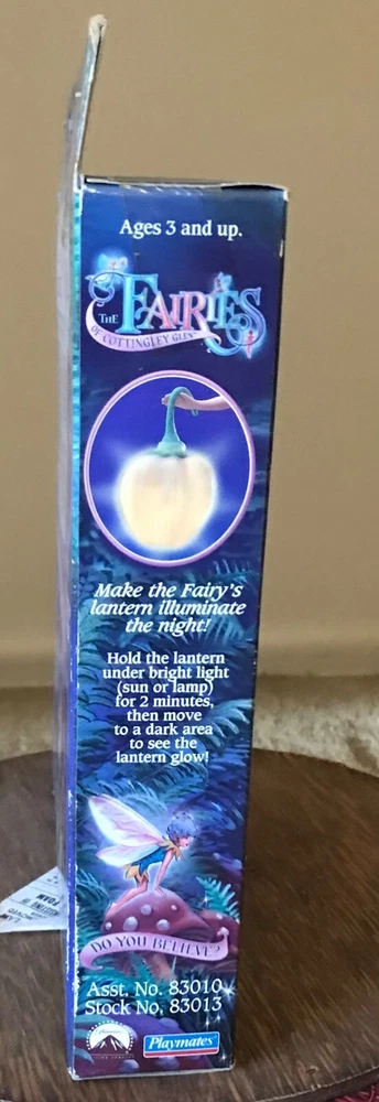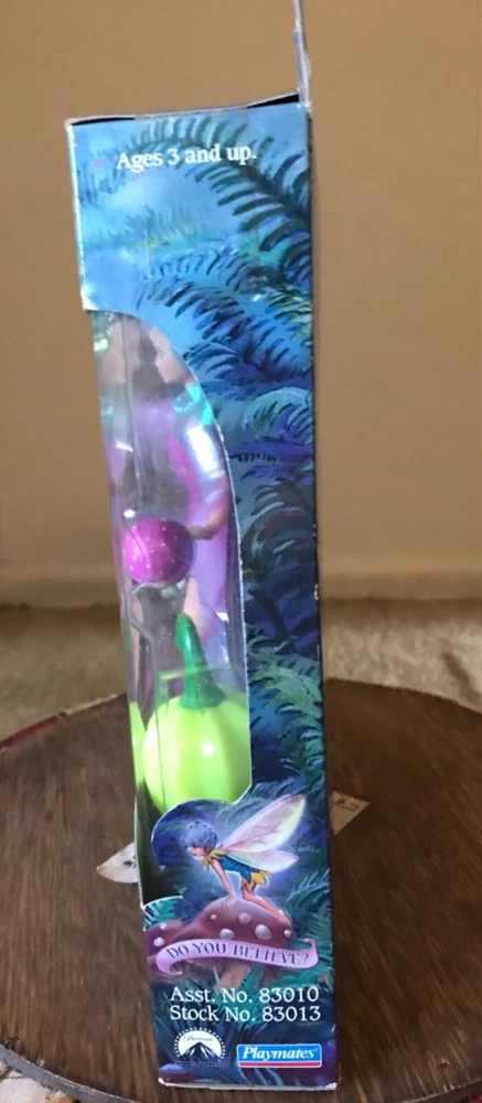 This Princess Florella doll from the Royal Collection of the Fairies of Cottingley Glen is a perfect addition to any vintage doll collection. With her purple hair and blue eyes, she is a stunning 6-inch figure made of vinyl and plastic. The doll comes with a set of 5 pieces and is an original, licensed reproduction from Playmates Toys. This figure is part of the playmate toys product line and is perfect for collectors or for children who love fairies. The doll's complexion is light, and she is dressed in a beautiful gown fit for a princess. This is a must-have item for anyone who loves vintage dolls or the Fairies of Cottingley Glen franchise. The toadstool still plays it’s enchanting melody!
