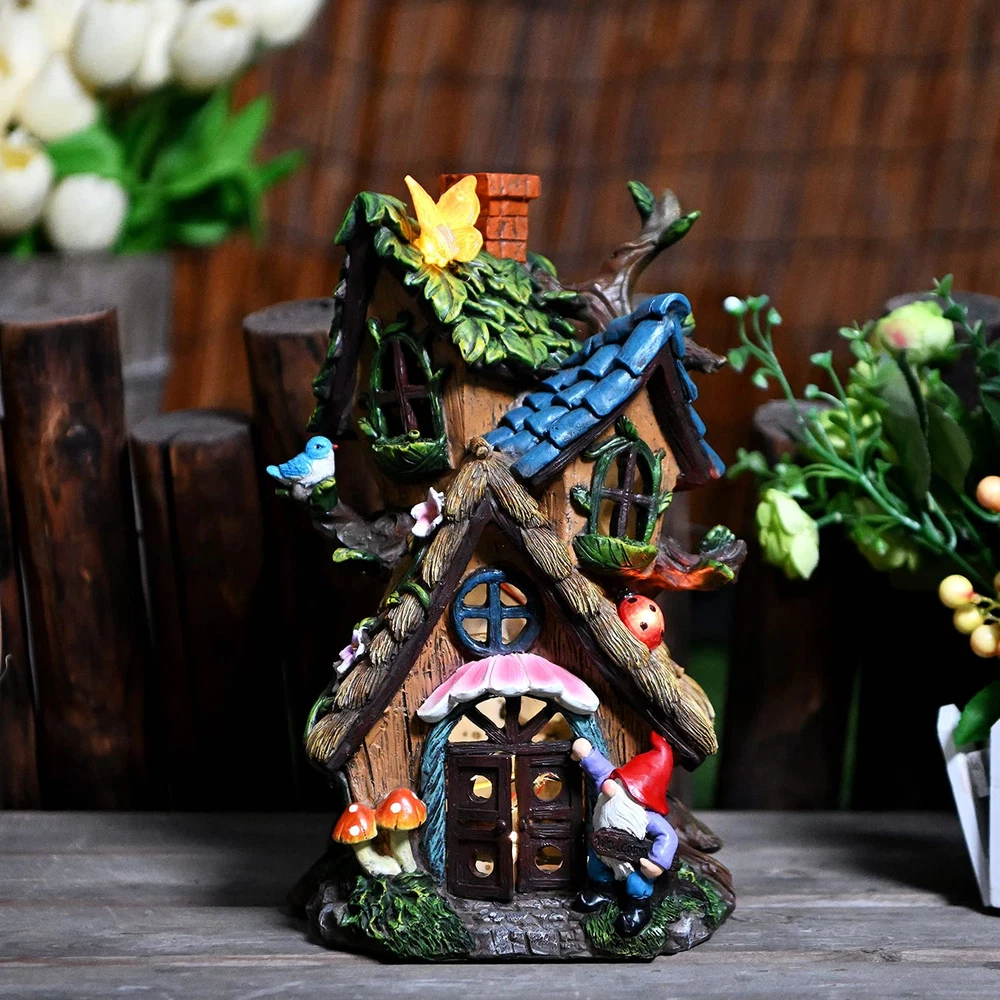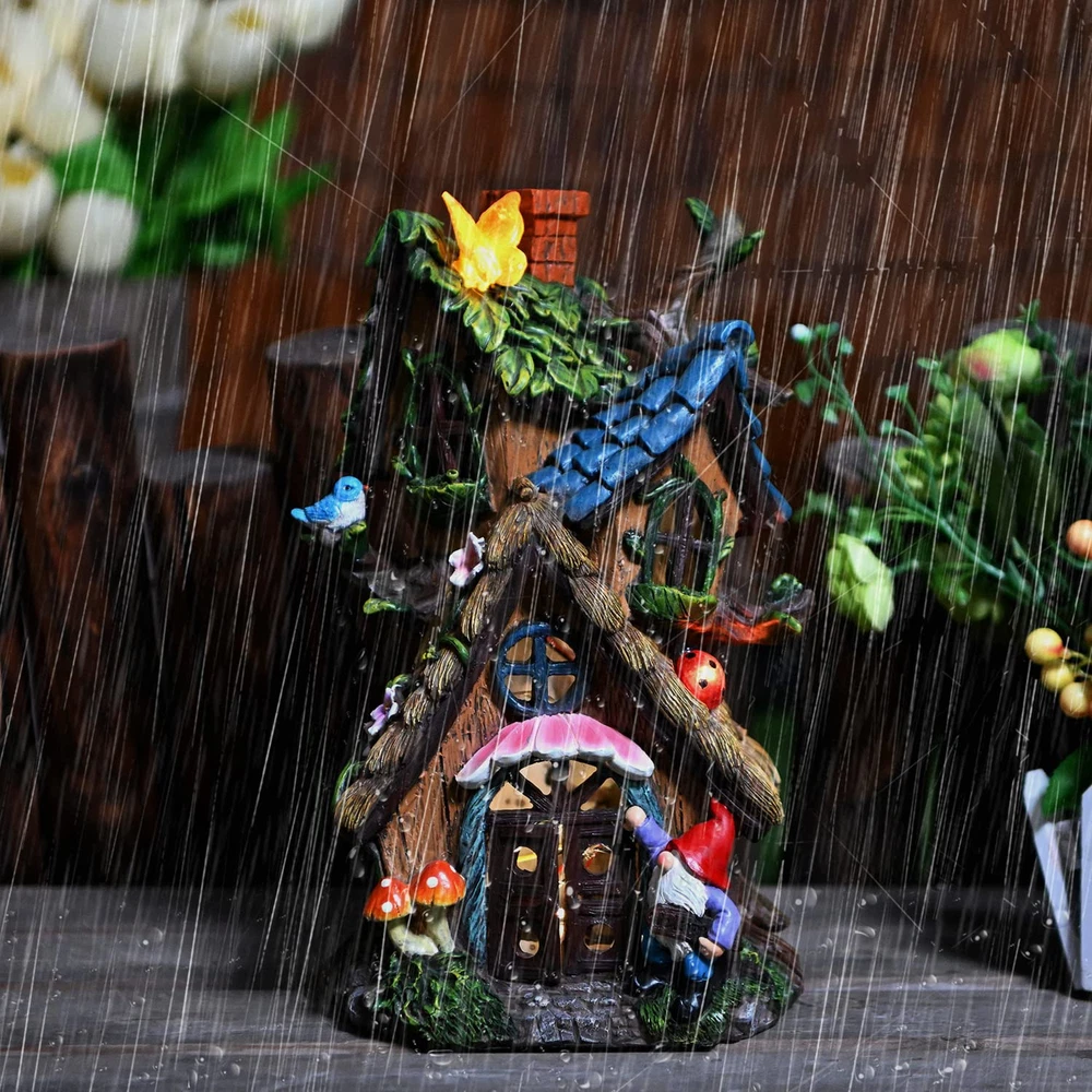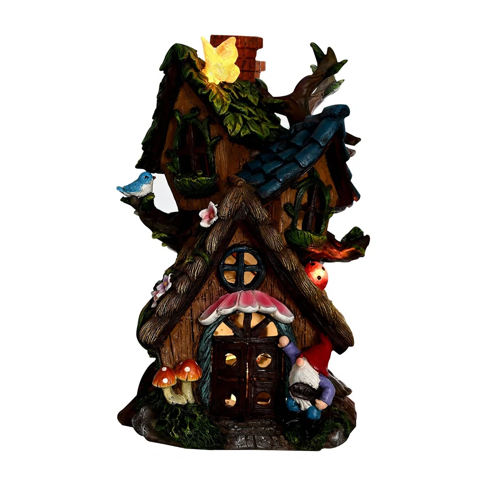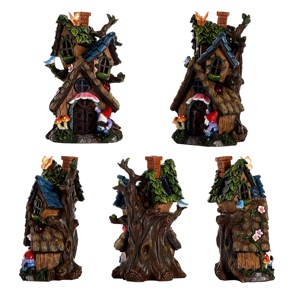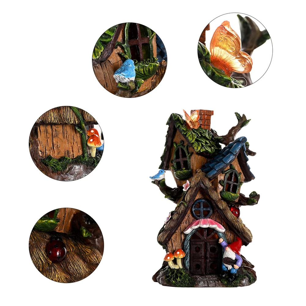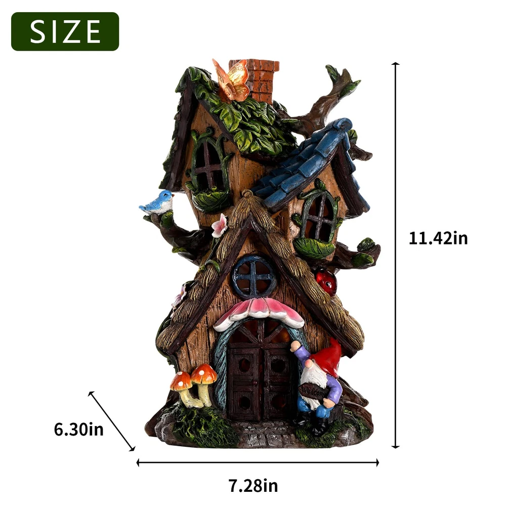 【EXCELLENT DESGIN】:Inspired by fairy tales,the mystic fairy house with garden gnome, bird and butterfly flying around, ladybug crawling on the branch, mushrooms growing at the wood door, the colorful roof is covered in tile and tree branches. is a great addition to your garden, yard, patio, lawn or indoor. Turn on the solar light at night, soft and warm light reveals from the tree house window, creating a whimsical miniature wonderland! PERFECT GIFTS:The fairy garden tree house is 11 Inch,act as a surprise gift for your family, friends and fairy lovers on Christmas,Thanksgiving, Halloween, Birthdays and Housewarming.They will be satisfied with vivid design and well made details. HIGH QUALITY:The fairy garden figurine with a funny gnome,made of sturdy resin and hand painted with UV resistant paint. Exceptional craftsmanship protect against rain, snow or scorching sun EASY TO USE:No wiring is required. Turn the figurine on and leave it in the “on” position during the daytime. The solar panel charge during the daylight and light up automatically at night. The LED lights charge within 5-8 hours and light up for 8-10 hours. Eco-friendly and save energy. BUY NO WORRIES: Any issues with the fairy house statue, please feel free contact us. We offer friendly customer service.