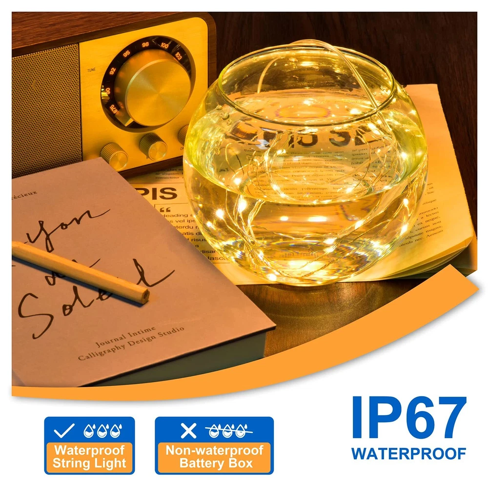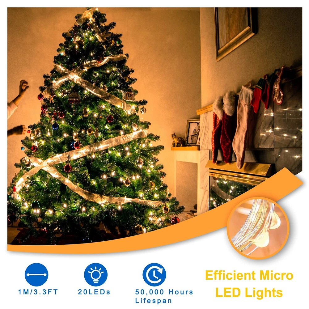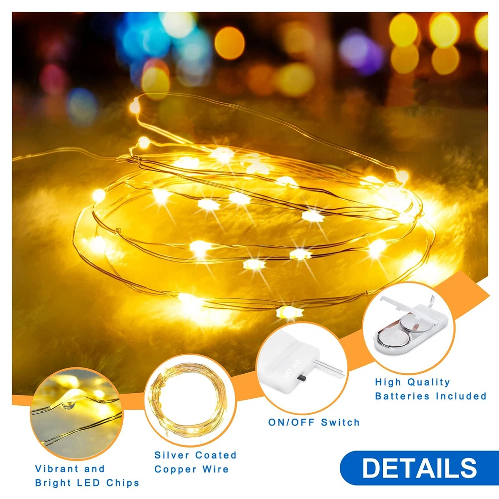 Fairy Lights Battery Operated:7 feet extra thin string lights with vibrant bright high quality 20pcs micro LED starry lights, which is battery powered by 2xCR2032 lithium battery (preintalled). The 2.95*0.9 inches slim battery pack is easy to hide, the mini size is effortless to hide in your design work Safe & Easy Operation: The silver wire firefly lights are low power and insulate heat, remain safe to the touch. Turn it on or off easily through the On/Off switch on the battery box; open the battery box without any tools to replace the batteries when the lights get dim Waterproof Flexible Silver Wire: Our 20 LED mini fairy lights are made of high quality flexible silver-plated copper wire. It is easy to bend it to any shape or wrapped it on anything you want like jar, wreaths, trees, plants, flowers, weddings décor. The fairy string lights is waterproof IP65 and can be used indoor and outdoor without any worry of moisture or weather damage or short circuit. Only the LED and brand are waterproof, except the battery pack Wide Application: The festival led decorative lights are great to increase fantastic holiday atmosphere, for a home party, birthday, wedding centerpieces, Valentine's day, outdoor dinner, and decorating your kid’s room, Christmas trees, flower shop, bright dome umbrella, or designing any other unique lighting projects. It is perfect to decorate your handiwork and crafts What Will You Get:6 Pack Copper Wire LED String Lights.Ours premium LED lamp can last 50,000 hours under regular use (the battery life is 48 hours if you keep using). If you have any questions, please ask us for helps