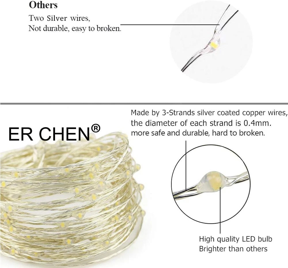 Store New Arrivals Add to Favorite View Feedback Contact Fairy Lights Plug In, 33Ft/10M 100 LED Silver Coated Copper Wire Starry String Lights Outdoor/Indoor Decorative Lights for Bedroom, Patio, Garden, Party, Christmas Tree (Warm White) Description Light Source Type LED Style Modern Power Source Corded Electric Item Dimensions 5 x 2.68 x 2.99 inches Number of Light Sources 100 Material Type Copper Wire Theme Christmas Style Number ED0311NW-US Controller Type Remote Control Occasion Type Christmas Seasons Christmas Additional Features Dimmable, Waterproof Included Components String lights and power adapter Indoor/Outdoor Usage Outdoor, Indoor Control Method Touch Light Color Warm White Water Resistance Level Waterproof Item Weight 0.3 Pounds Connectivity Technology Power Cord Occasion Christmas Special Feature Dimmable, Waterproof Color Temperature 2700 Kelvin Color Warm White Wattage 12 Watt-hours Indoor Outdoor Usage Outdoor, Indoor Voltage 110 Volts Style Name Modern Size 33Ft 100LED 【Quality Assurance】Each product of ER CHEN has been through rigorous testing before shipment. If there is any problem after receiving the product, you can immediately, and we will offer you a free . 【Consistent Brightness】This LED starry string lights have 100 super bright LED lights on 33 feet (10 meters) long ultra flexible copper wire with 4 inches distance between each LED bulbs, and without voltage drop, the brightness is steady and consistent. 【Flexible, Durable & Waterproof】Made from high quality 3-Strands silver coated copper wires, this fairy light is durable enough to experiment with any shapes as you like. The copper wire parts of the string lights have IP65 waterproof level which is perfect for both indoor and outdoor decorations.(Warm Tip: The power adapter is non waterproof, it should be covered if used in rainy days) 【Safe to Touch】String lights are enameled copper wire with low current, which ensures that the copper wire is insulated and won't be overheated. After many hours of continuous work, you can still touch it safely. 【Certification and Warranty】High-safety power adapter is guaranteed with UL/FCC certification, and the string lights possess FCC and CE certificates and meet environmentally-friendly RoHS. We provide you with 12 months' warranty, 60 days Money and 24hrs Customer Service. Product Description Features: *ER CHEN LED Warm White copper string lights create a warm and cheerful atmosphere in any corner you want to decorate. *The copper light string is made from high quality 3-Strands silver coated copper wires. It's flexible and durable, easy to be bended into any shape that you desire around plants, signs, furniture and almost everything else. Just start a fun and easy DIY light decorative game with your family and friends! *It can be used easily, just untie the strings and twine them to the things or places you want to decorate, and then insert the plug. Ideal for any kind of home décor, Valentine’s Day, wedding, Halloween, birthday parties, anniversaries, Easter, DIY crafts and more! . All Occasions: Use for wreaths, decorative trees, weddings,baskets and so on. Beautify your patio, deck, front porch etc. Can be wrapped around almost anything, i.e. stairs, tables, chairs, balcony, or bedroom, anywhere you can imagine. Technical Specifications String Length: 33ft/10m / Adapter cable length: 4.9ft/1.5m LED Quantity: 100 LEDs / Lamp Spacing: 3.94in/10cm Power Adapter Input: AC100-240V 50/60Hz Power Adapter Output: DC 12V Wire Wire Color: Silver Color / Material: Copper Wire NOTES: 1. The string light could NOT be extended or connected with other string lights. 2. Do NOT apply excessive force or repetitively bend the same spot. Excellent Safety *12V Low Voltage UL/FCC Listed Power Supply - The fairy lights supply with a really safe DC12V low voltage adapter (plug) for use in your home, totally safe for your family. *Energy Efficient LEDs - 6W for 100LEDs, cost effective and energy efficient, no overheating after long hours of usage. *Safe to Use - The copper wire of this string light is enamel coated, making it well-insulated. Please feel free to use them as the twinkle lights for bedroom. SURVIVE IN THE WINTER It's available to work between -20-60 degree centigrades, let the lights add some colors for your winter holidays. WATERPROOF The light strings are IP65 waterproof, but the power adapter is not waterproof and should be used with waterproof receptacle cover when used outdoors. PACKAGE INCLUDES 1* 33ft 100 LED String Light 1* US adapter with UL/FCC certification. ABOUT US We offer the best prices around on high quality products. Our E-store includes media such as books, movies, music and games while offering electronics, toys, sporting apparel, clothing, tools, general home, garden items and more. SHIPPING We are always working hard to ensure your package arrives as soon as possible. Please understand that some factors like weather, high postal traffic, and the performance of shipping companies are outside of our control. We offer free shipping to the lower 48 states and ship within 2 business days of payment, usually sooner. We do not accept P.O. Boxes. Please provide a physical address. For shipping outside of the continental USA, we only use eBay's Global Shipping Program.The item is shipped to KY and then sent to the rest of the world. International customers are responsible for all duties and taxes. Continue to check out in order to calculate costs for shipping the item to your country. Messages regarding eBay's Global Shipping Program MUST be directed at eBay EXCLUSIVELY. RETURNS We offer a 30-Day Return Policy on items which you are not completely satisfied with. You have the option for a full-refund or an exchange of the item. No returns are available on items shipped outside of the USA. PAYMENT We accept PayPal. CONTACT US This page content is yet to come Please ad us to your favorite seller and visit again later Thank You CUSTOMER SATISFA