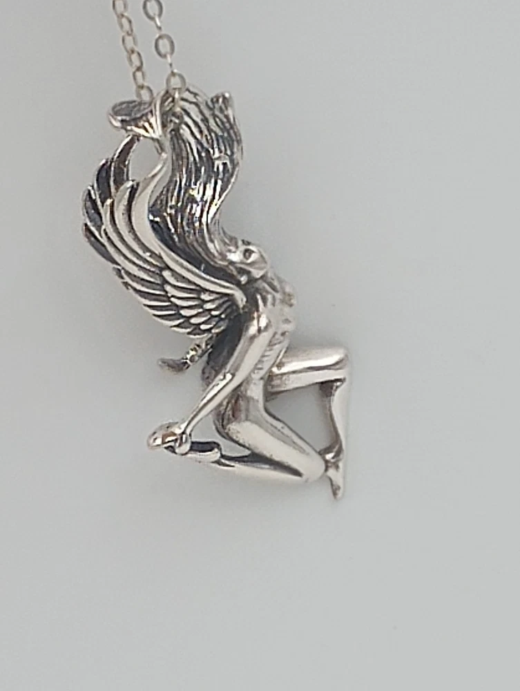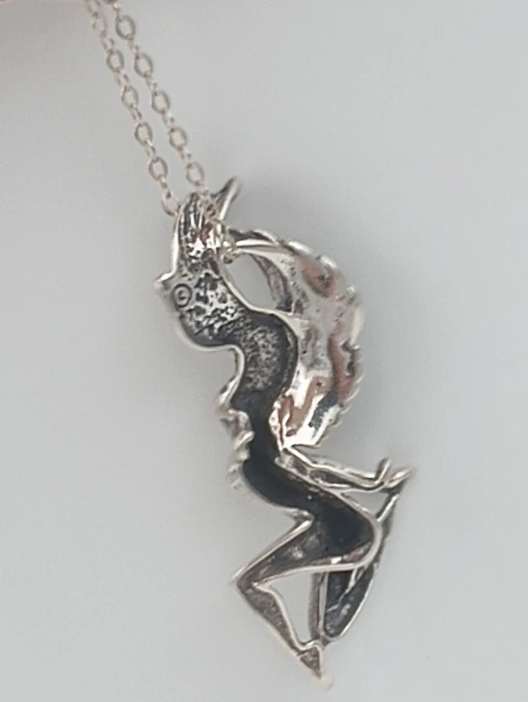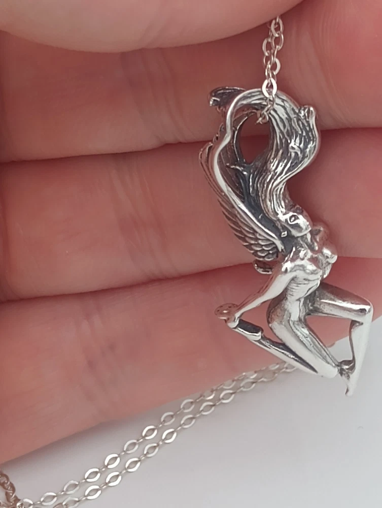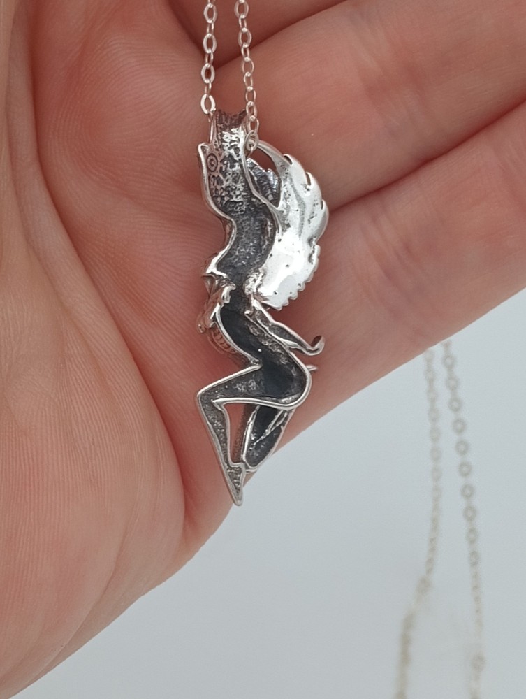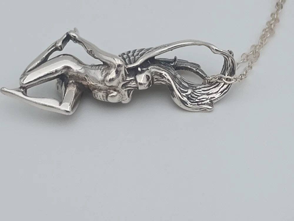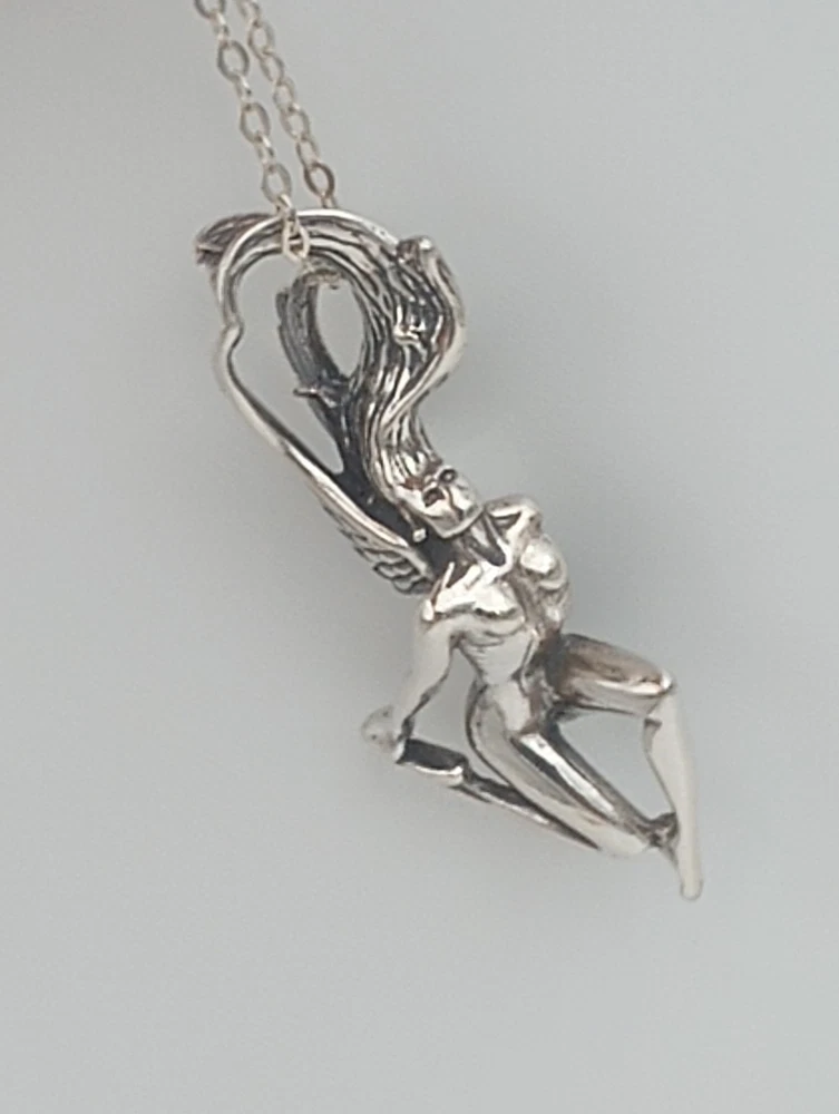 The fairy necklace features a nude fairy pendant made of sterling silver, with a metal purity of 925. The elegant design of the pendant showcases intricate details of a fairy, making it a unique and whimsical accessory. Perfect for those who appreciate fantasy and mythology in their jewelry choices, this necklace adds a touch of magic and charm to any outfit. Hello; you can request a 16" or 18" chain. Pendant is made in USA/chain is made in Italy You will receive what is shown in the photos.
