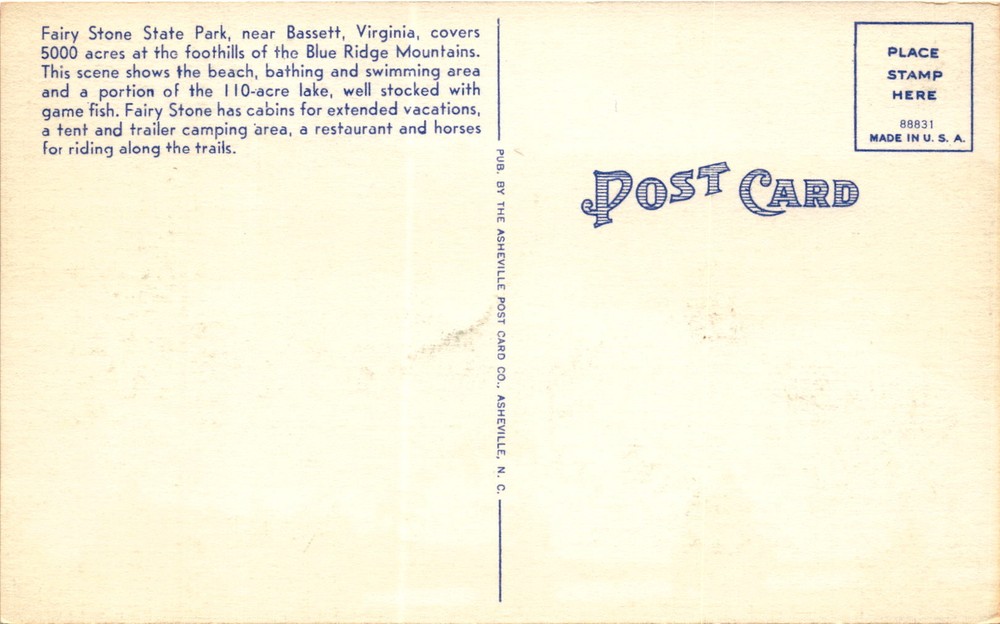 MAKE AN OFFER. THE MORE YOU BUY THE BETTER DEAL I WILL ACCEPT Fairy Stone State Park in southeastern Virginia covers 5000 acres at the foothills of the Blue Ridge Mountains. The park features a 110-acre lake with a bathing beach and swimming area, as depicted in the postcard. The lake is well stocked with game fish, making it a popular spot for fishing enthusiasts.