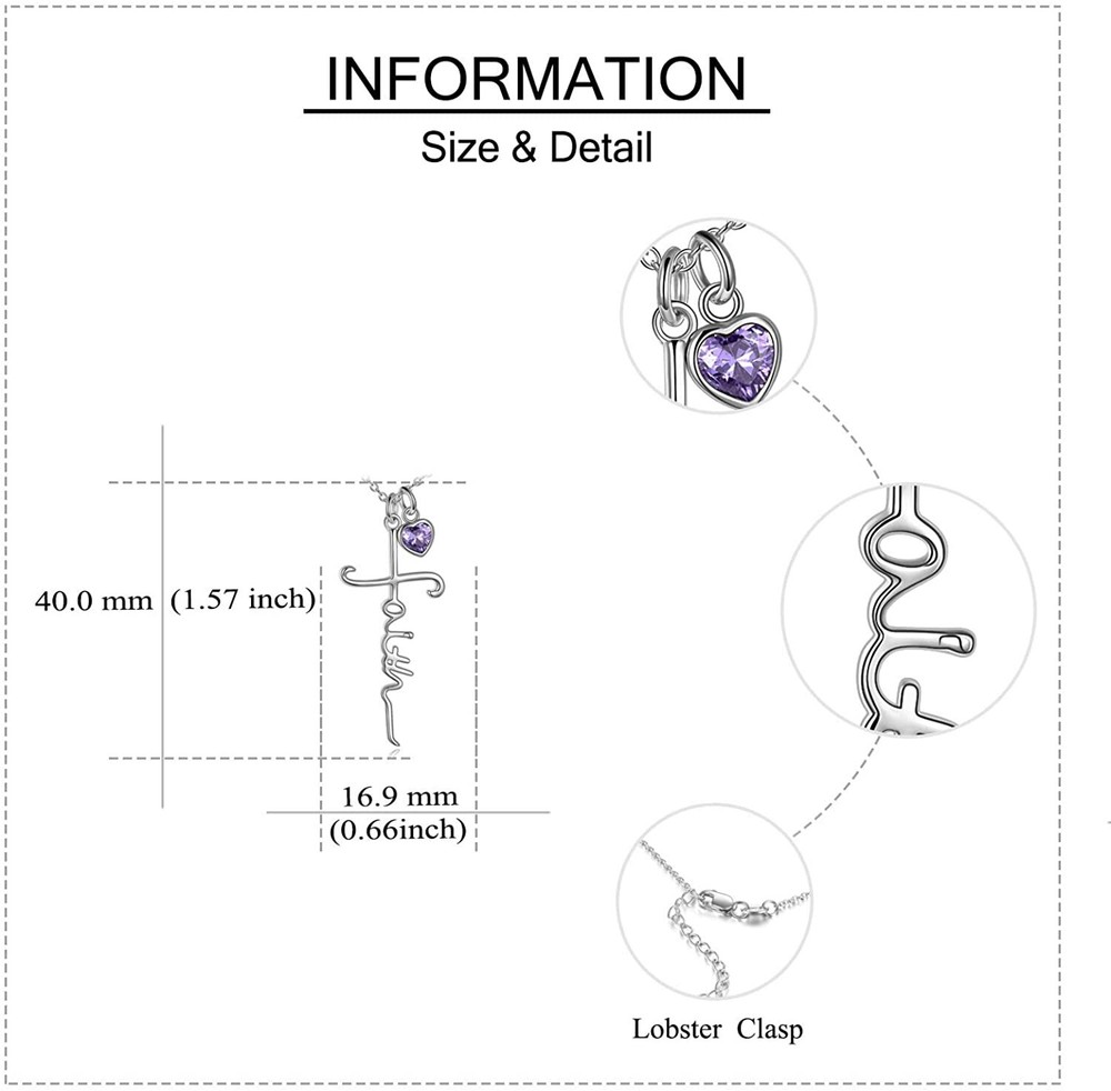 ebay template Faith Cross Necklace for Women Birthstone Sterling Silver with Simulated Birthstone Cross Jewelry Christian Gifts Product Specifications: ♓ Faith Cross with Created Amethyst Necklace--February Birthstone ♓ This faith cross necklace reminds you the strength of Faith Hope Love and Believing for God. Amethyst is the birthstone for February. The birthstone in February symbolizes sincerity and security, spirituality and contentment. This faith cross necklace will be a nice gift for yourself or your lover. ♓ Material Type ♓ This faith cross with Created Amethyst pendant necklace is made from Hypoallergenic real 925 sterling silver and Simulated Birthstone, Nickel-free, Lead-free, Cadmium-free. Long Time Wearing Keeps You a Good Health. ♓ Suitable To Wear ♓ The size of faith cross pendant is 17.1mm*40.6mm(0.67inches*1.6inches), the length of 1.2mm O chain is 18inches chain. ♓ GREAT GIFT IDEA ♓Whether its a birthday, a special occasion or just a ordinary day, jewelry is always a nice gift choice. This Faith Cross Necklace comes with a gift box, It's very suitable as Hannukah, Mothers Day, Valentines Day, birthday gifts for yourself or for anyone you loved. ♓ 100% SATISFACTION SERVICE ♓ We aim for 100% customer satisfaction. If there are any problems with unique faith cross necklace, please feel free to contact us first. We will help you within 24 hours,thanks for your support,and we sincerely hope this cross gifts could bring you good luck all day product description: Package information 1 x Faith Cross Necklace 1 x Necklace Box How to maintain Keep silver jewelry clean and dry. Silver jewelry should be placed in a sealed dry place when not in use. Best not to wear when taking a bath or swim. Regularly wipe the surface with polishing cloth. Jewelry Information Brand, Seller, or Collection Name UCADRIT Metal stamp 925 Sterling Silver Metal Base Material Metal Gem Type not known Setting Other-Setting-Type Pearl Information Surface markings and blemishes Clean Not Known Information Minimum color Amethyst Stone Creation Method Simulated We are always updating our catalog with new and exciting products. Keep visiting our store for new products and deep daily discounts.